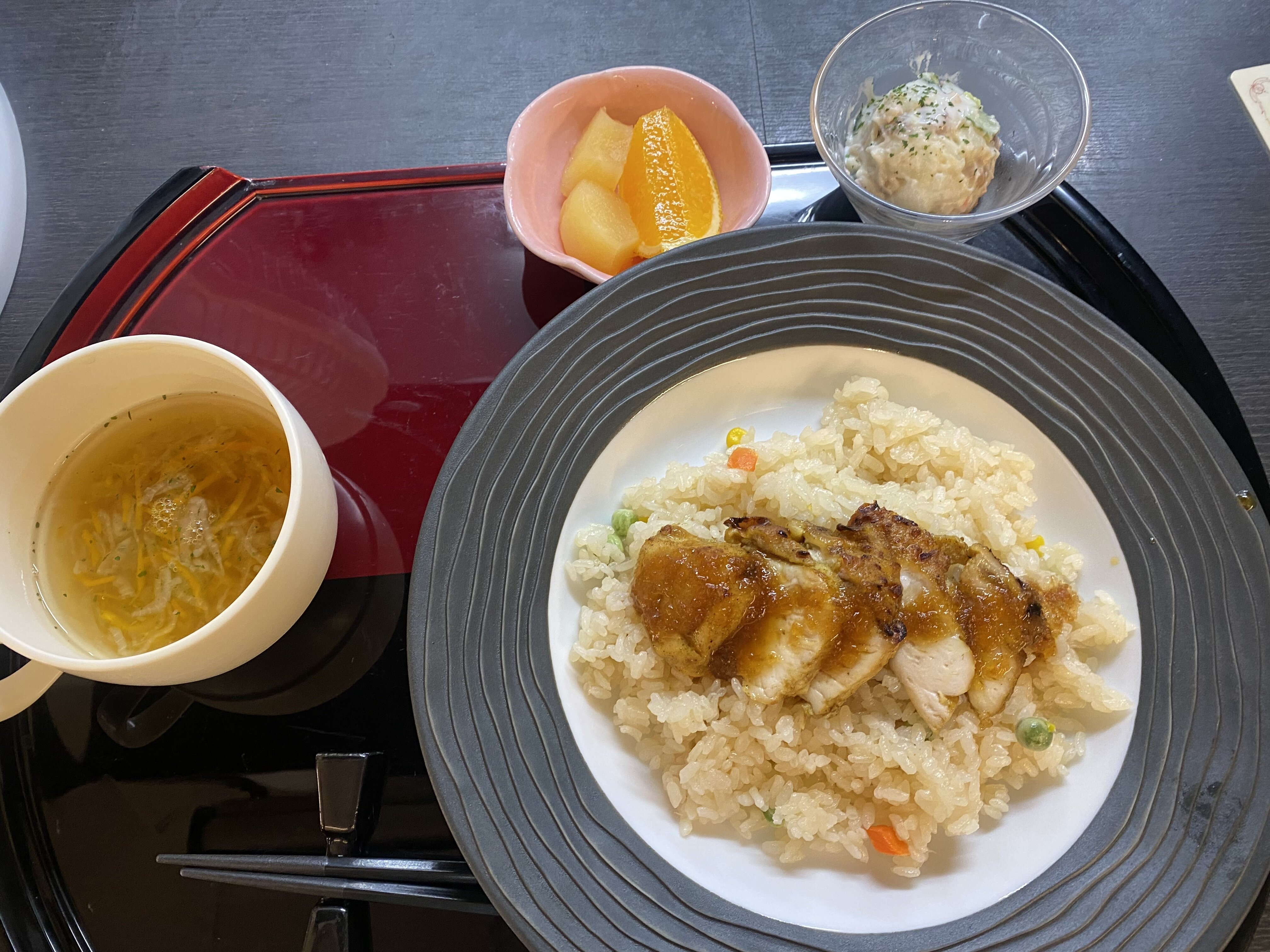 ピラフの上ににスパイシーなカレーソースがかかったチキン、