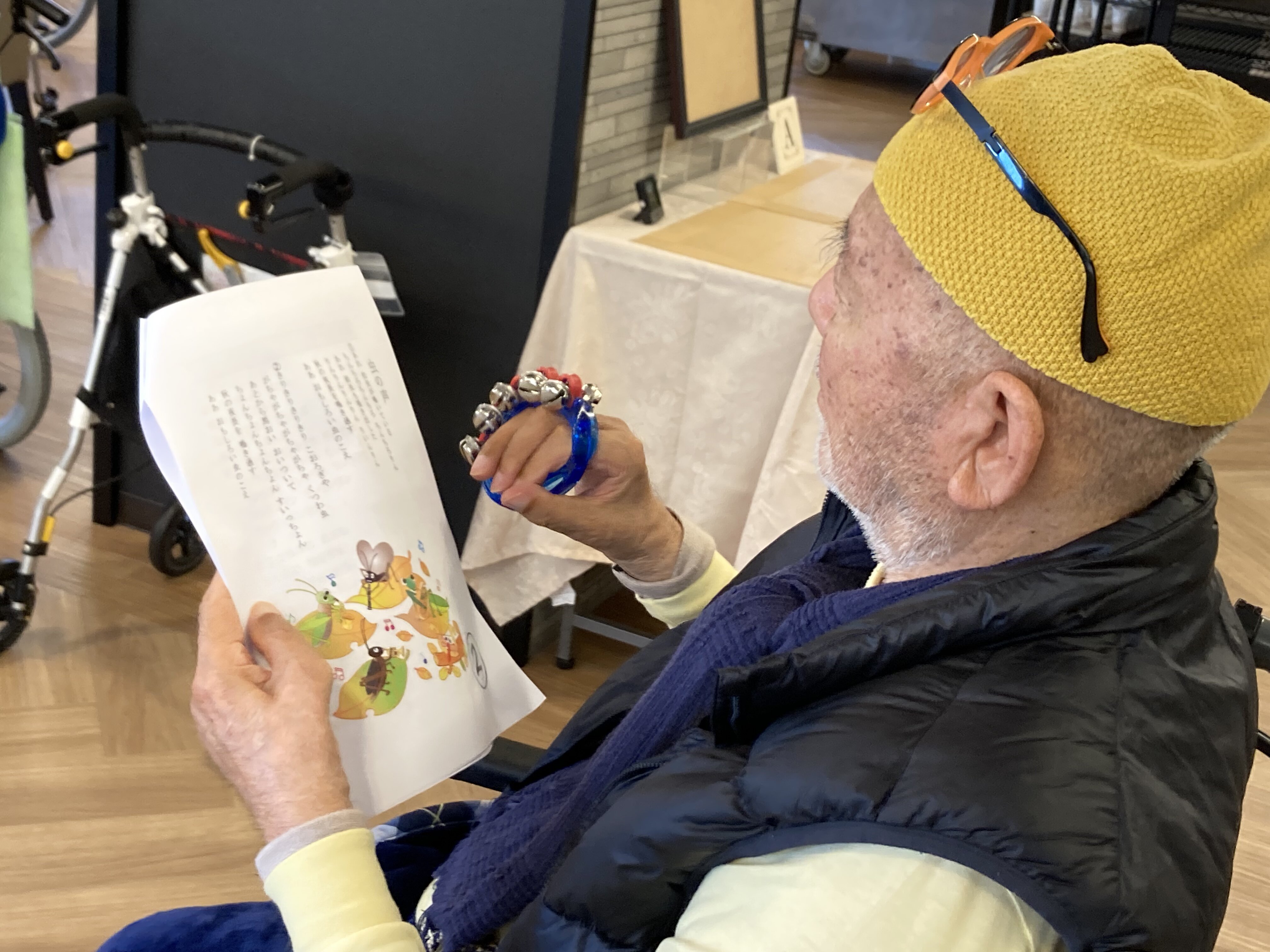 ♪虫の声ではみんなで鈴やタンバリンをもって楽器演奏もしました!!