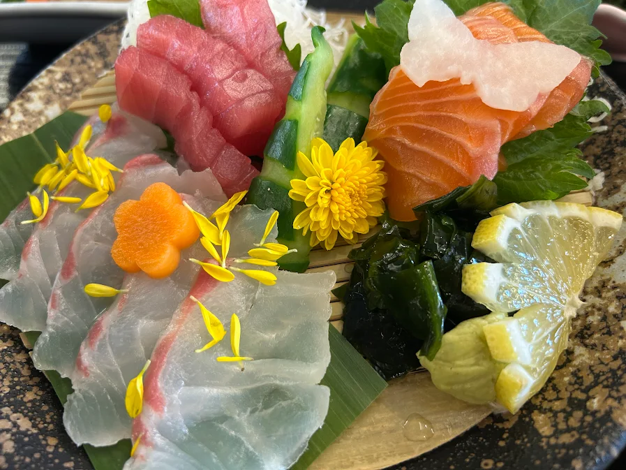 お皿に盛られているお造りは、まぐろ・鯛・サーモン。