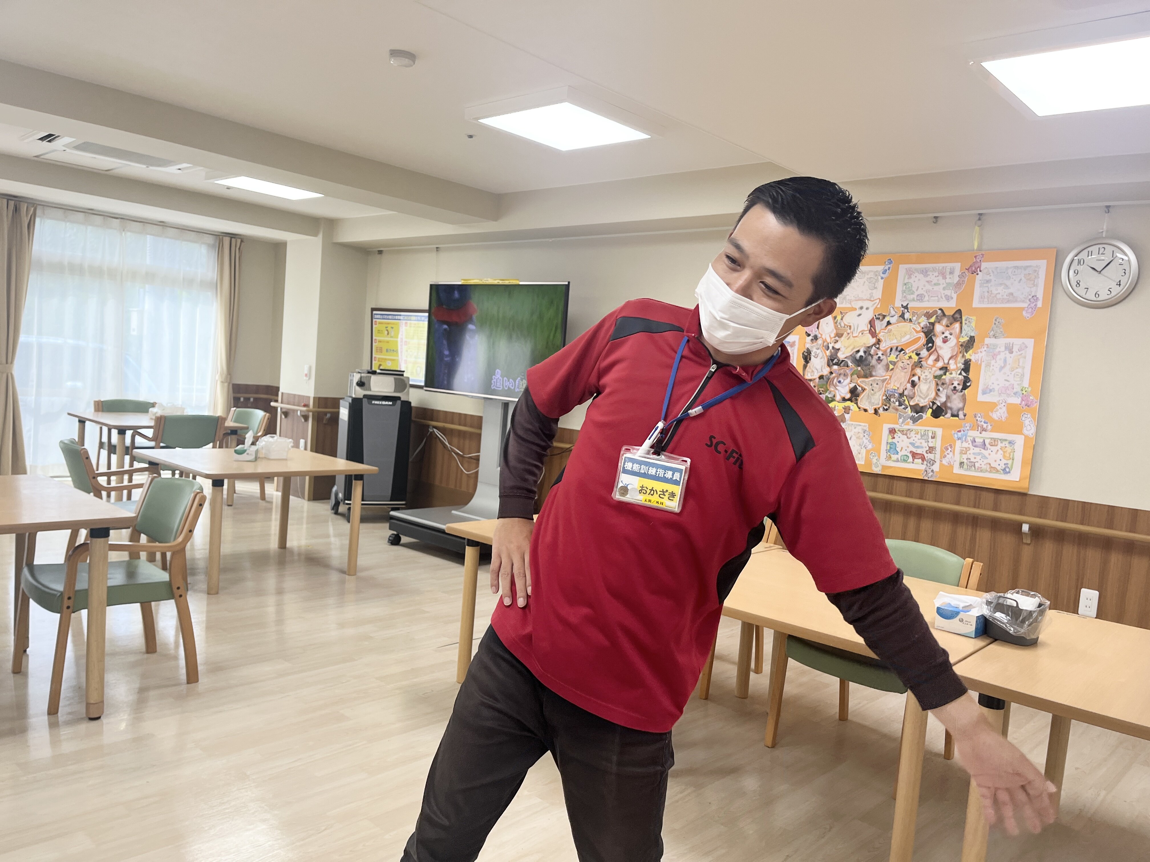 皆様、こんにちは。今日も食堂を覗くと「チェアリズム体操」が開催されていました。その様子をパシャリ!!