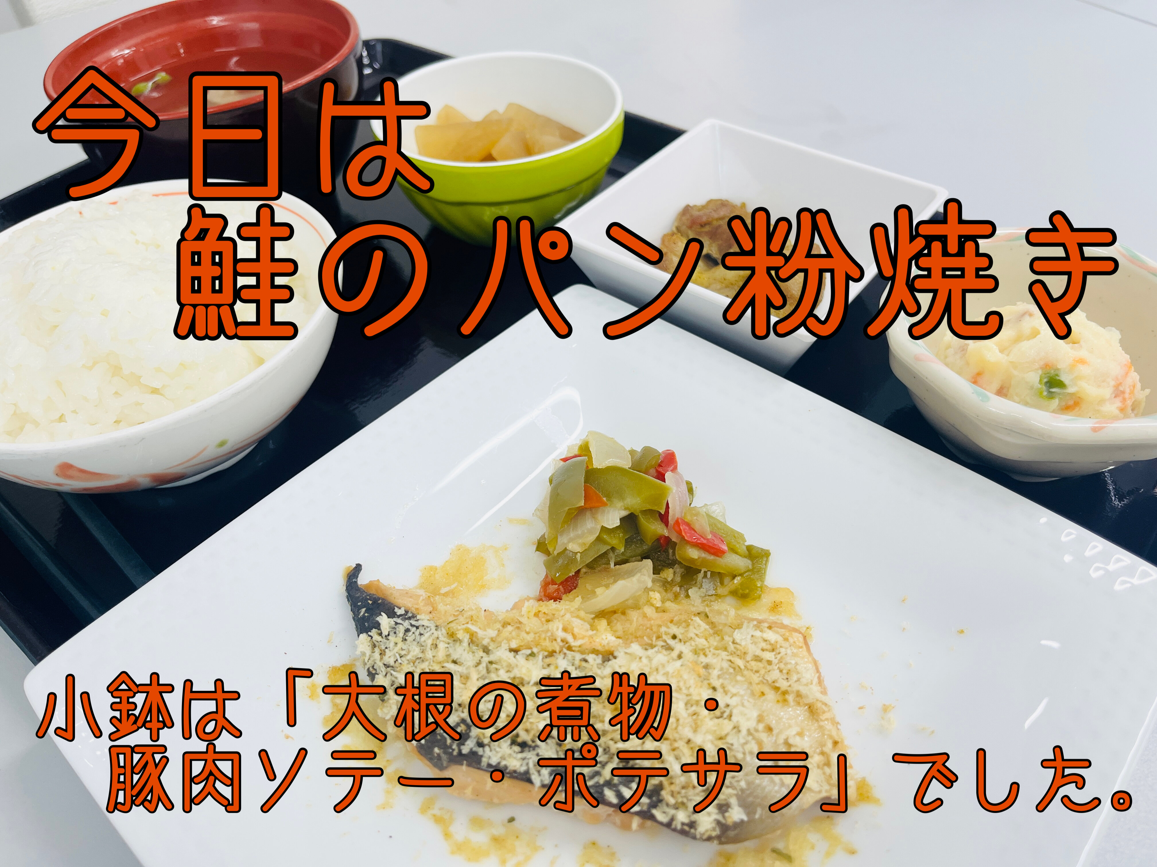 皆様、こんにちは。最近は、寒暖差が激しいため、体調管理が大変だと思いますが、体調を崩さないように頑張りましょう。さて、今日のお昼ご飯ですが「鮭のパン粉焼き・小鉢3品」と豪華メニューでした。次回もお楽しみに。