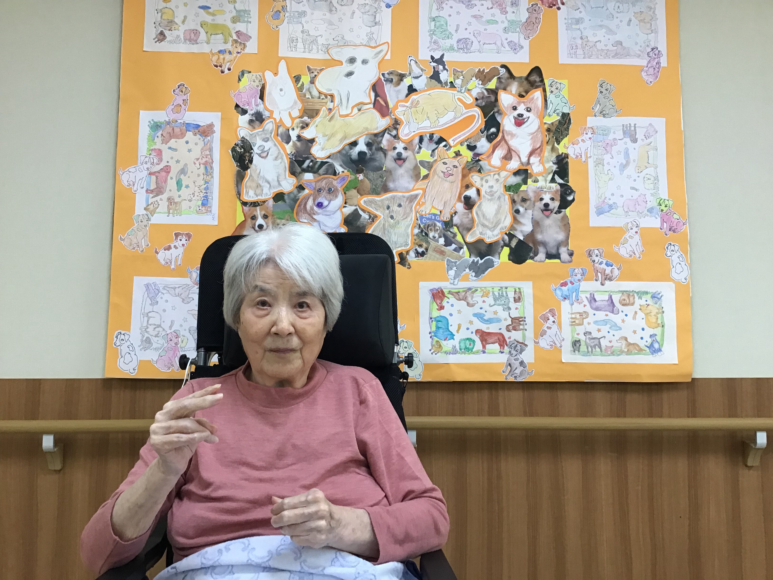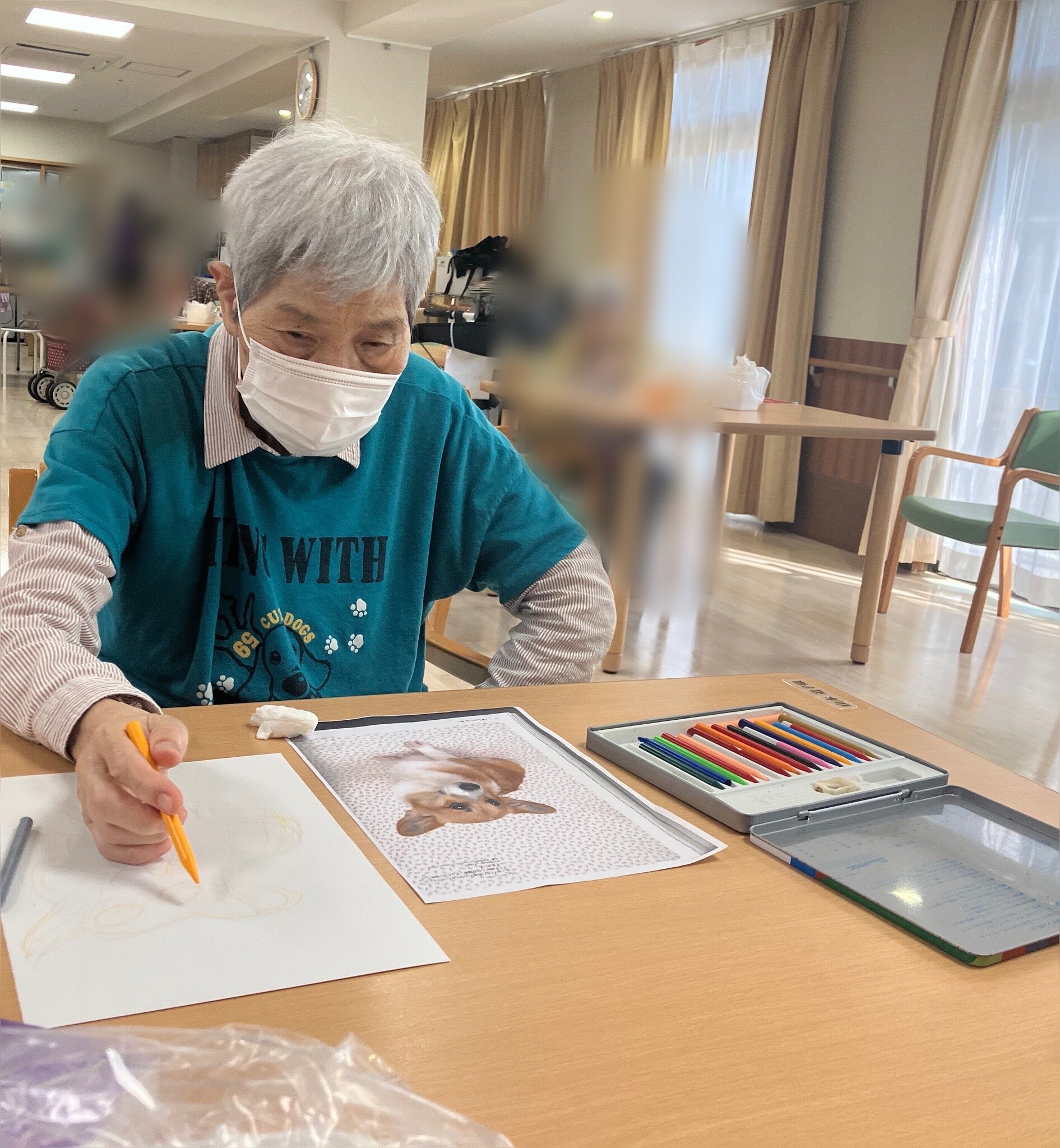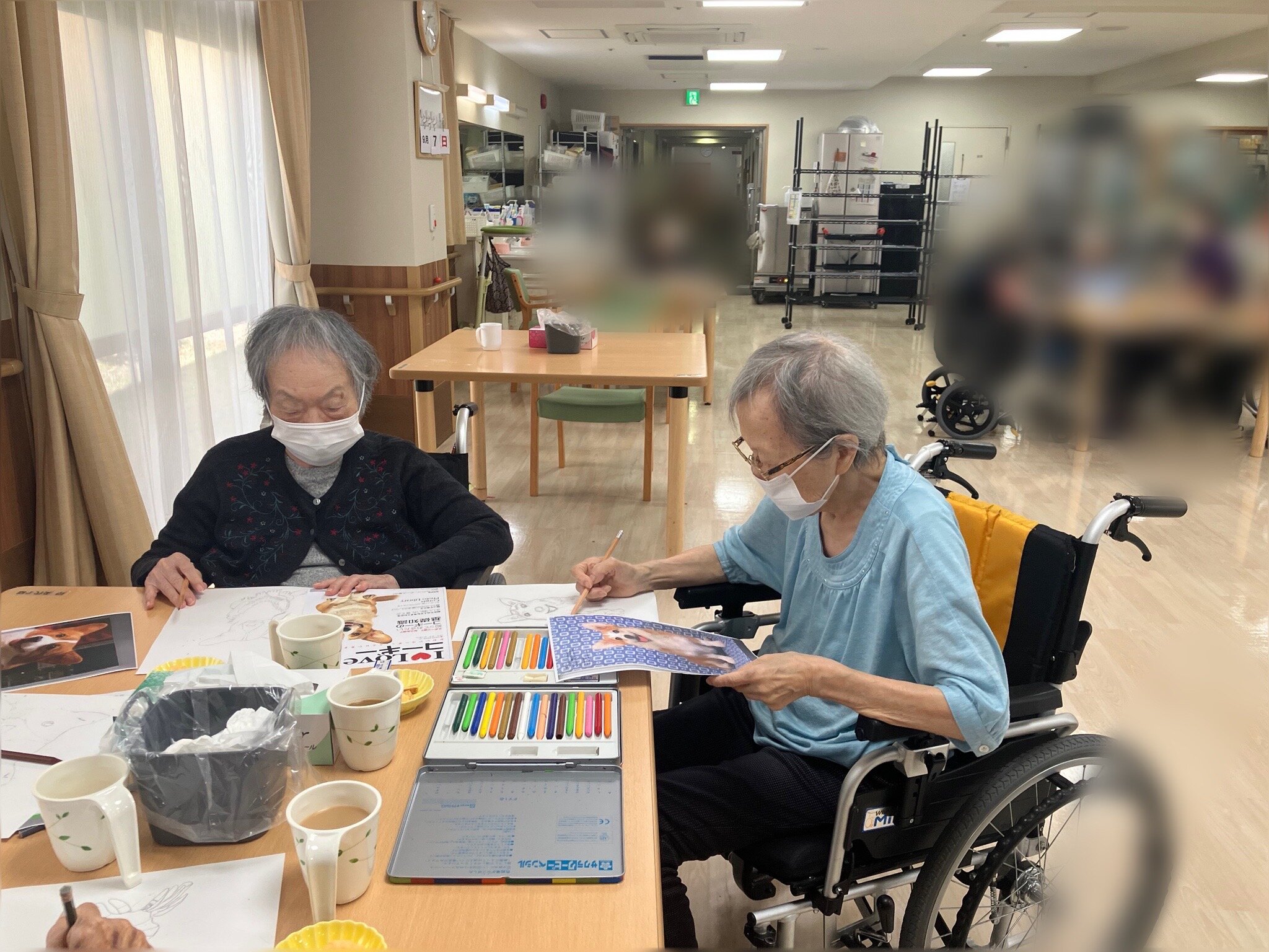 皆様 、こんにちわ。毎月、テーマを決めてご入居者の皆様で【壁紙作成】を行いました。毎月、馴染みのご入居者同士で「わいわい」と楽しそうに取り組んでいただいております。今月もよろしくお願いします。