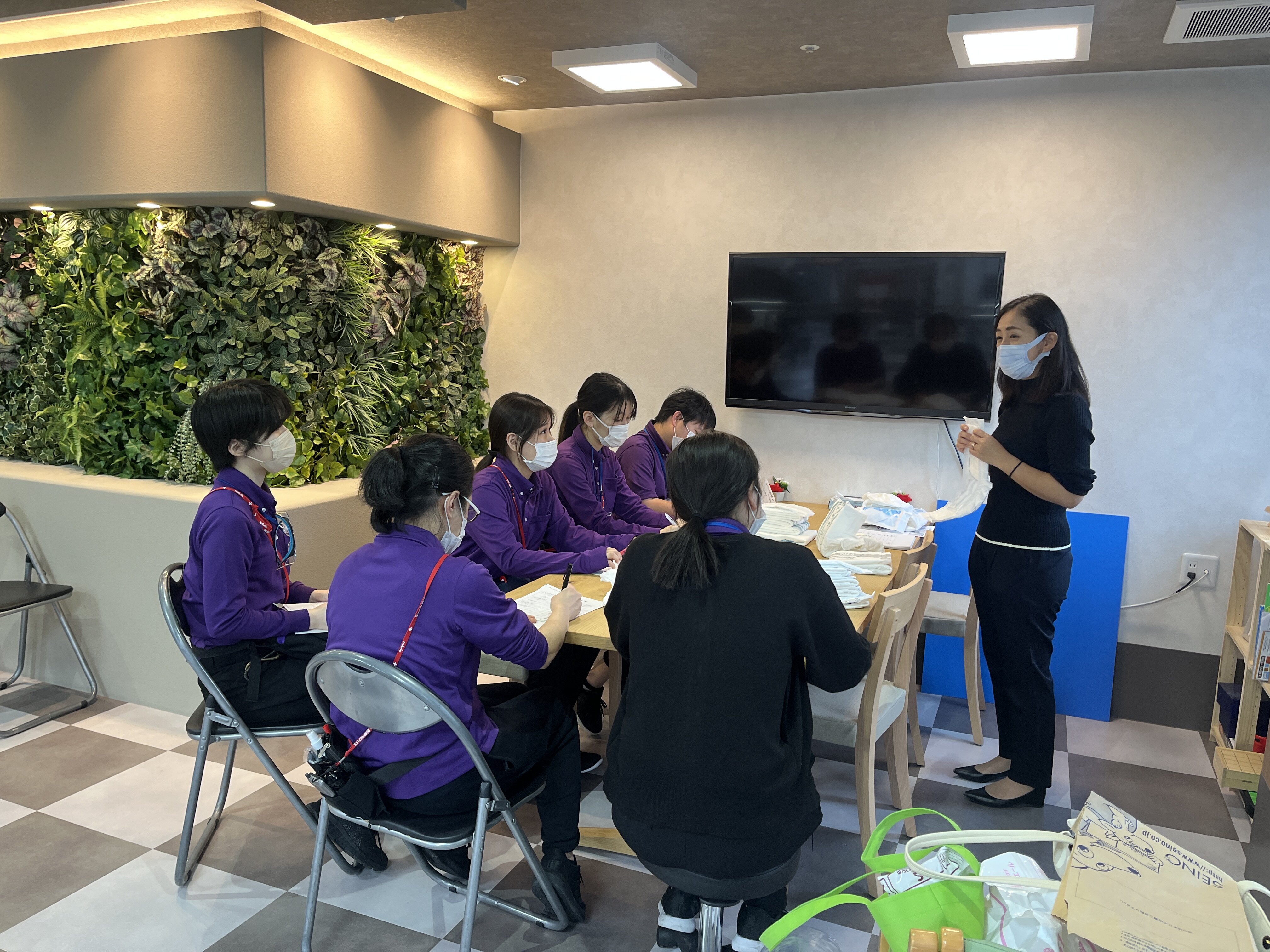 先日、エリエール等を取り扱っておられる【王子製紙】様にご協力いただき、施設職員向けに「おむつの当て方・選び方」研修会を開催しました。当日は、専門職の方に来訪して頂き「正しい選定方法」や「デモ機」を使ってのおむつの当て方等を学びました。参加職員からも「すぐにご入居者の方へ活かせる内容で、とても勉強になりました」といったお声を頂いております。