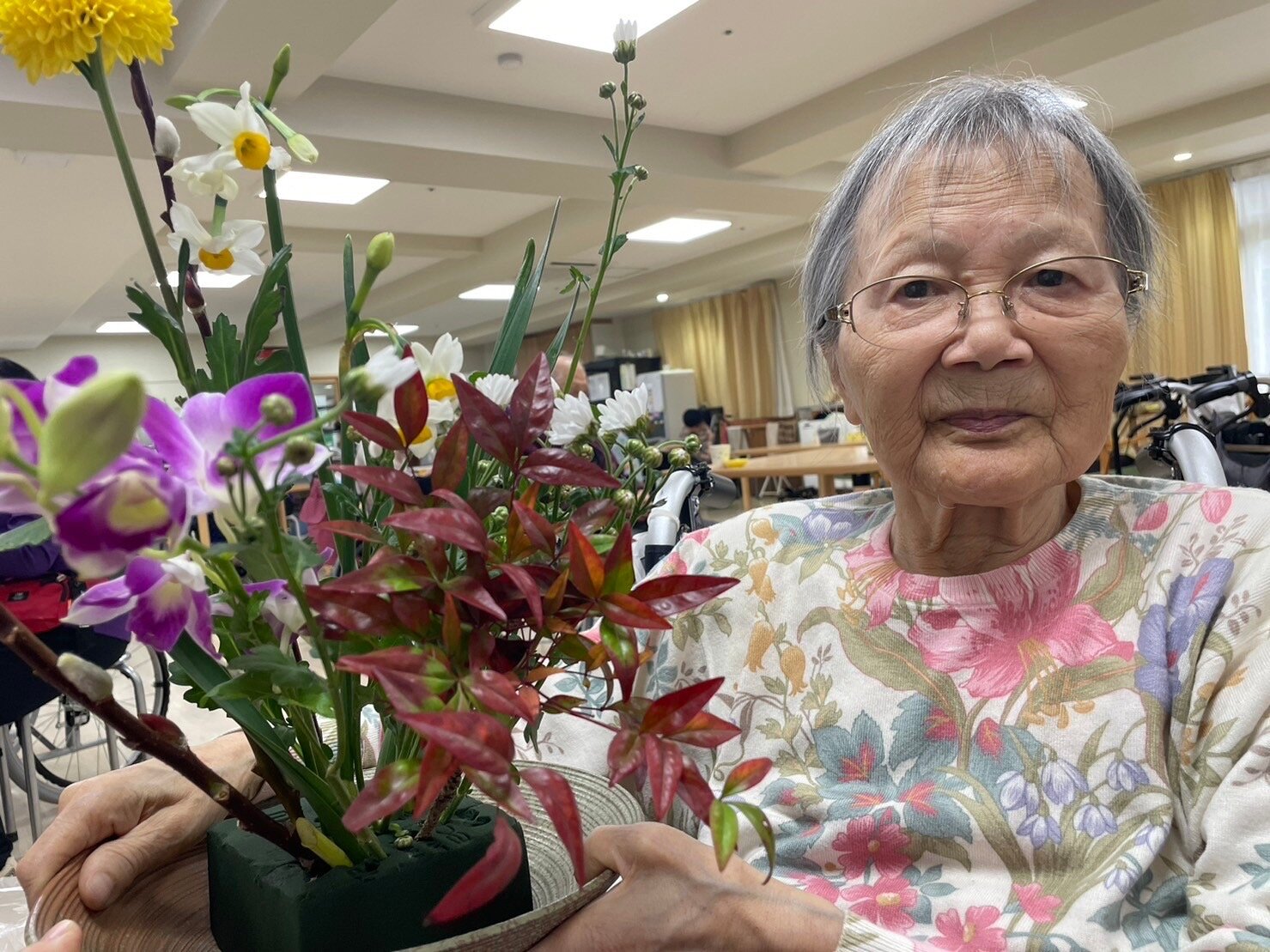 本日、今年1回目の【生け花アクティビティー】を開催致しました。年始早々、20名を超える参加を頂き、大好評のうちに終える事が出来ました。当施設では、2回/月、生け花アクティビティーを開催し、ほぼすべての方が思い思いに【生け花】を楽しんでおられます。参加されたご入居者の皆様も、「毎日、楽しく過ごさせて頂いています」「毎月、成果に触れる機会がある事は嬉しい」「来月も楽しみです」等といった、嬉しいお声を頂いております。来月も開催予定ですのでお楽しみ。