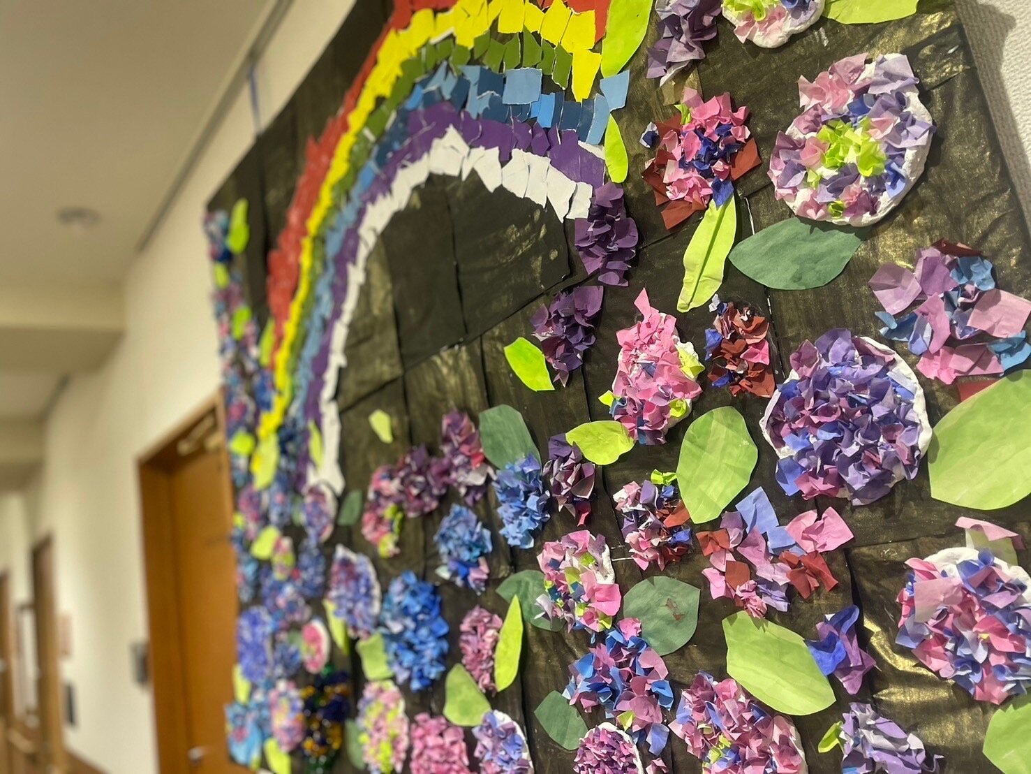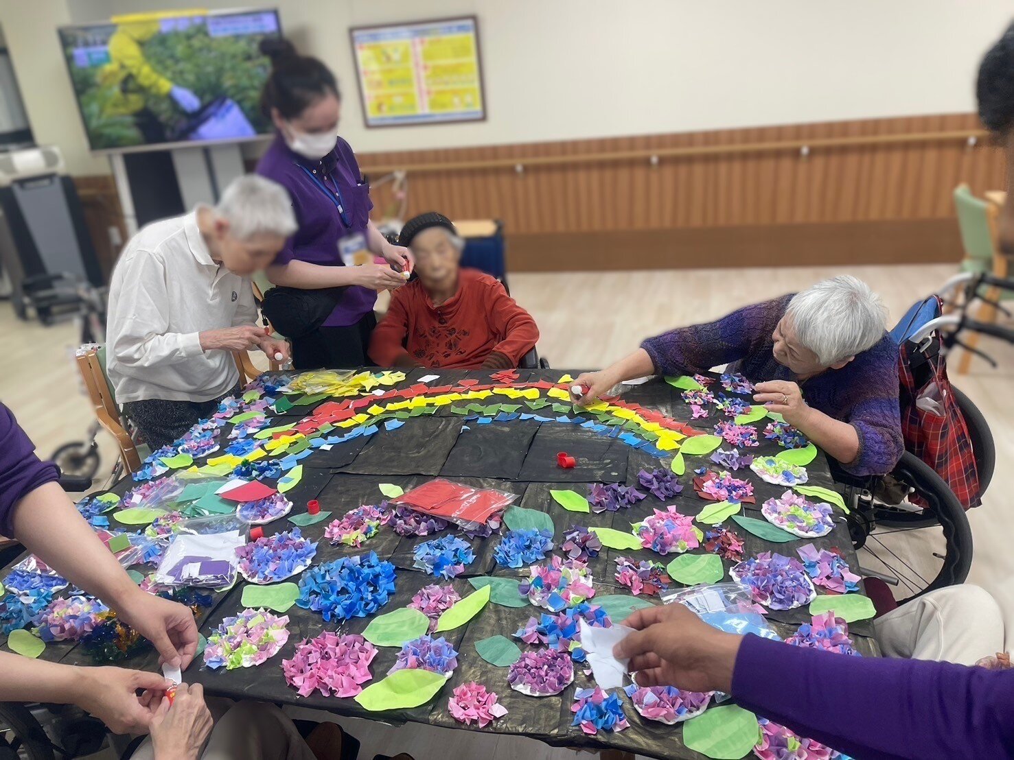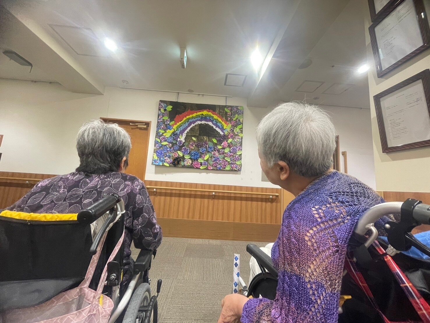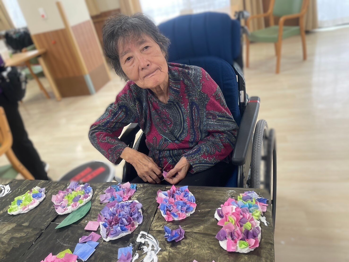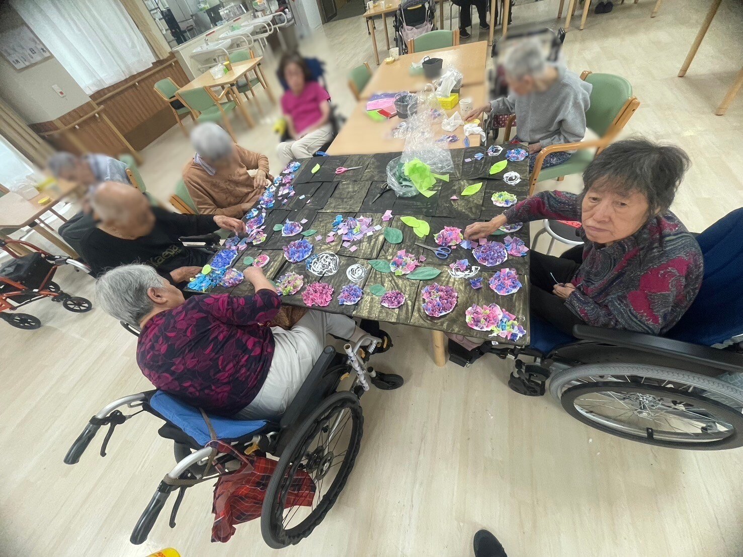 皆様、こんにちは。前回に続き【壁紙作成】のご様子をお伝えさせて頂きます。今回も、多くのご入居者の方が参加され、見事、素晴らしい作品が完成いたしました。今回の作品は、当施設の玄関前に掲示しておりますので、ご来訪の折に是非、ご鑑賞ください。