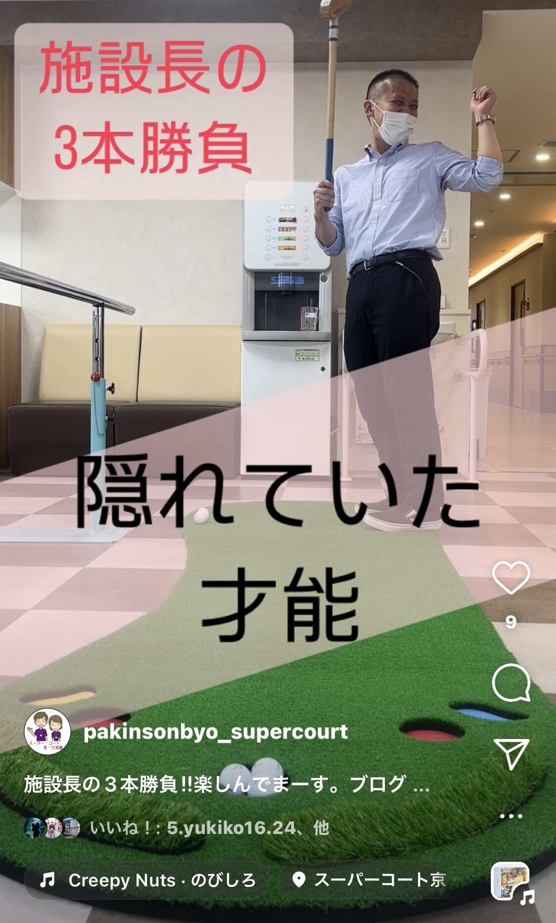 皆様、こんにちは。本日、4階のリハビリ室を覗くと、施設長兼ケアマネージャーが【パターゴルフ】をされておられました。お話をお聞きすると「未経験」との事で、プレーステーションの「みんなのゴルフ」で得た実力をいかんなく発揮されていました。次回は、だれが登場するでしょうか。こうご期待。