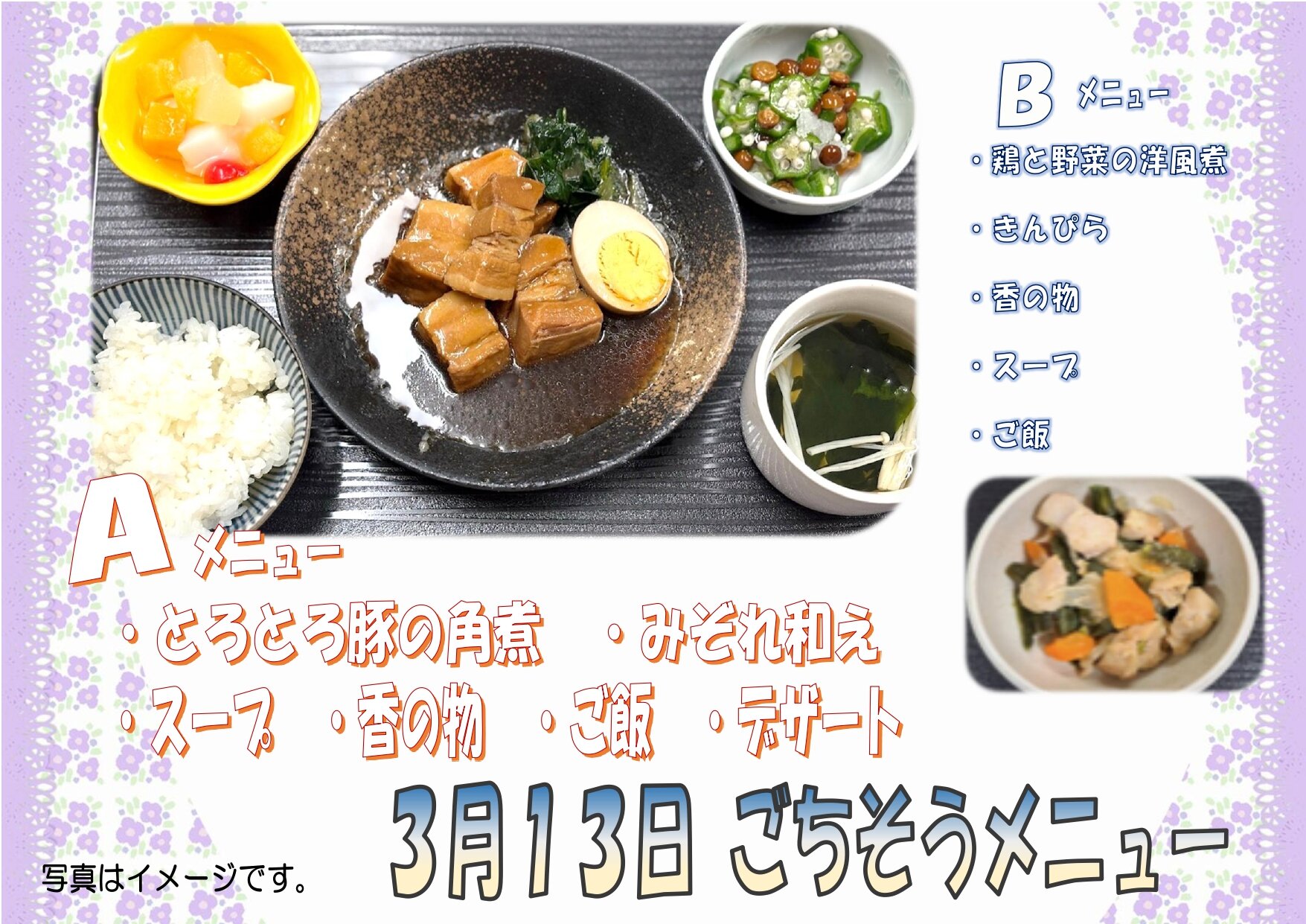 ※事前にご本人・ご家族に聞き取りを行い別料金になりますが通常メニューかごちそうメニューを洗濯していただきます。