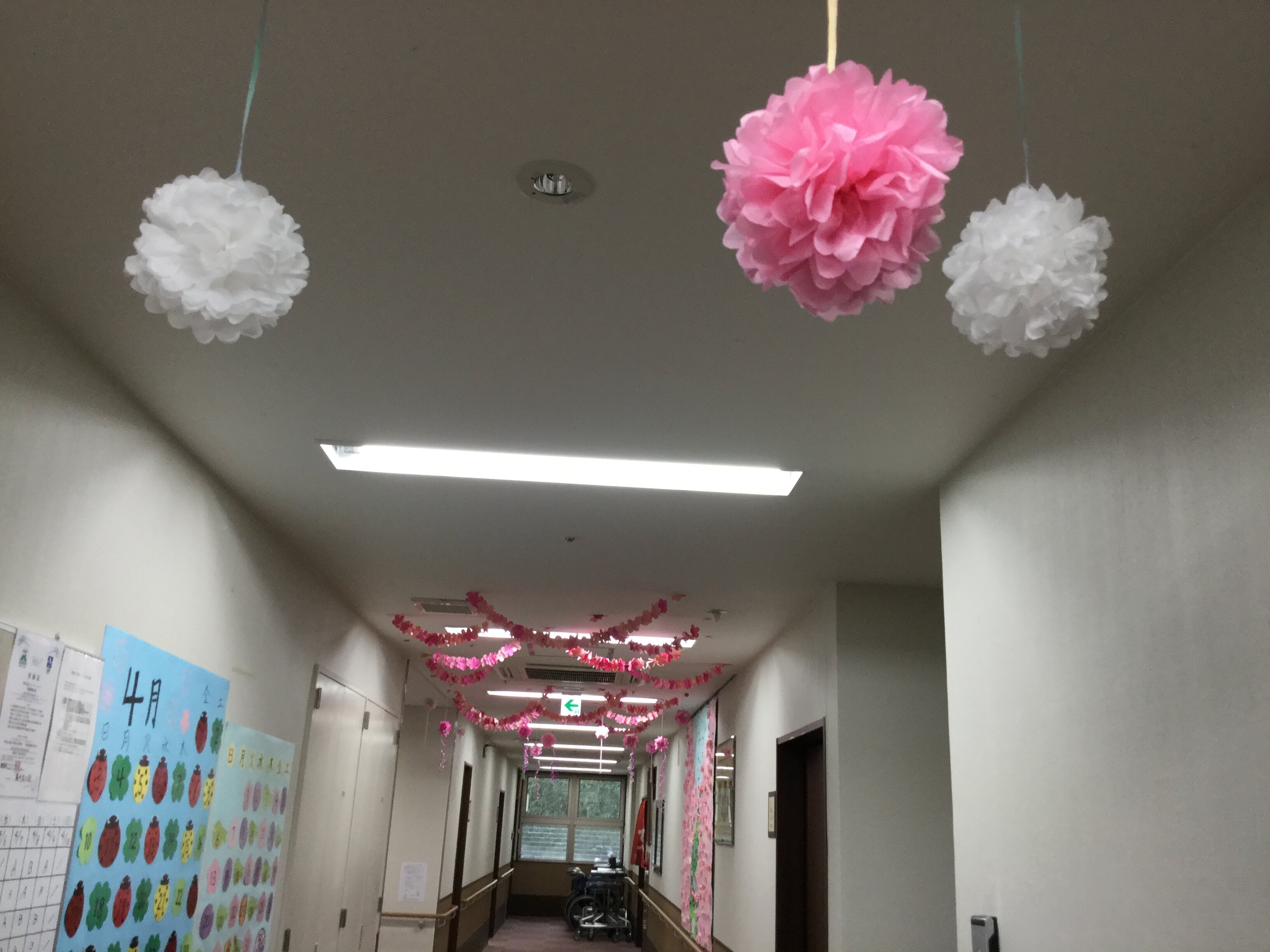 そこで、少しでも皆様に春を感じていただきたく、職員手作りで桜をモチーフにした、壁紙や飾りつけを壁や廊下にさせていただきました♪