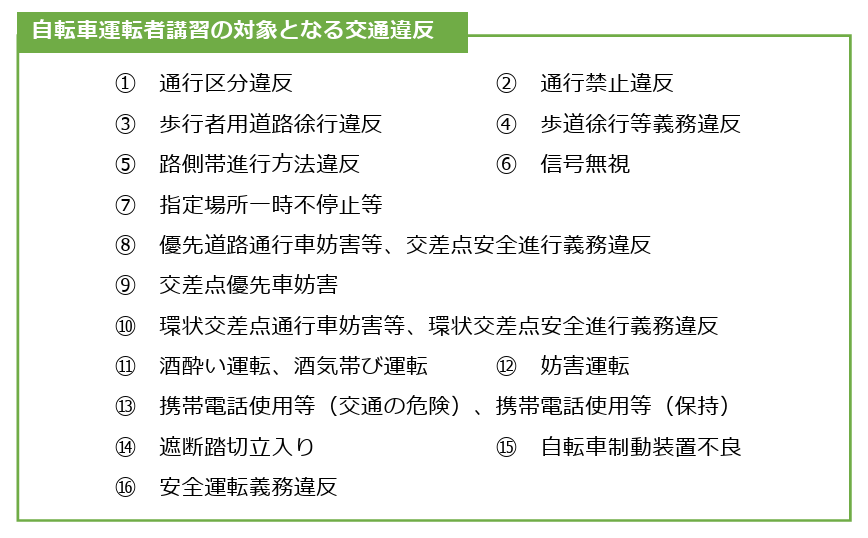 こちらは14歳以上で以下の16種類の違反を3年以内に2回した場合か交通事故を起こした場合に受講しなければならないものです。