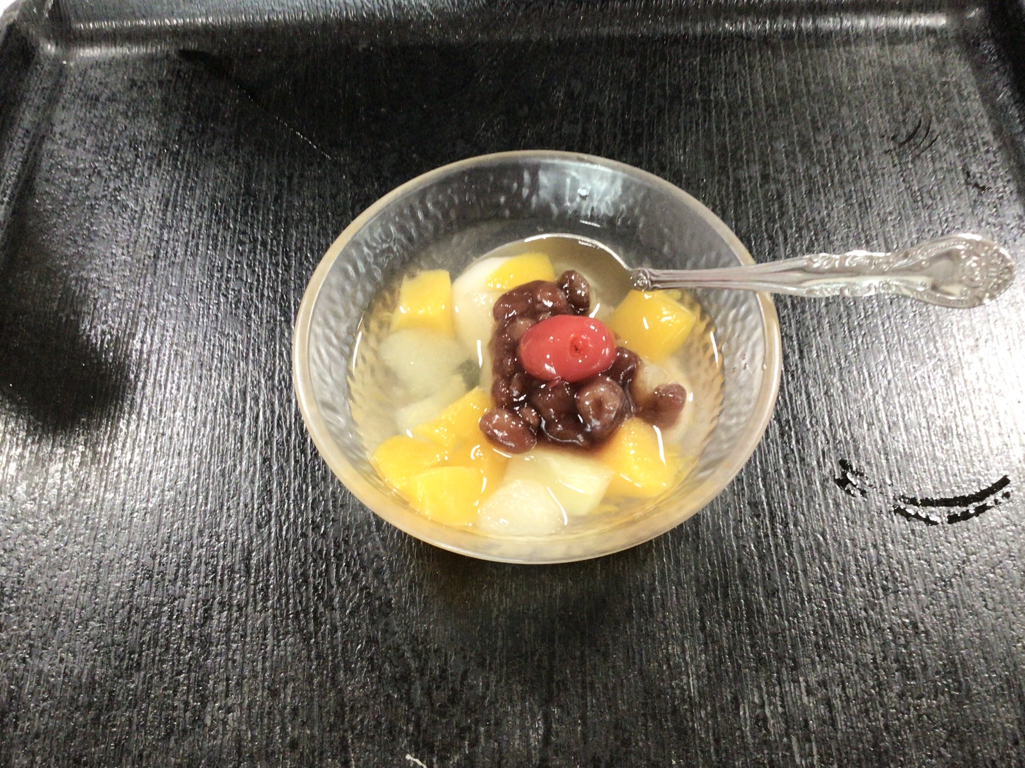 ⑤お皿に白玉とフルーツを入れシロップをかける