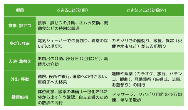 続いて、利用者様の体に直接触れたり、安全を確保しながら一緒に行う身体介護でできること・できないことは次のようになります。
