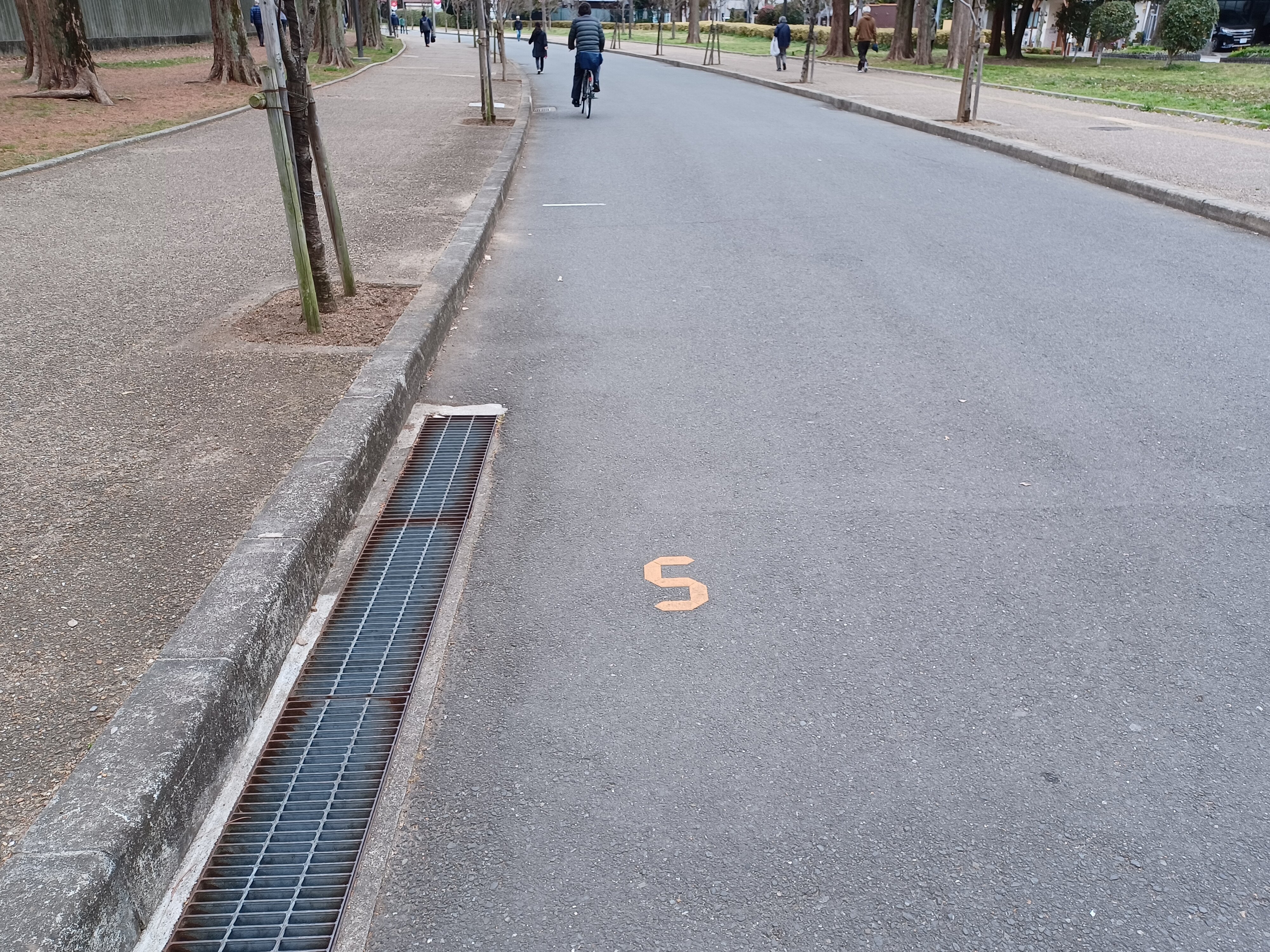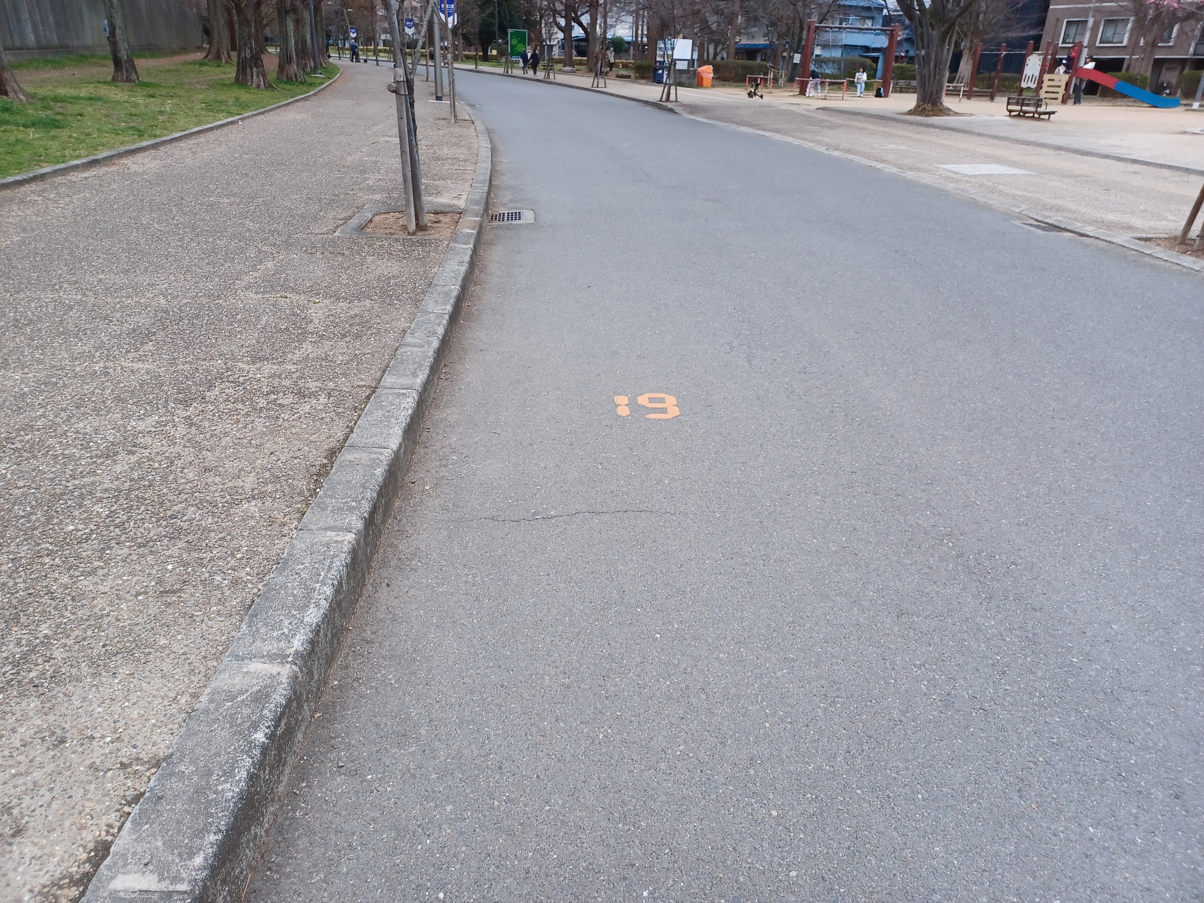 ヤンマースタジアムの前をスタートとして、路面と道路際にいろいろな表示がされています。