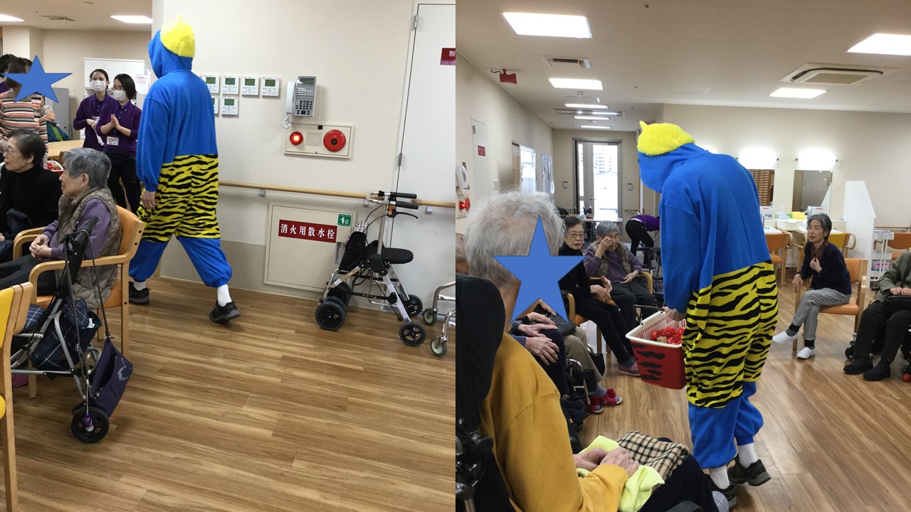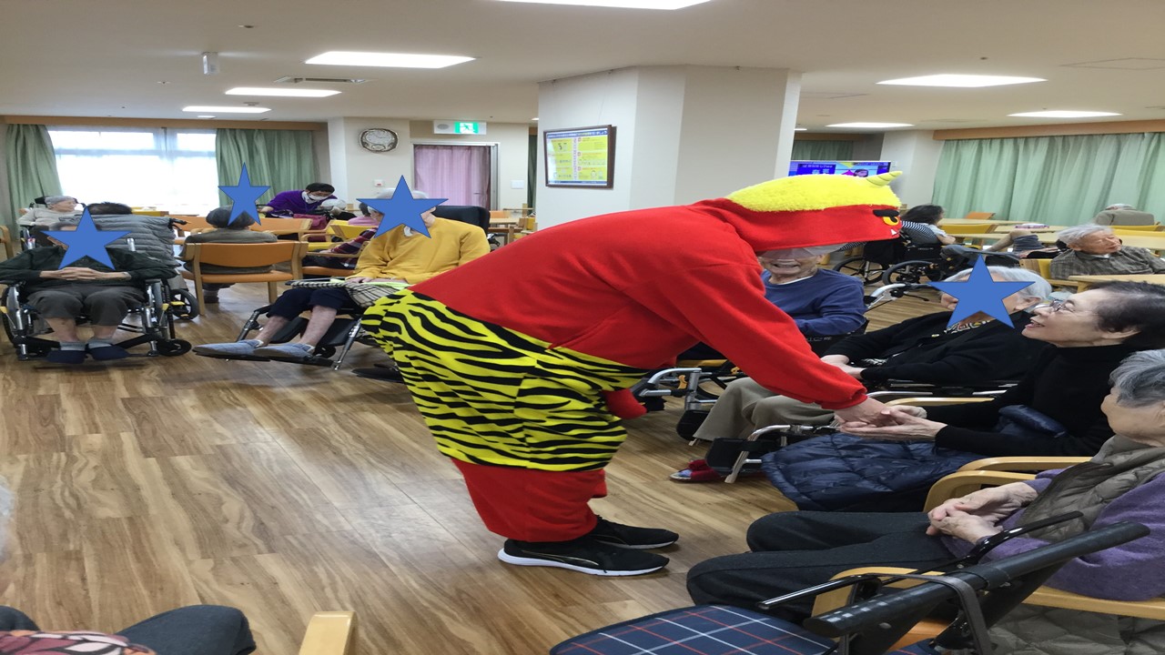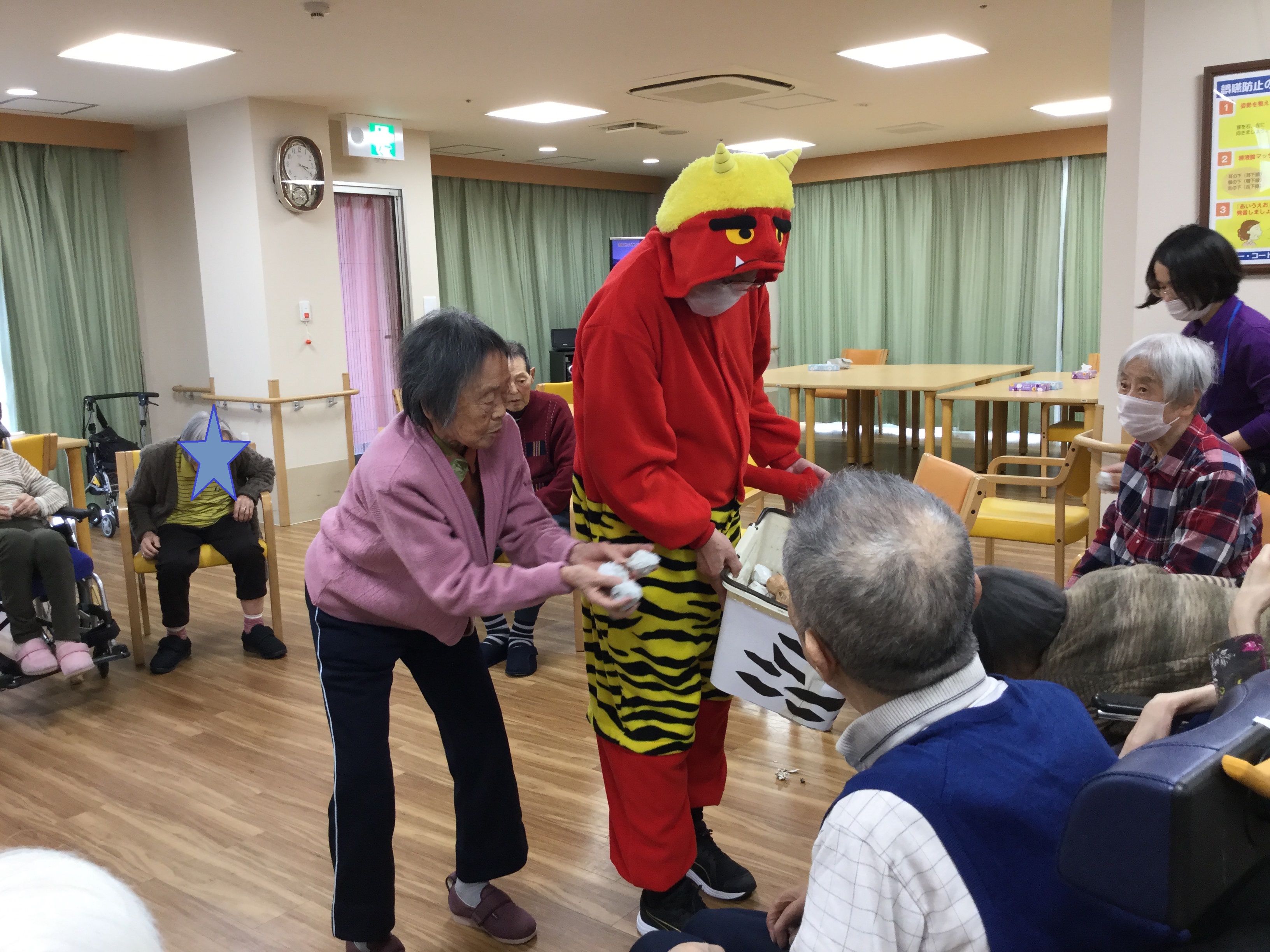 さてさて、この節分にあやかって、ゲストに赤鬼さんと青鬼さん(の格好をしたスタッフ)が施設に来ました!