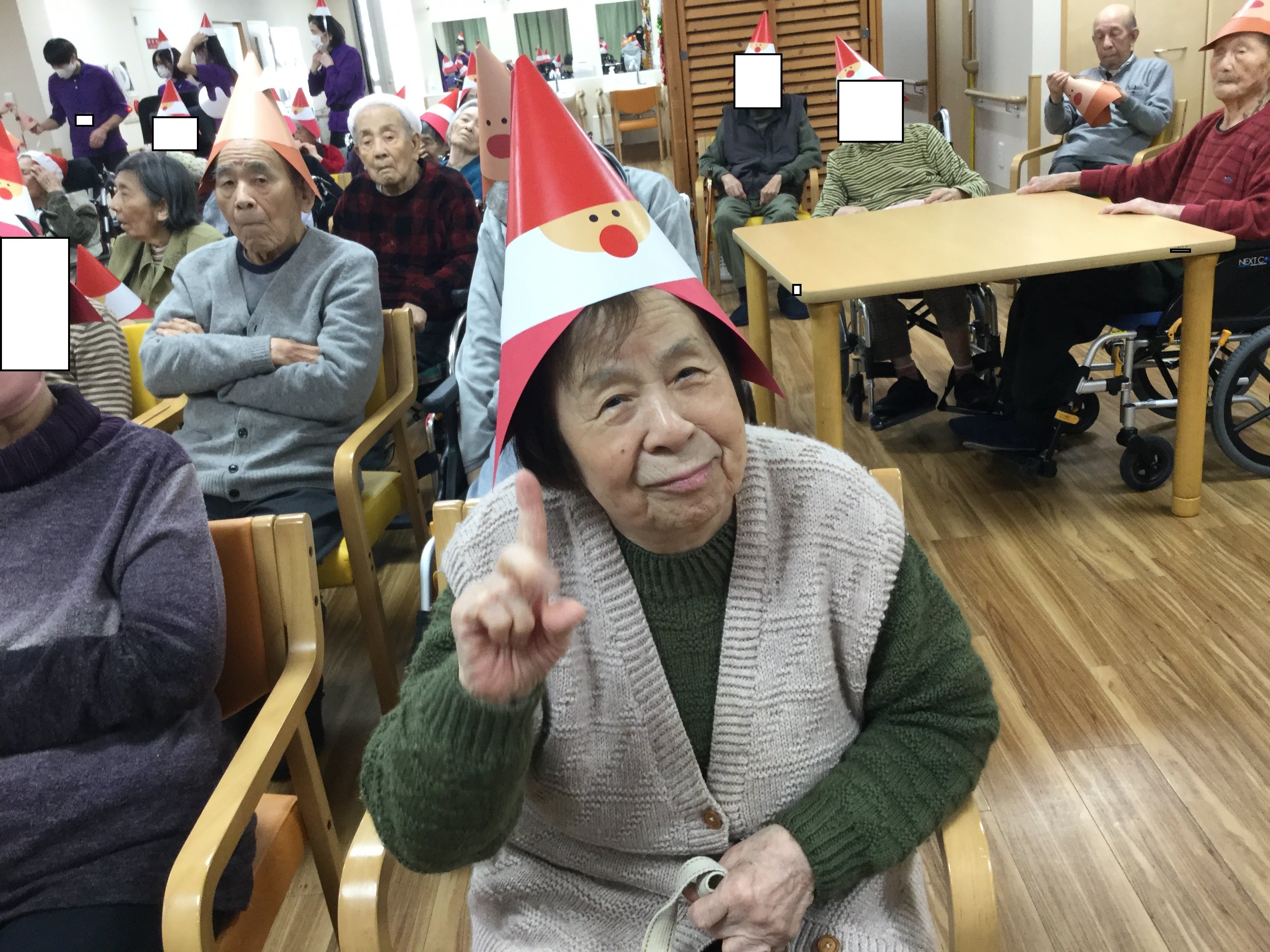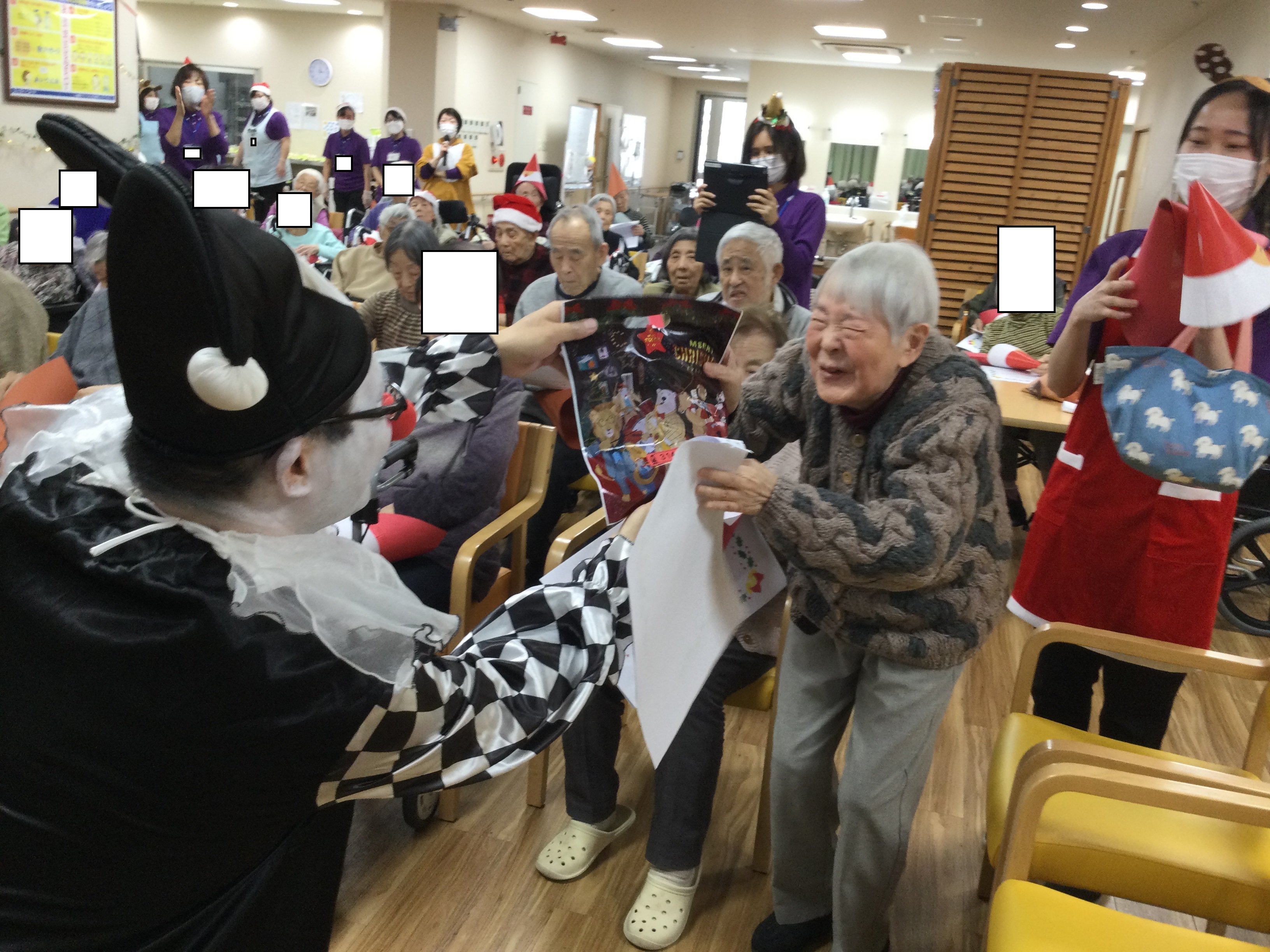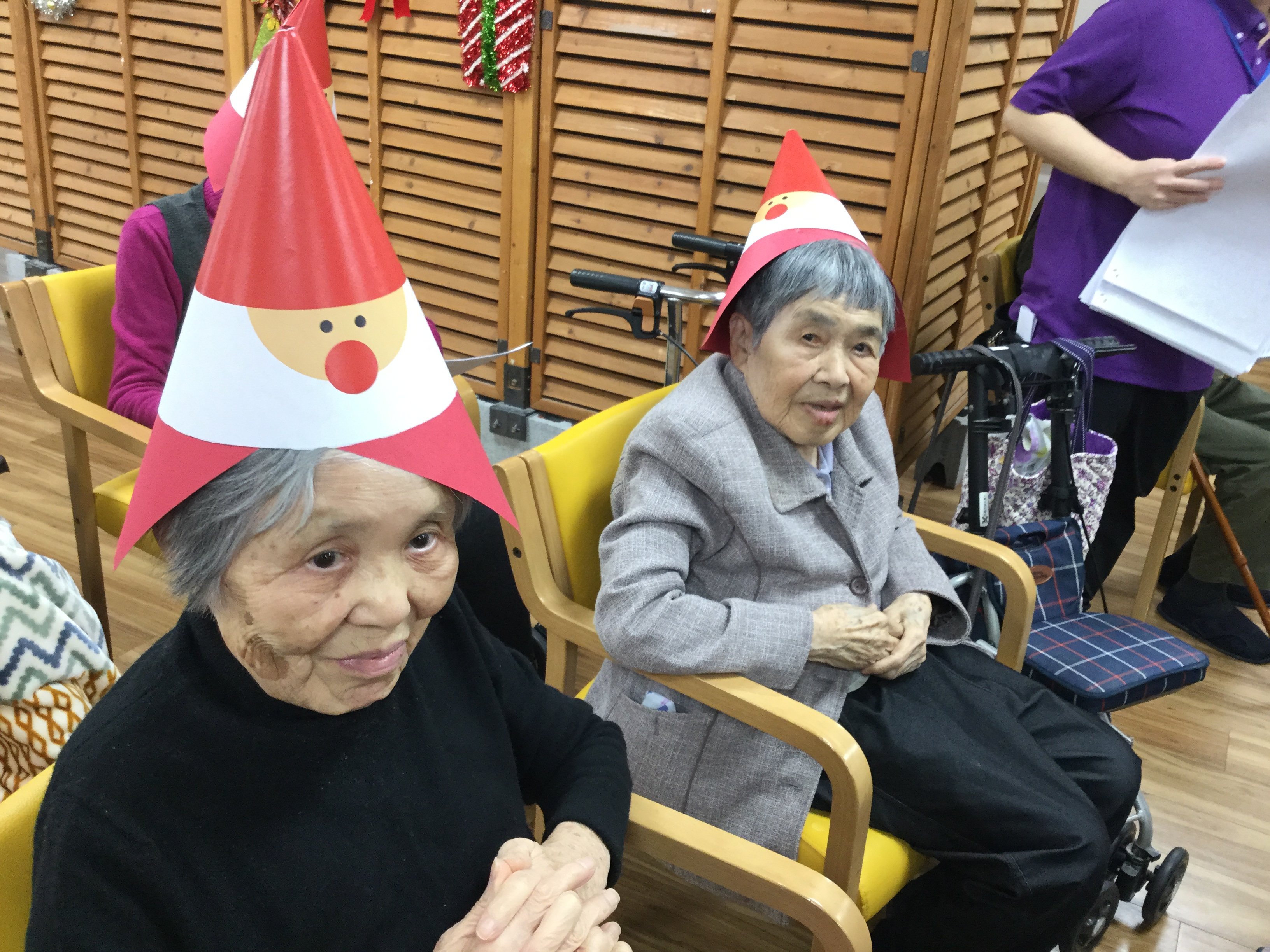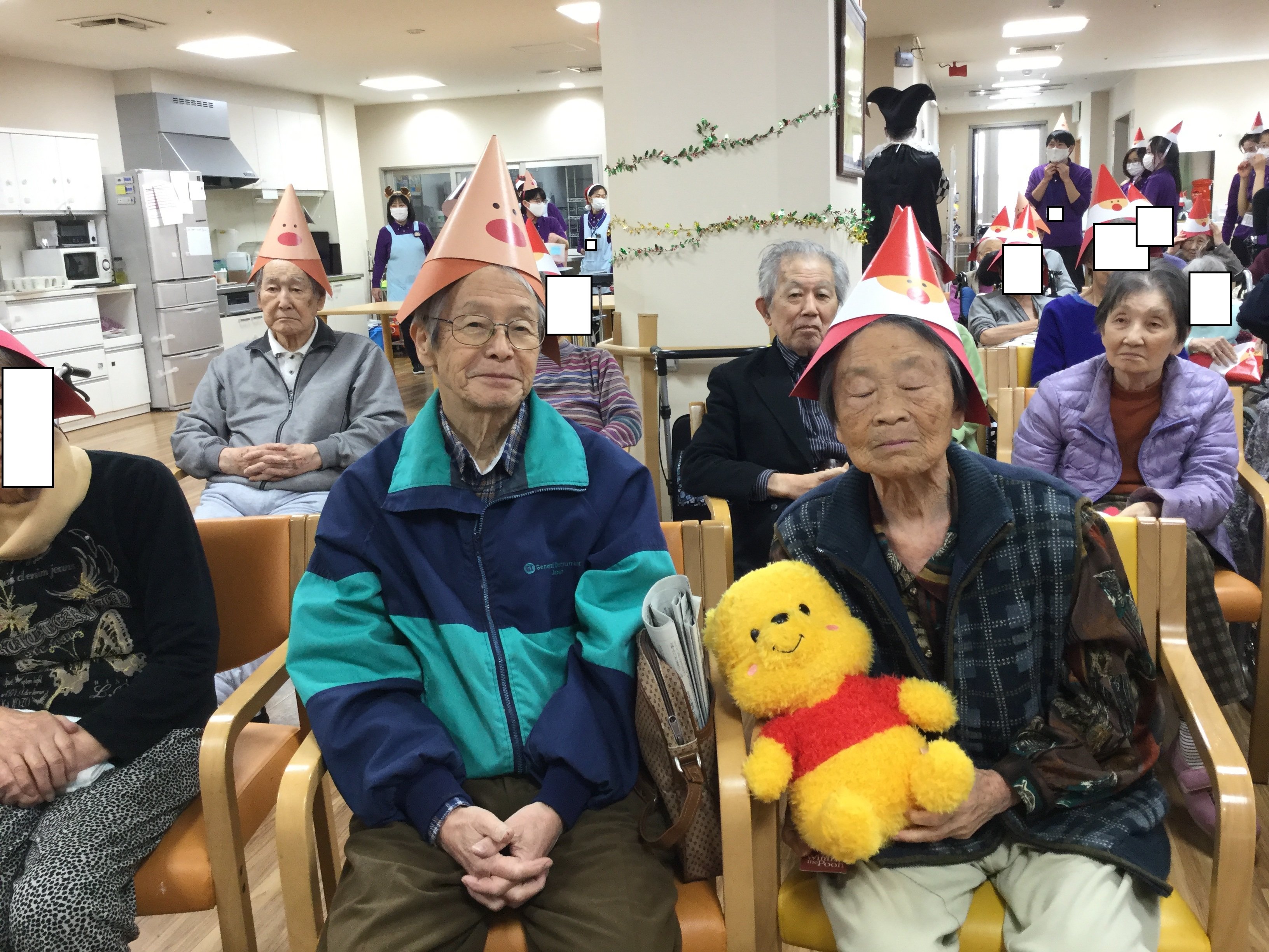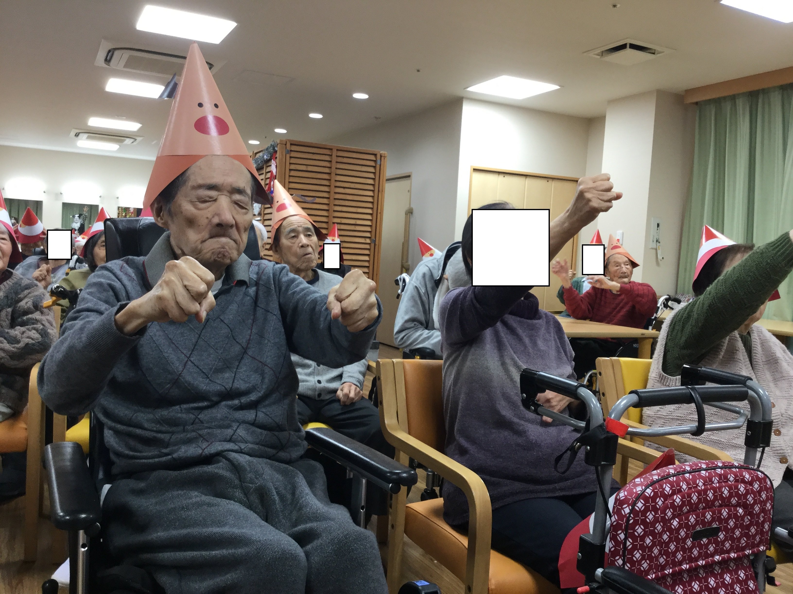 まず、皆さんに4階食堂に来て頂きサンタ、トナカイの被り物をお渡ししました!