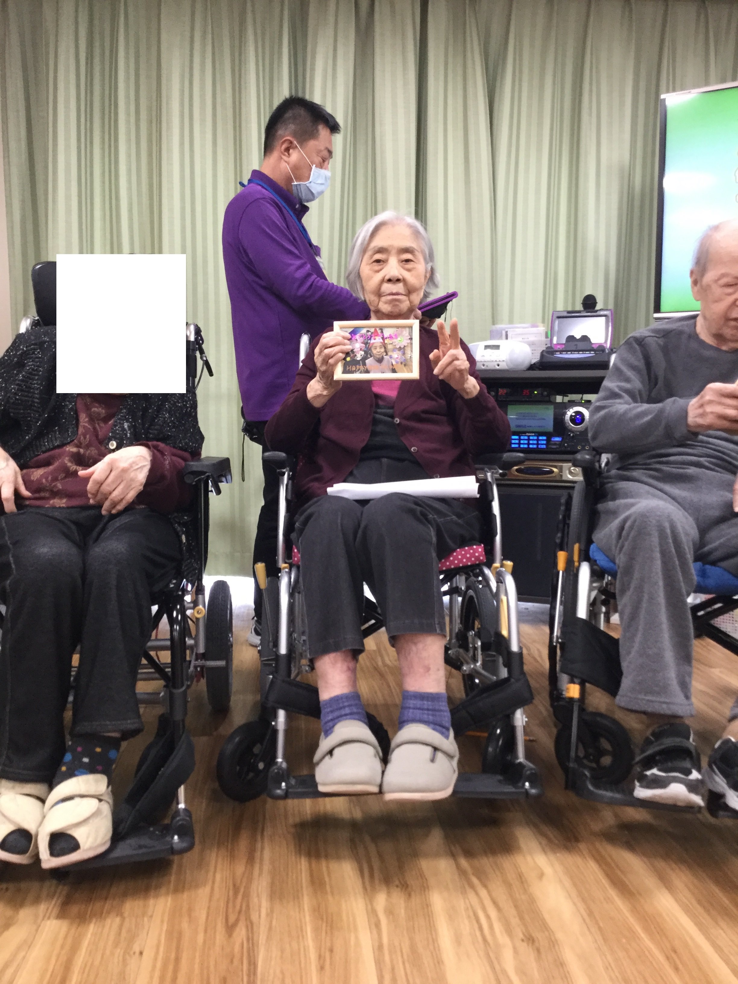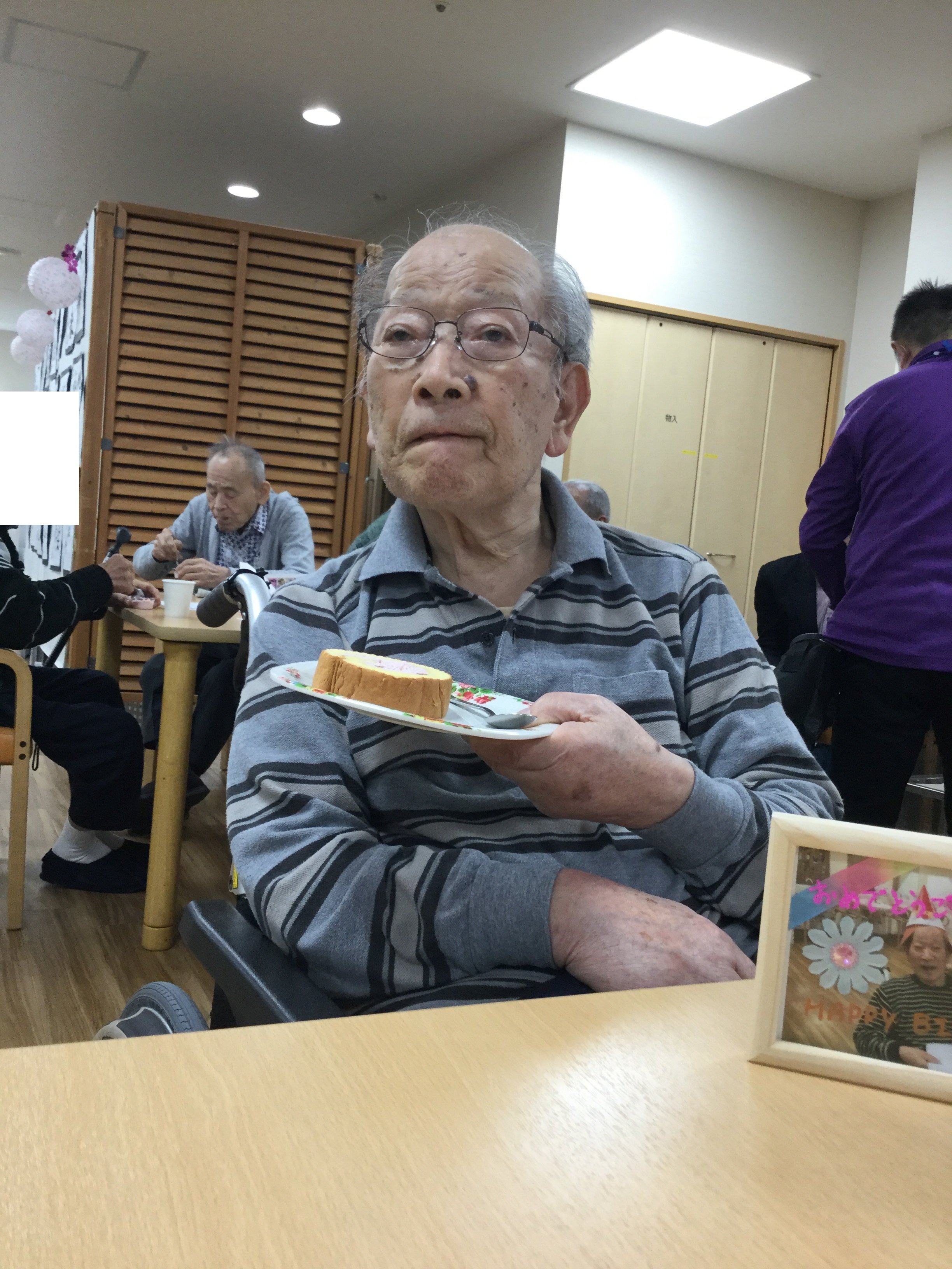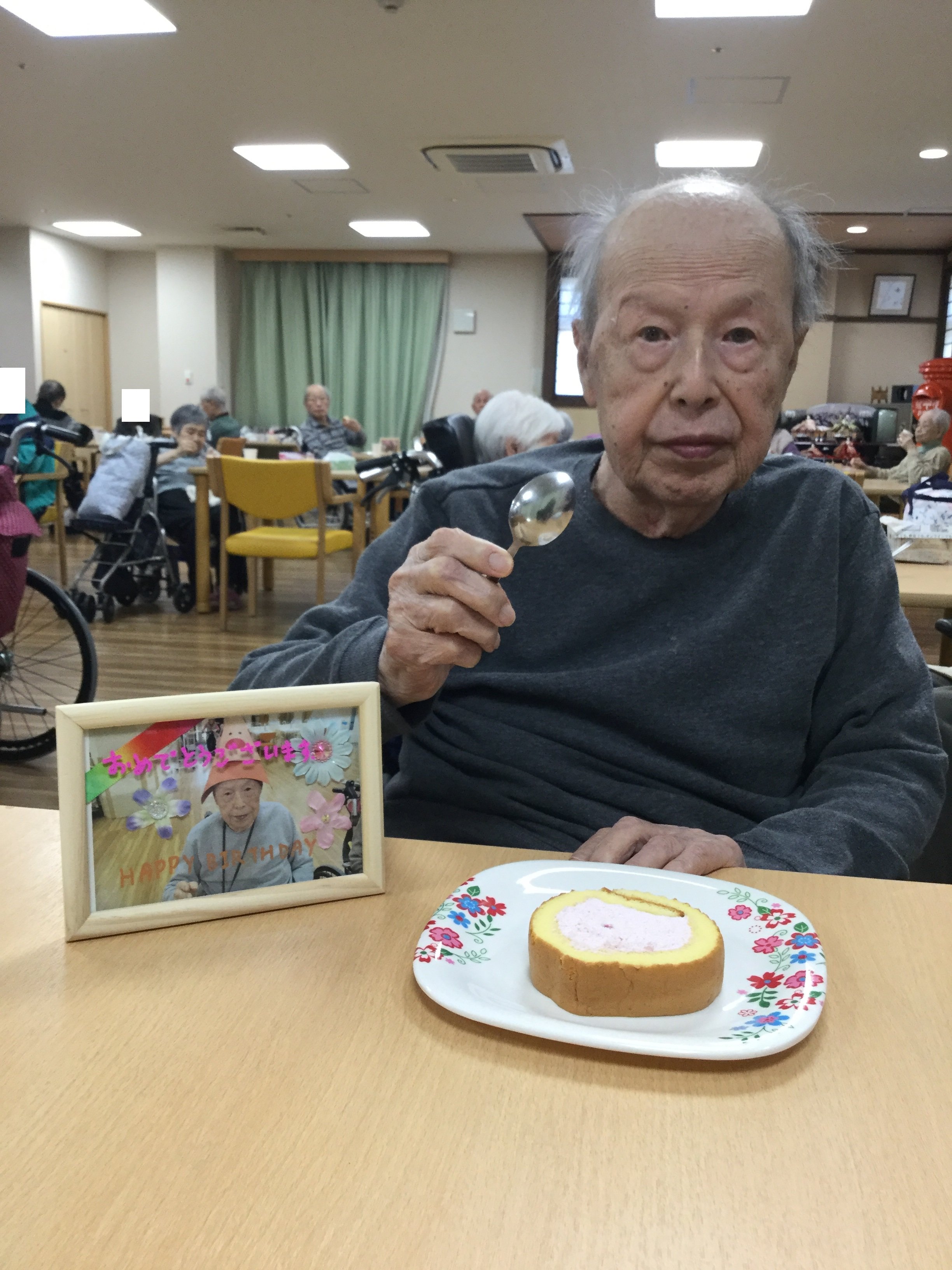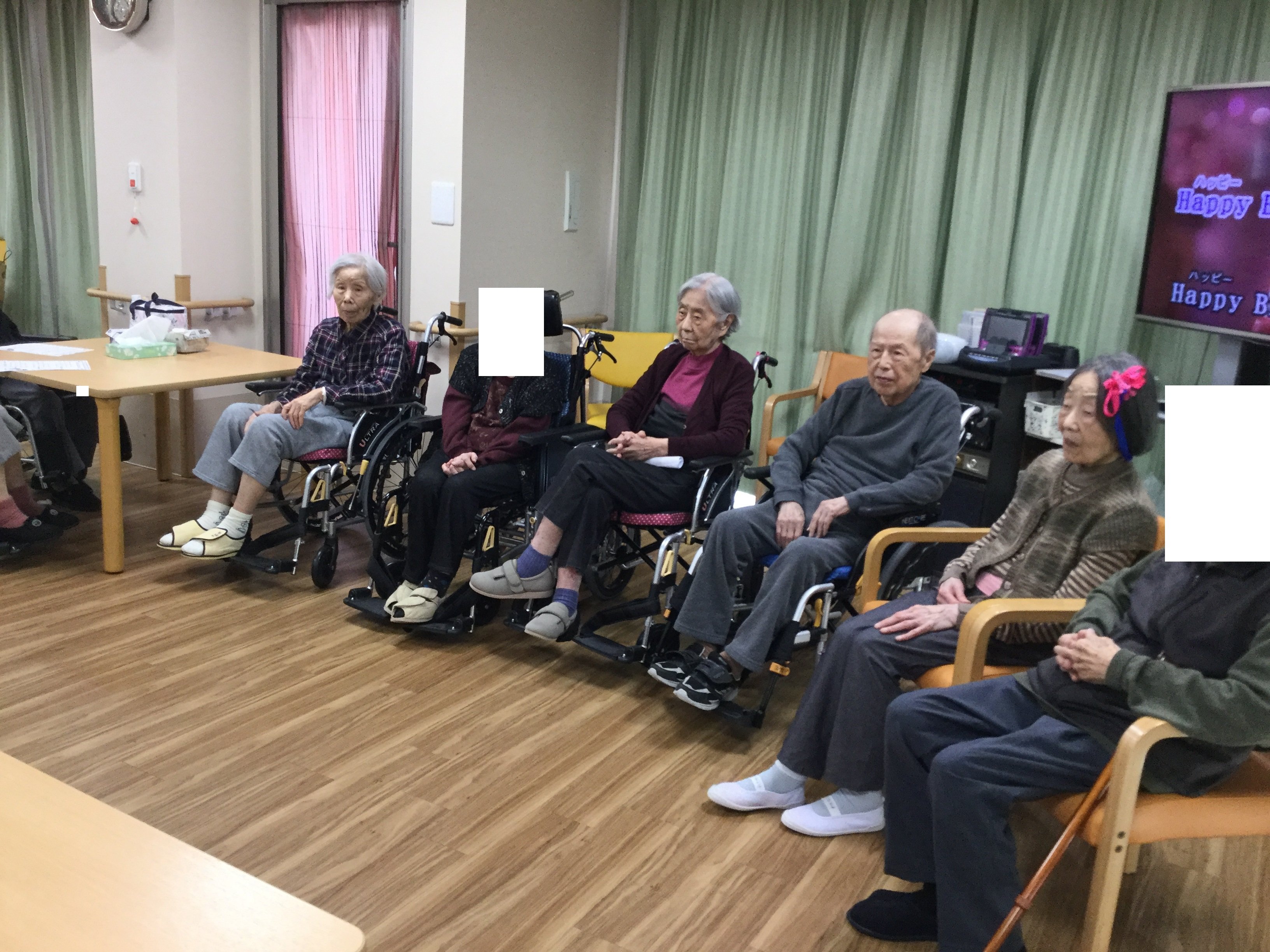 続いて、ご入居者様とスタッフによるHappy Birthday to Youをカラオケ音源に載せて合唱を行いました(/・ω・)/