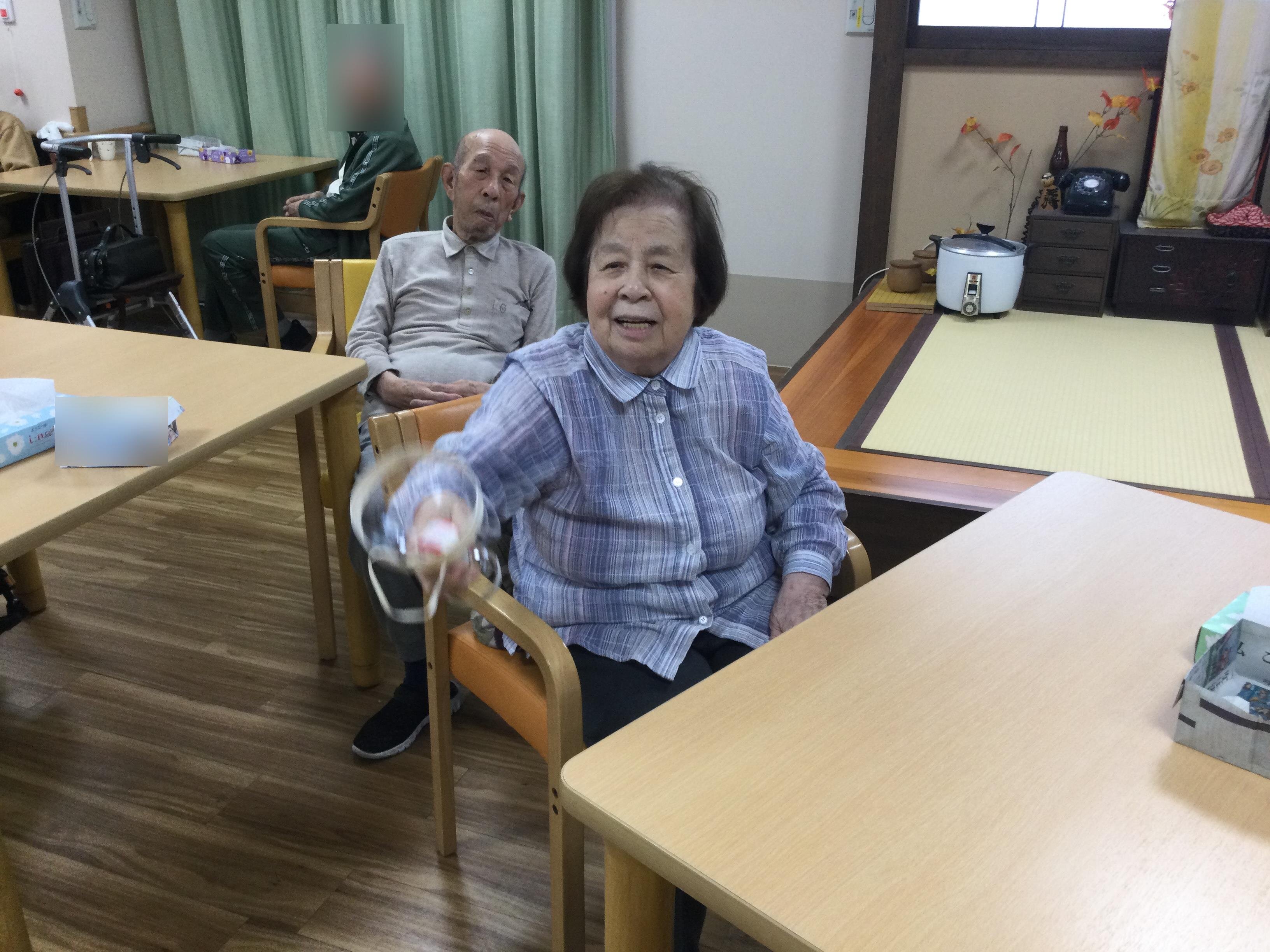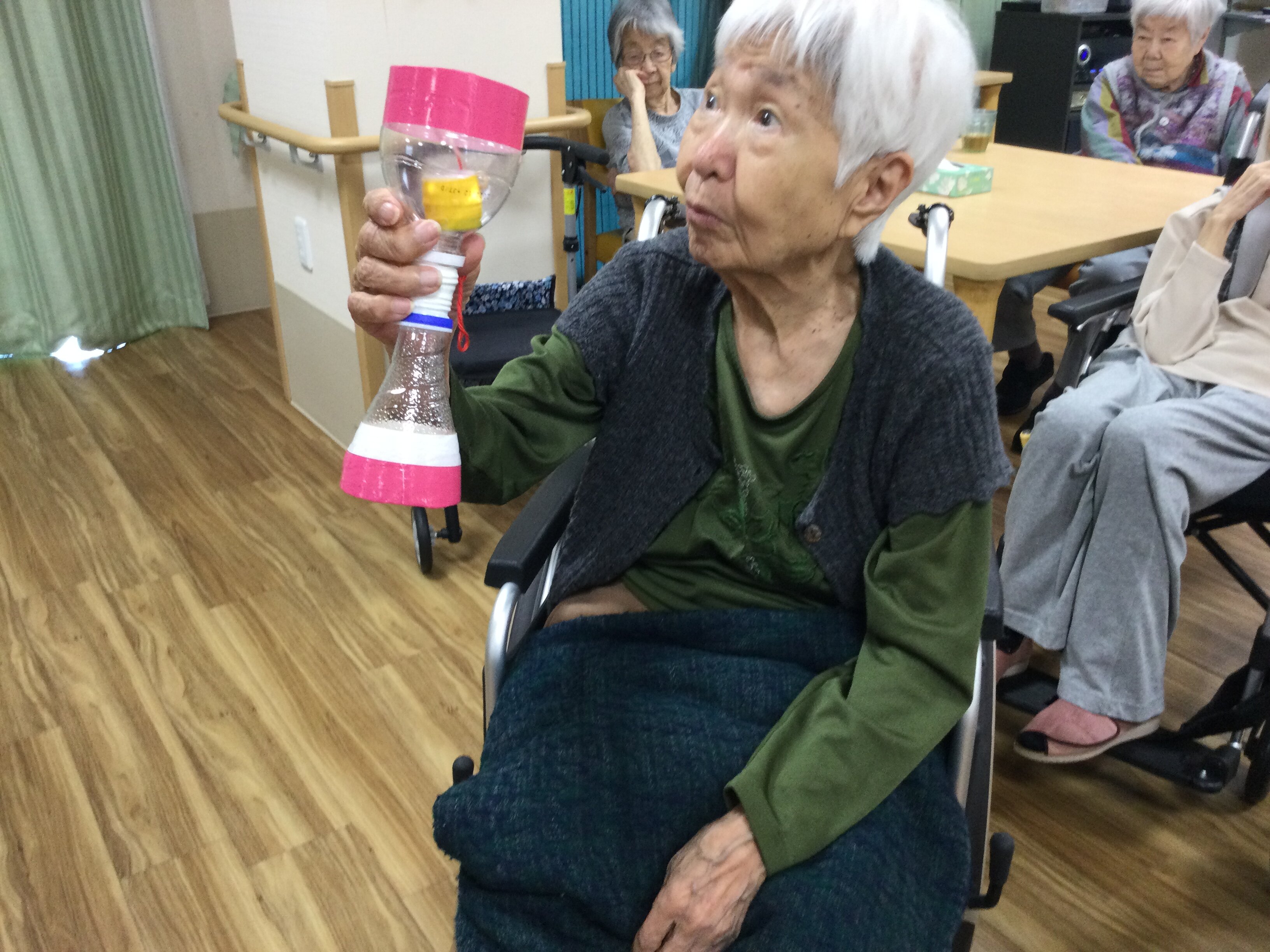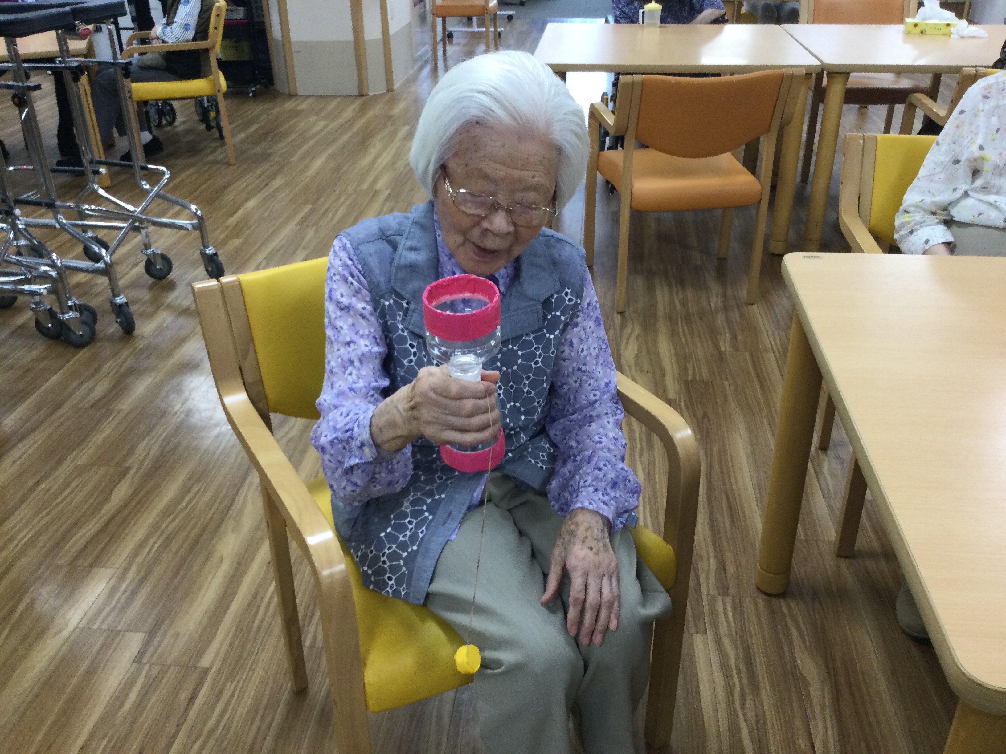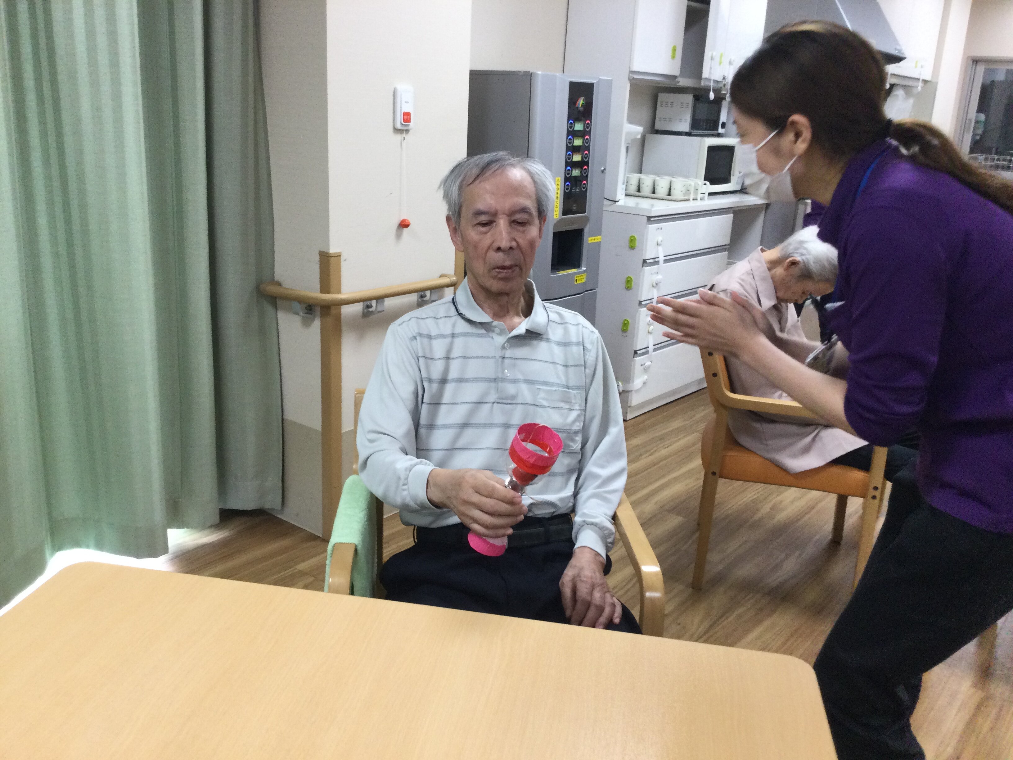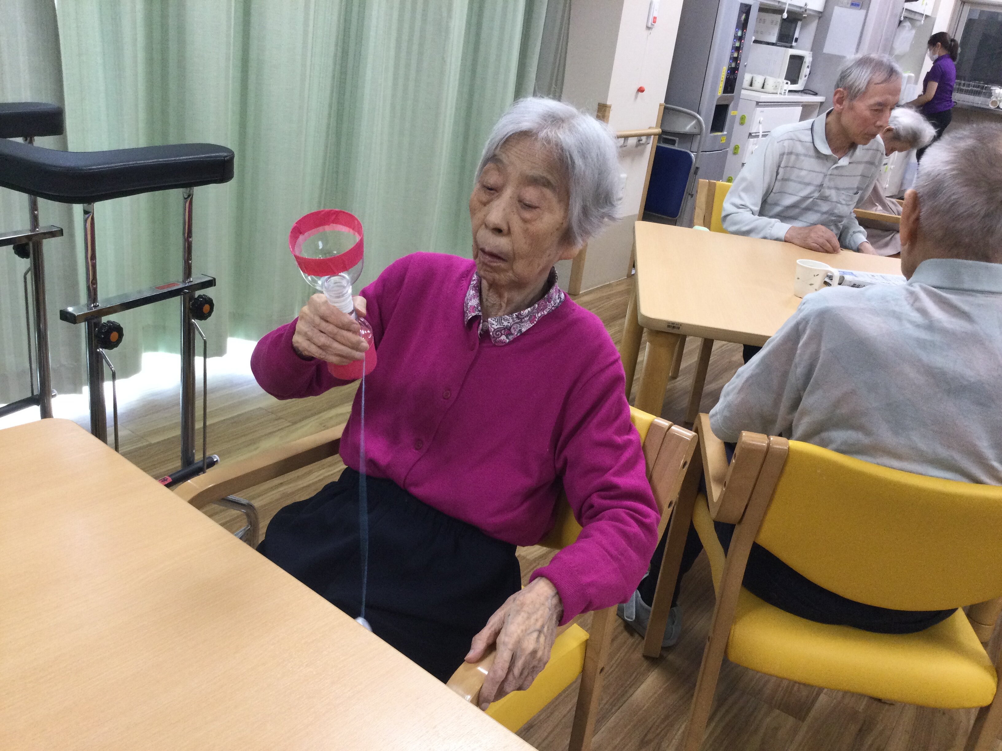 次はレクリエーションです!今月は、「手作りけん玉レク」を開催いたしました!
