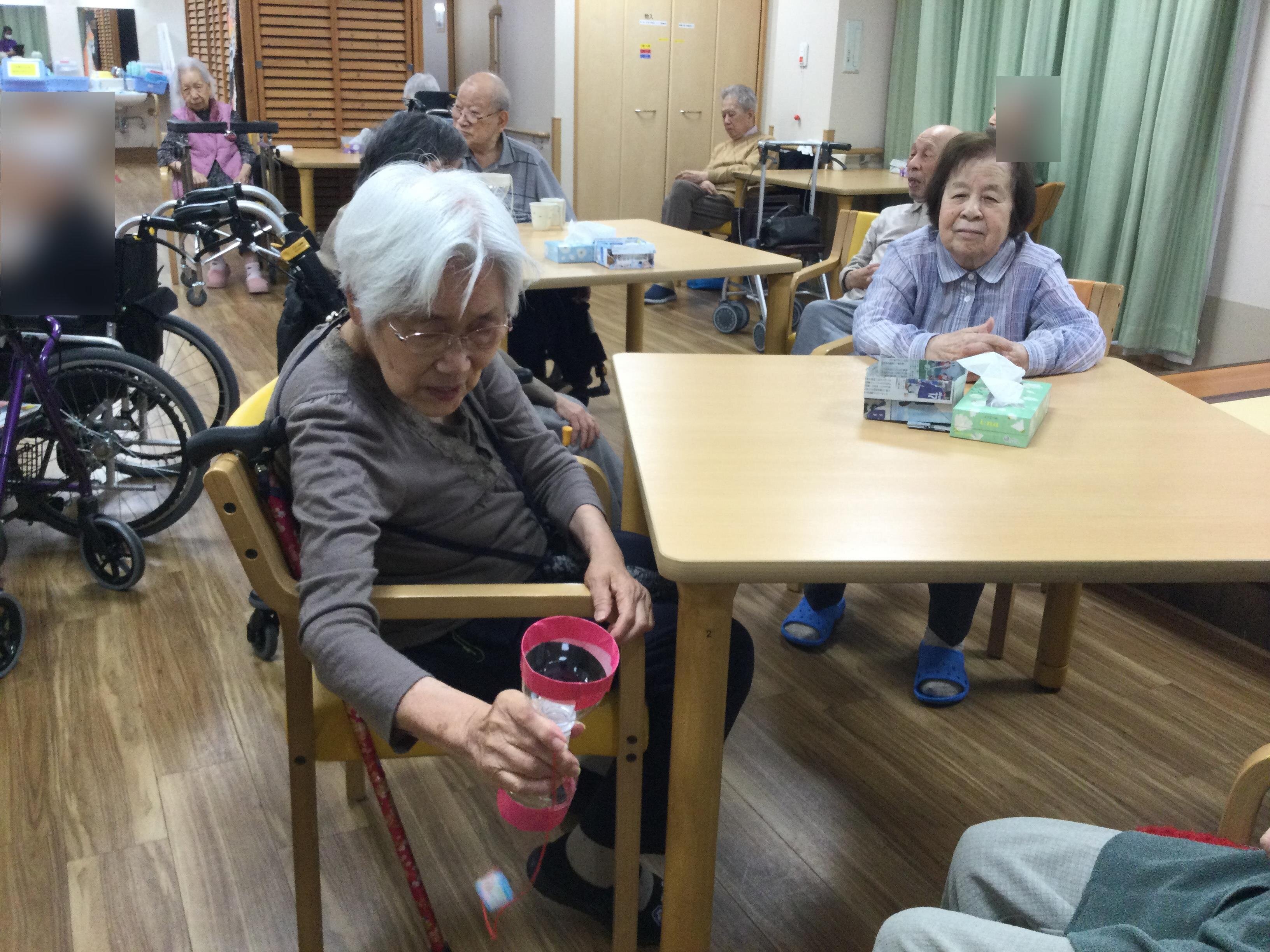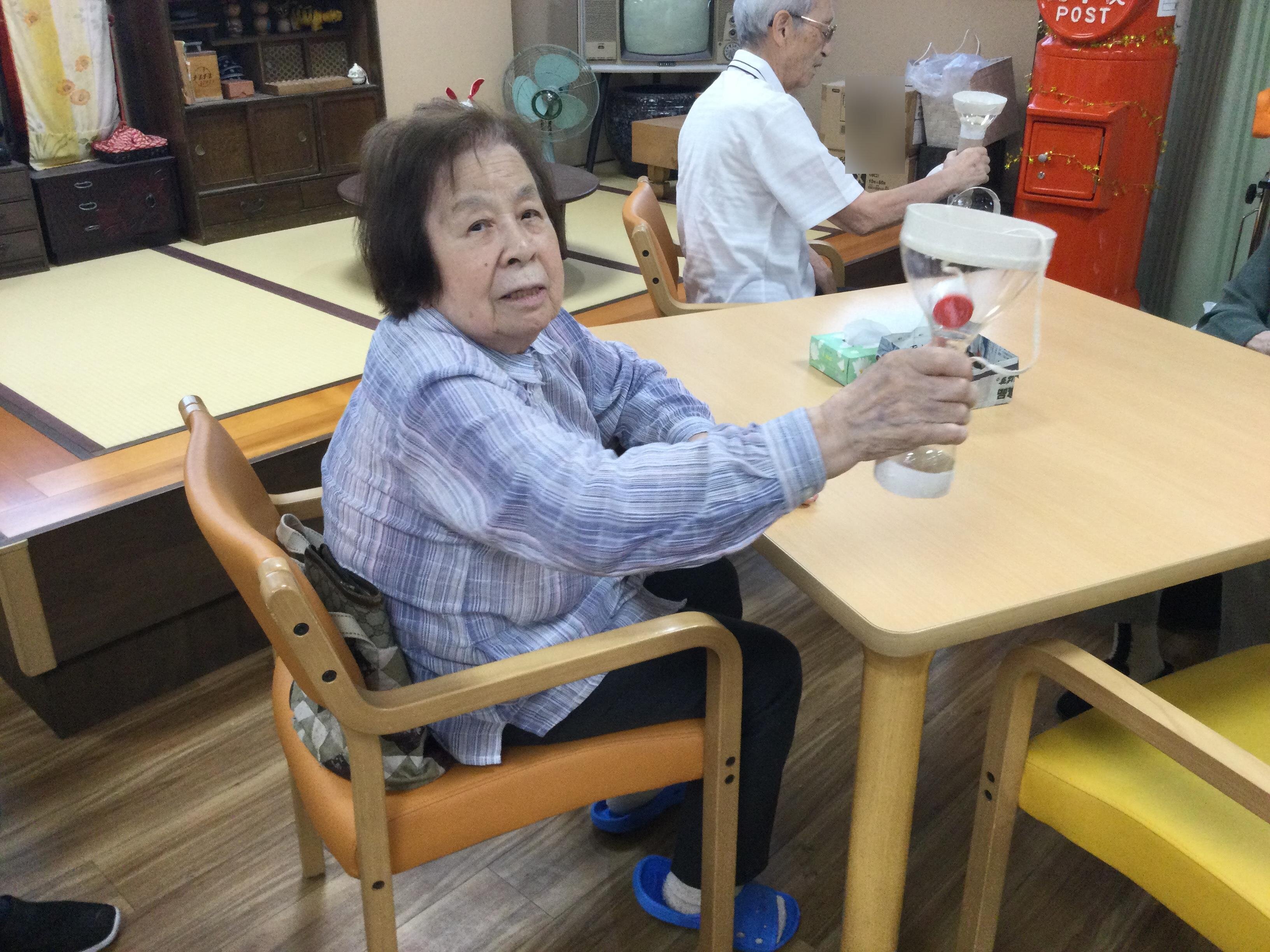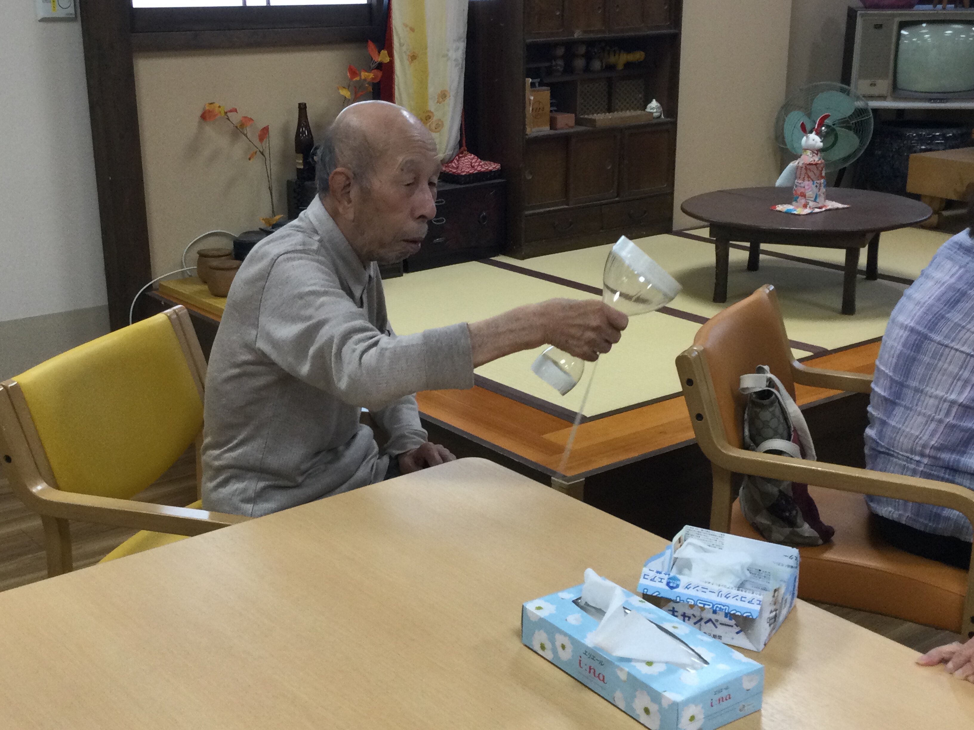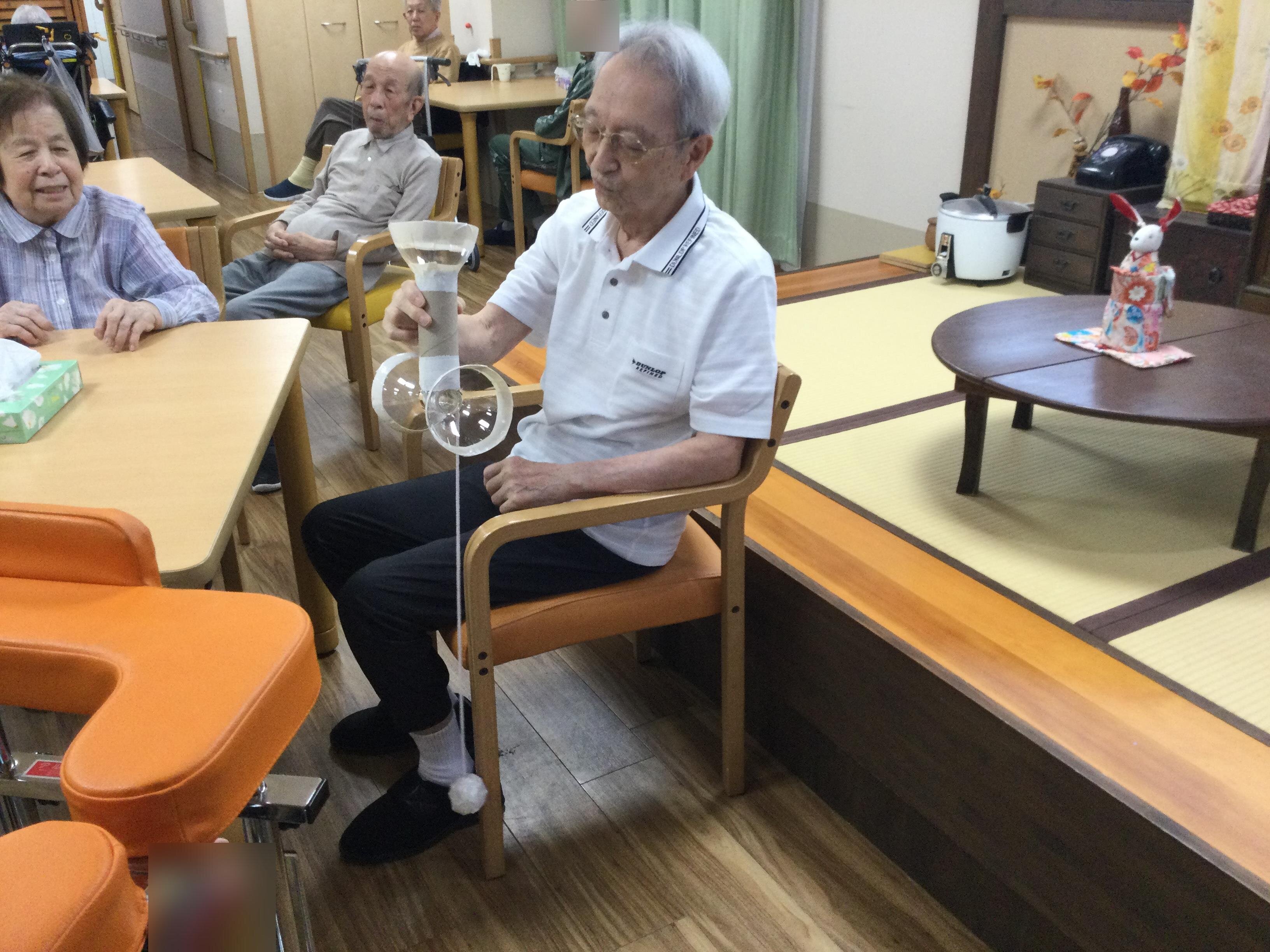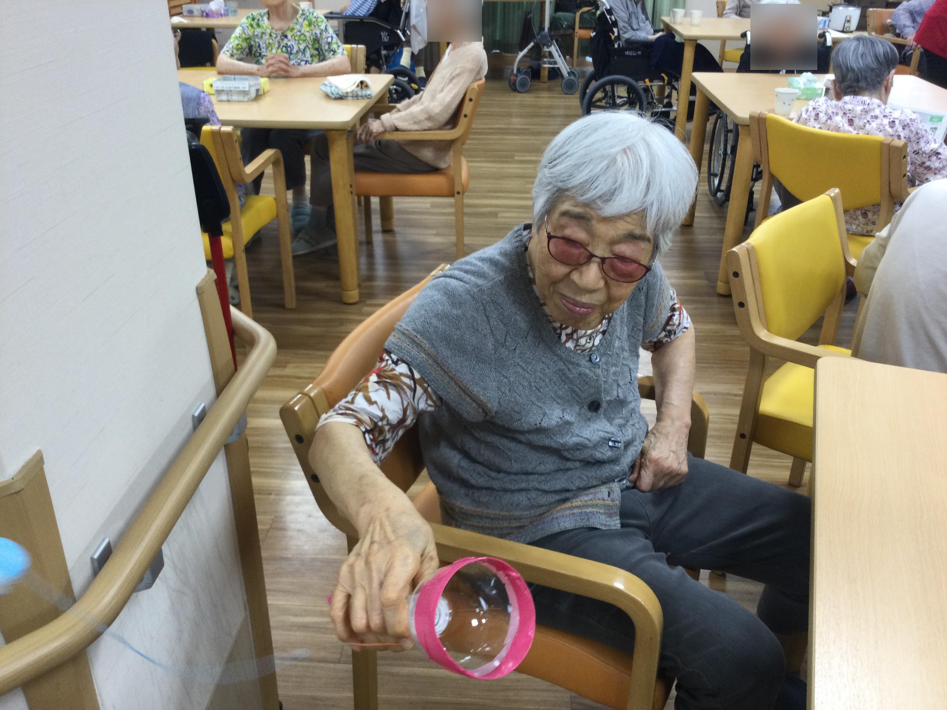 次はレクリエーションです!今月は、「手作りけん玉レク」を開催いたしました!