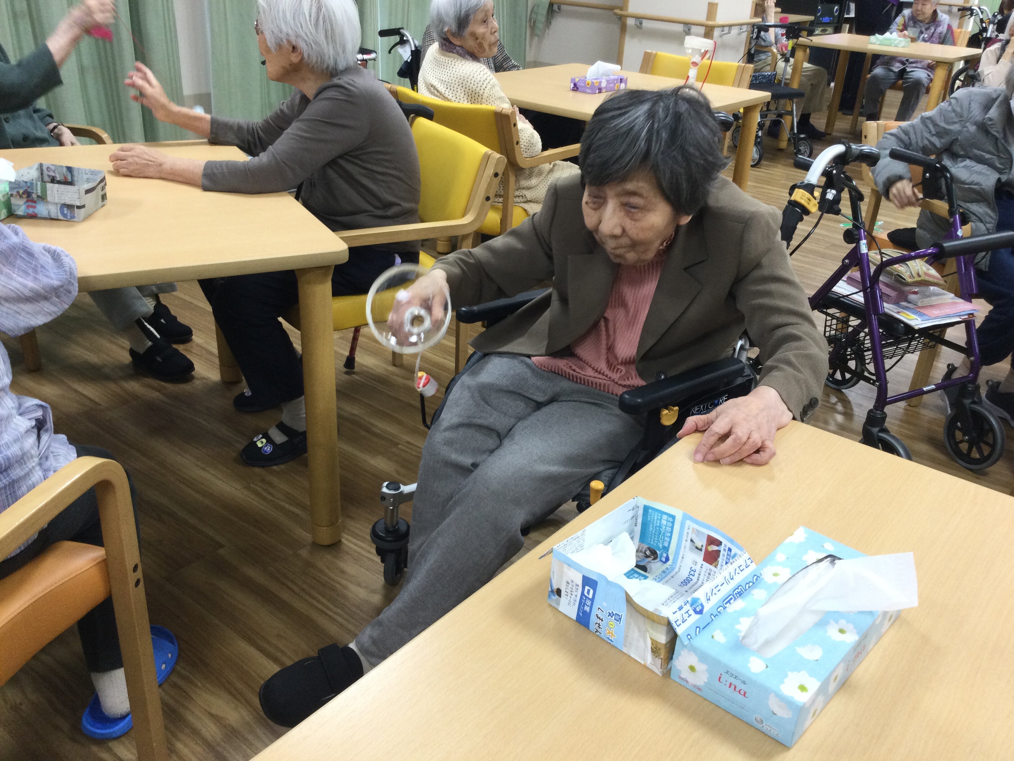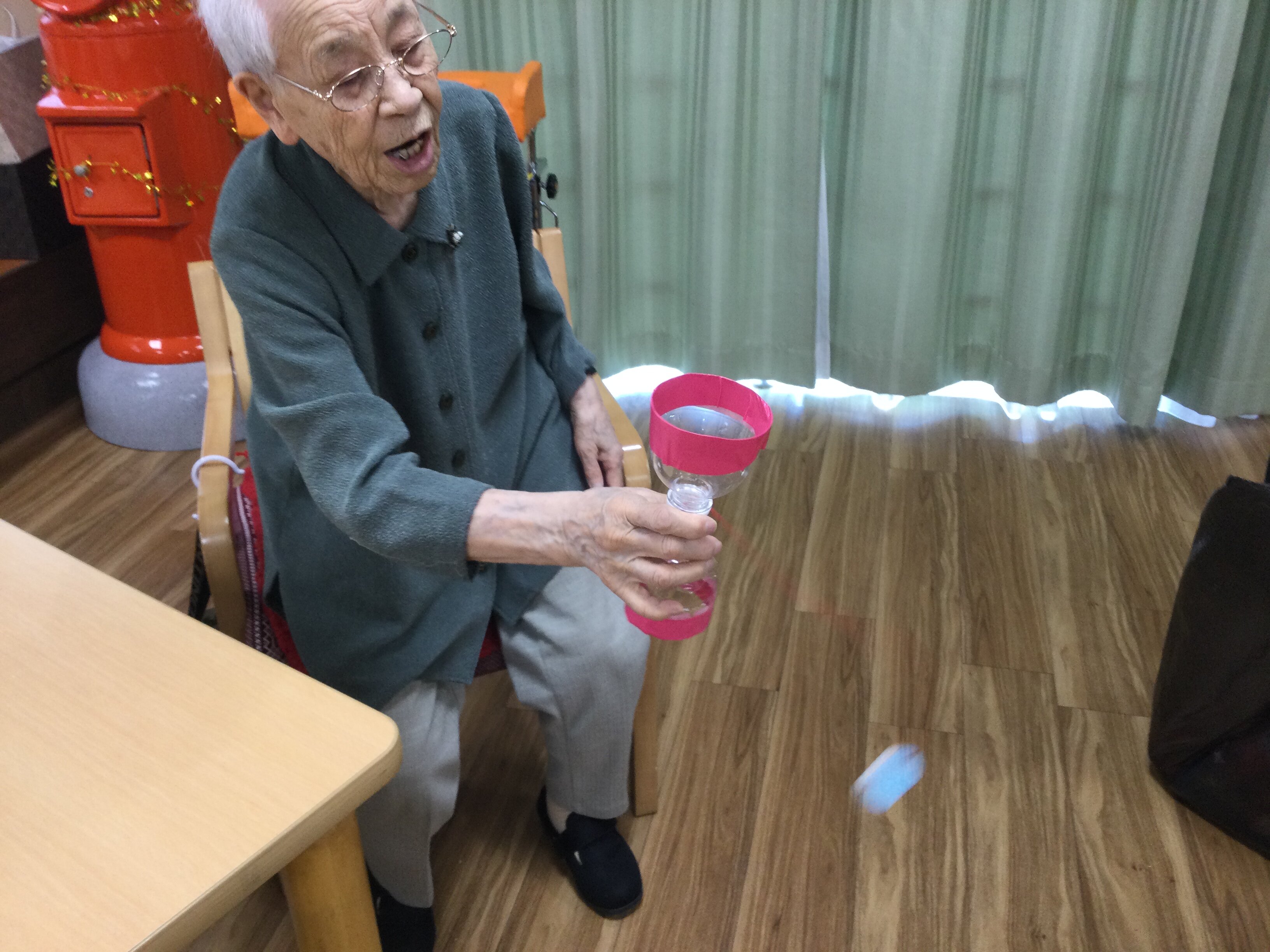 「あ~入らん!」「けん玉なんて久しぶりね」「意外と入らないもんやな~」「職員さんが作ったんか!よーできとるなあ、」など、、