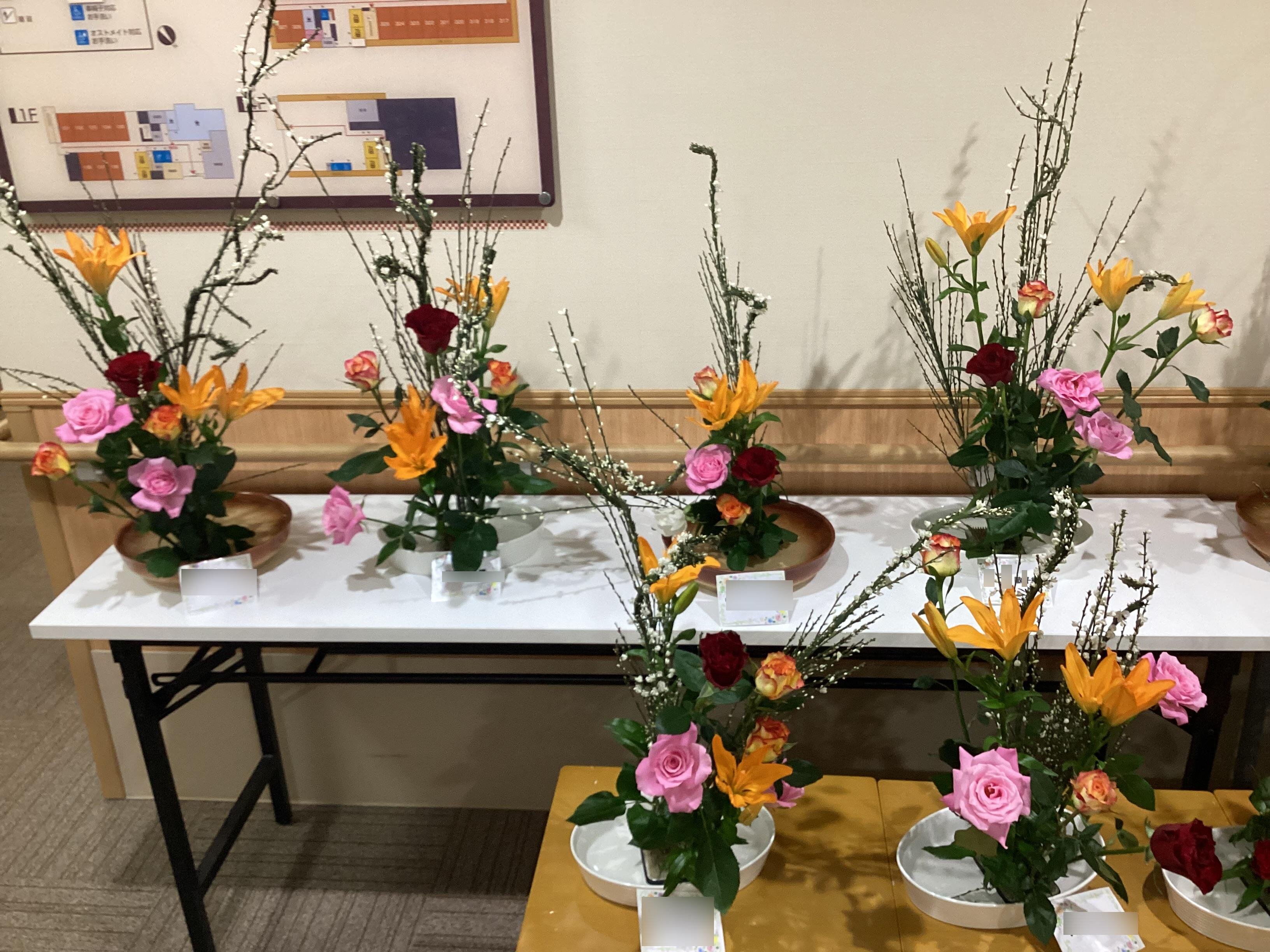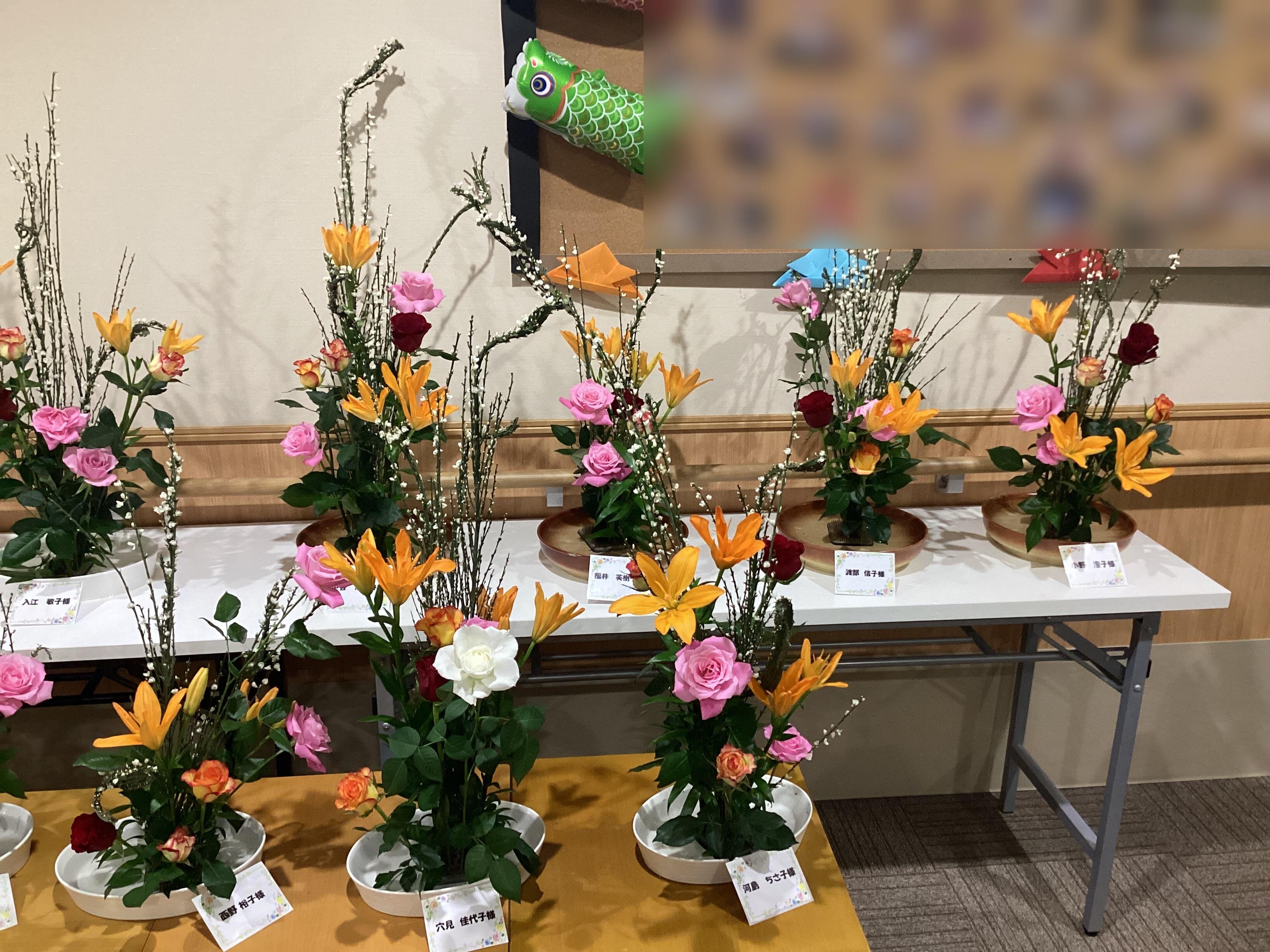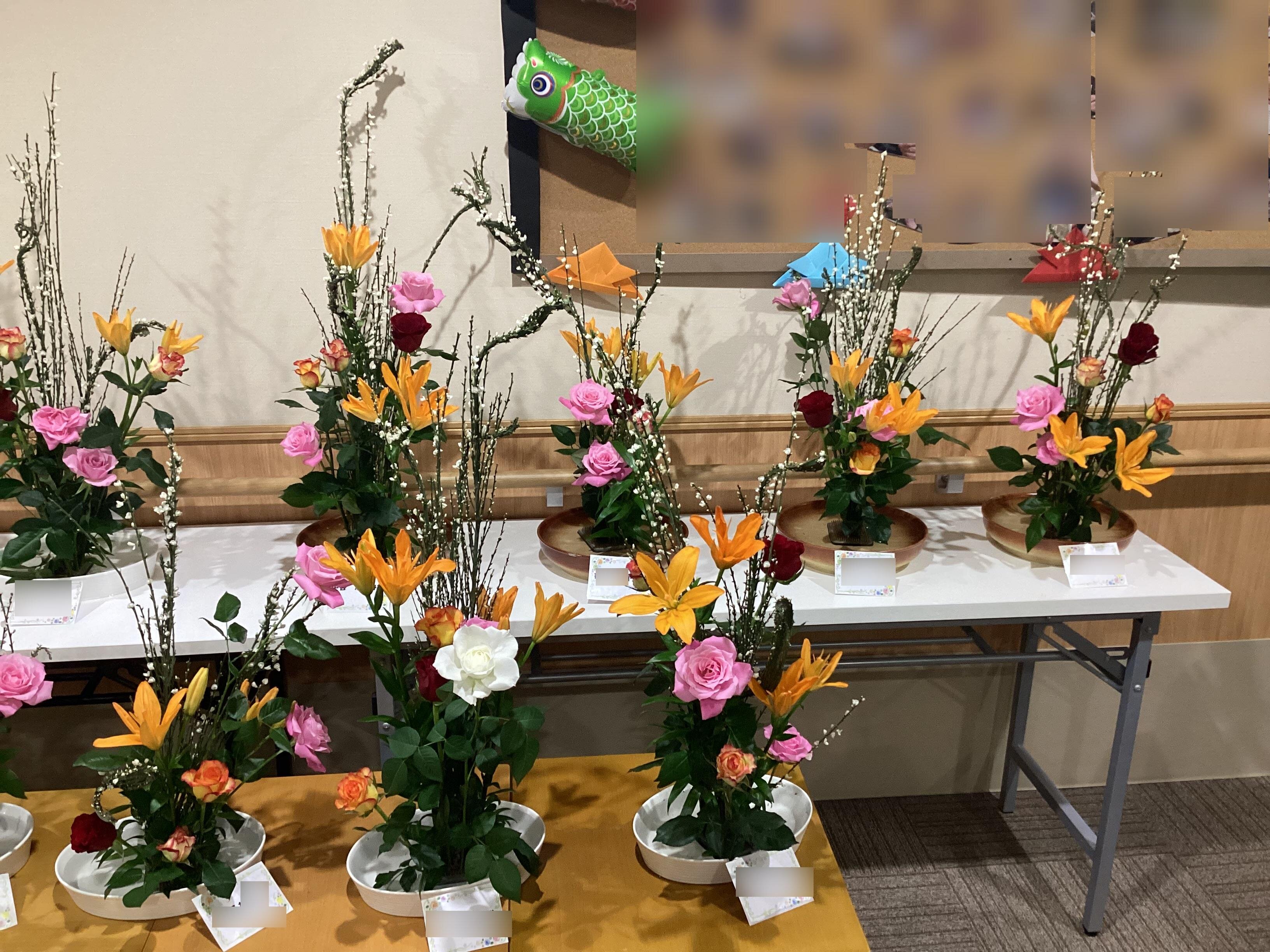 花器に合わせ、花々の色の配色や調和を考えながらの生け花は、とても楽しいひと時でした。