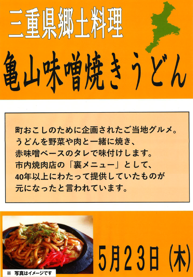 5月23日は三重県の郷土料理「亀山味噌焼きうどん」を提供させていただきます!