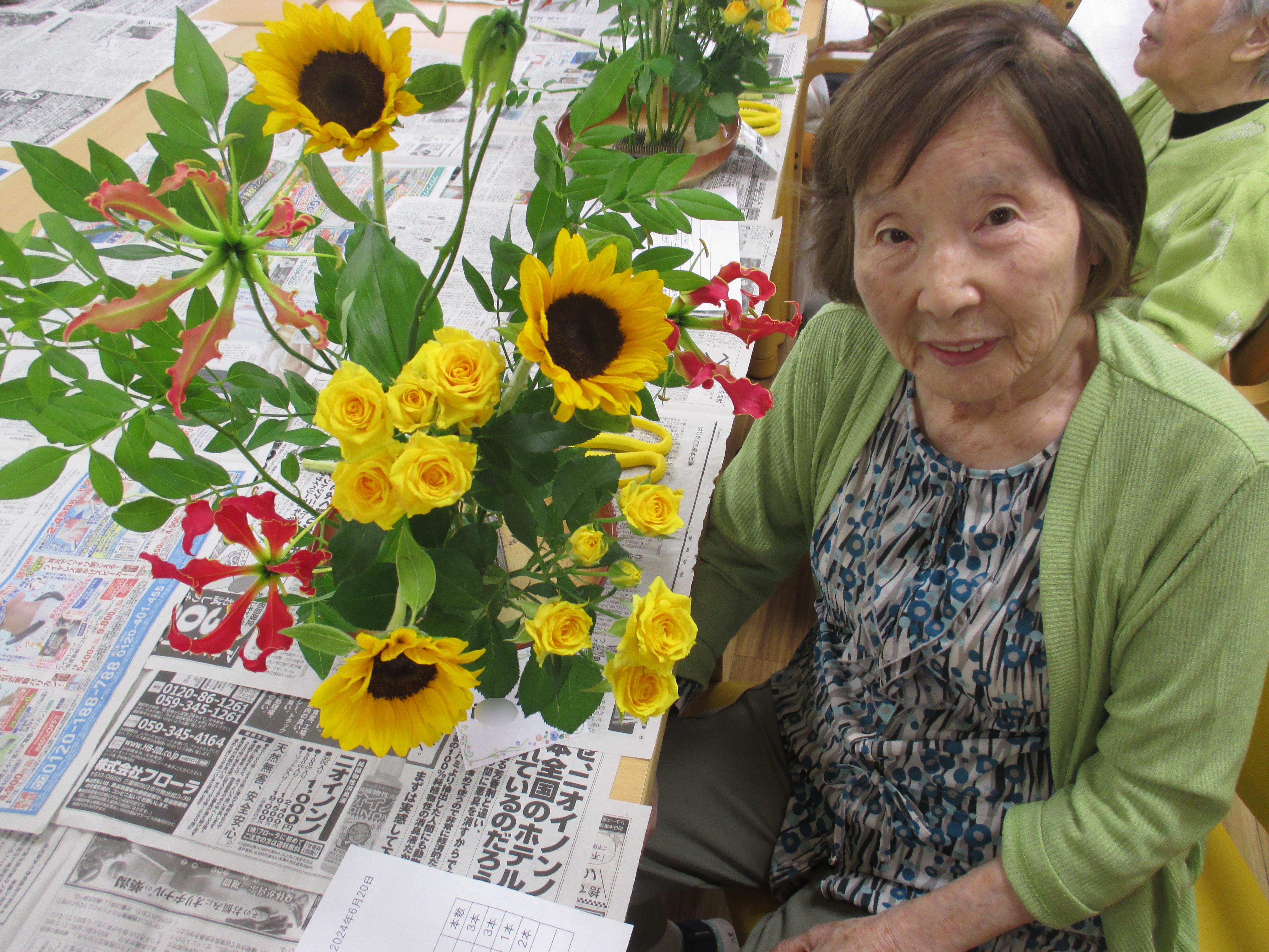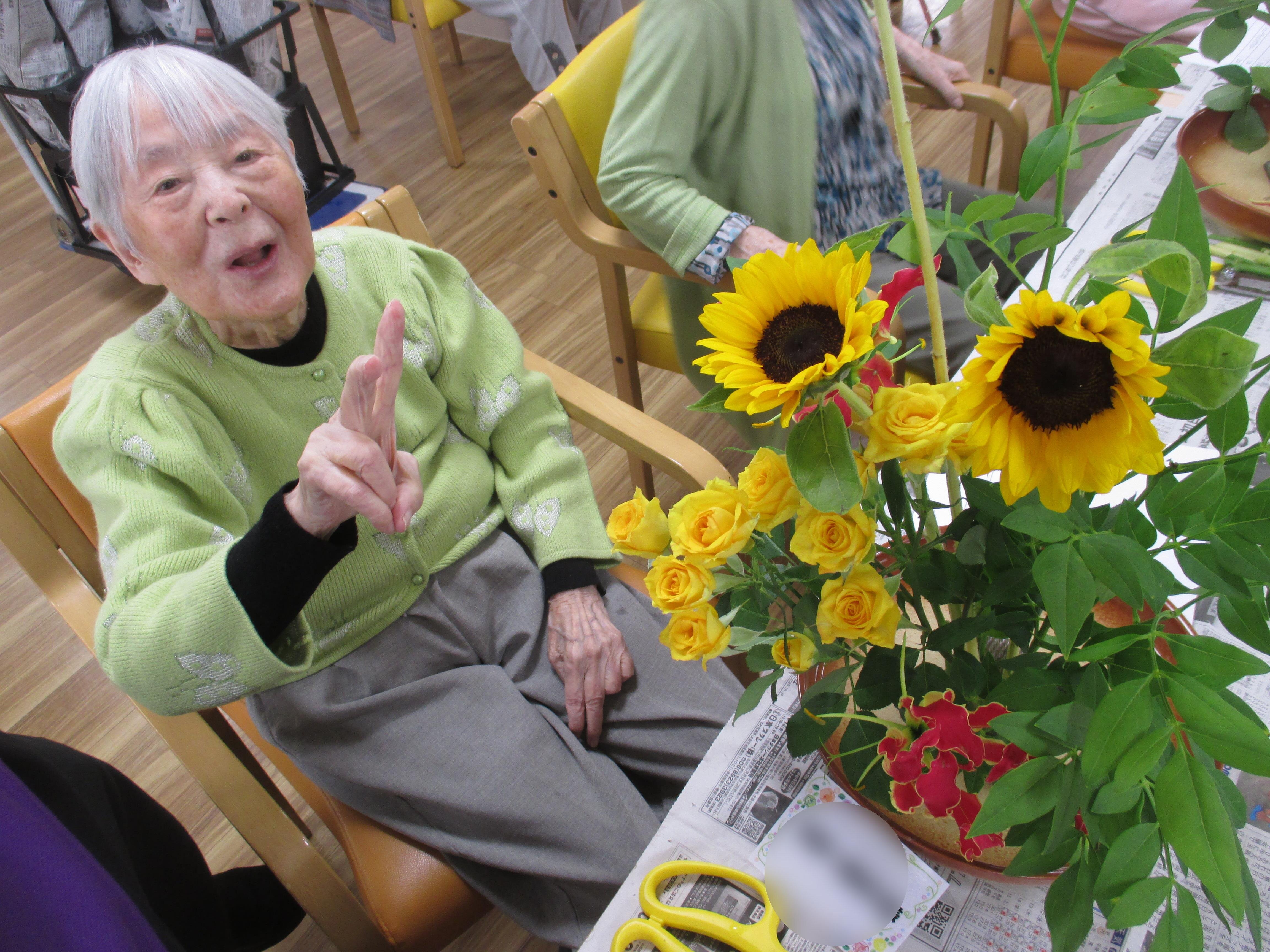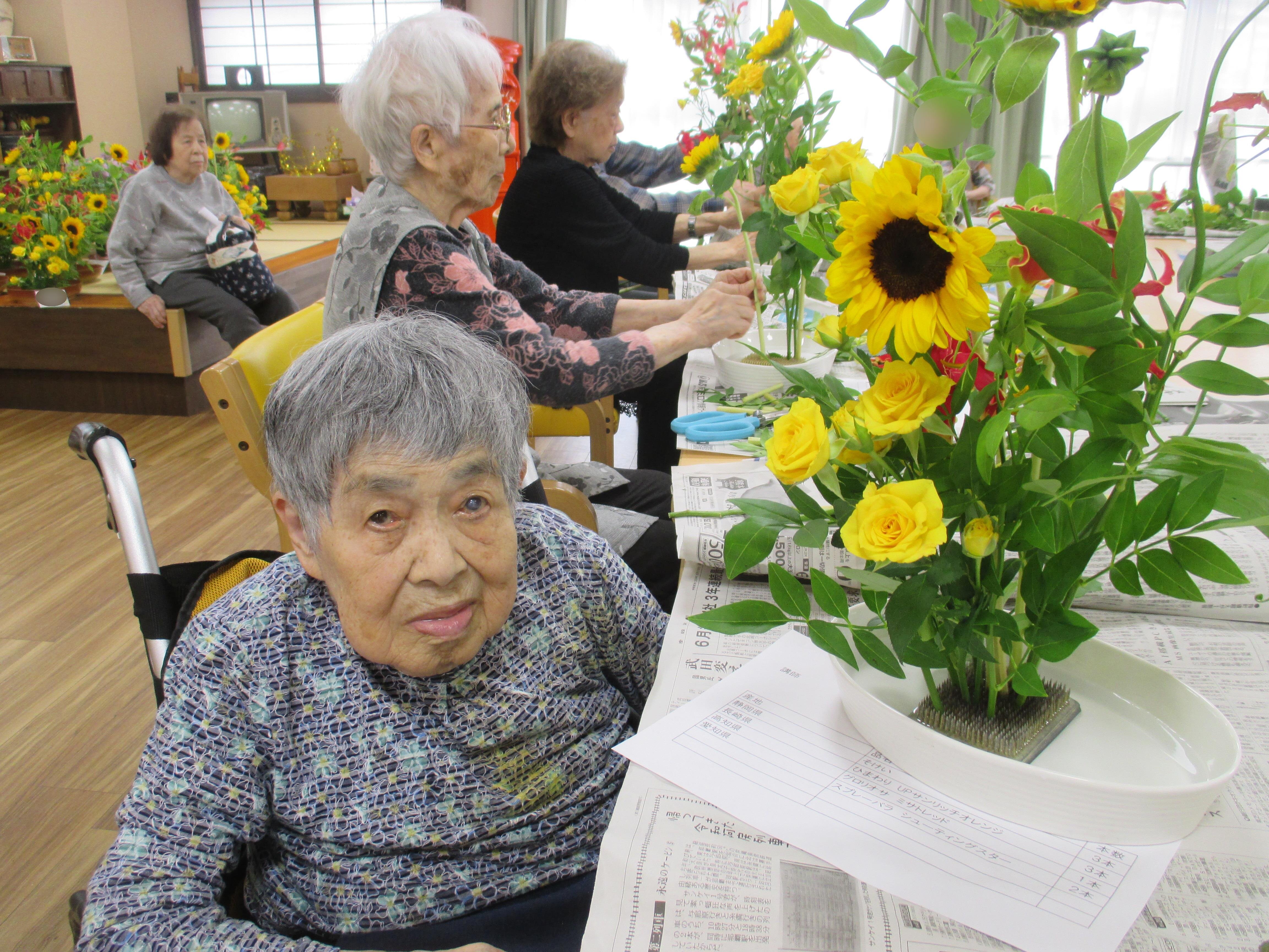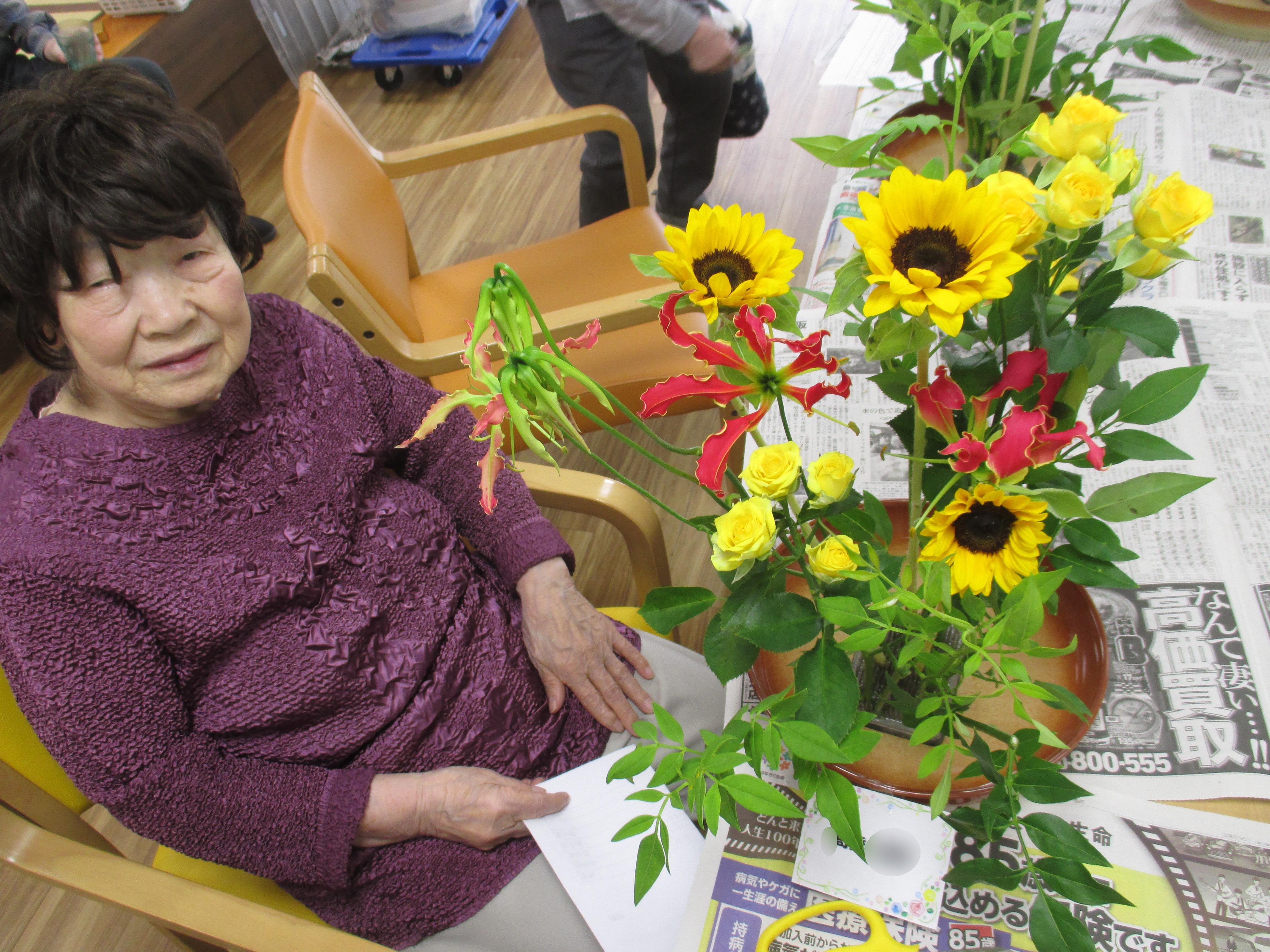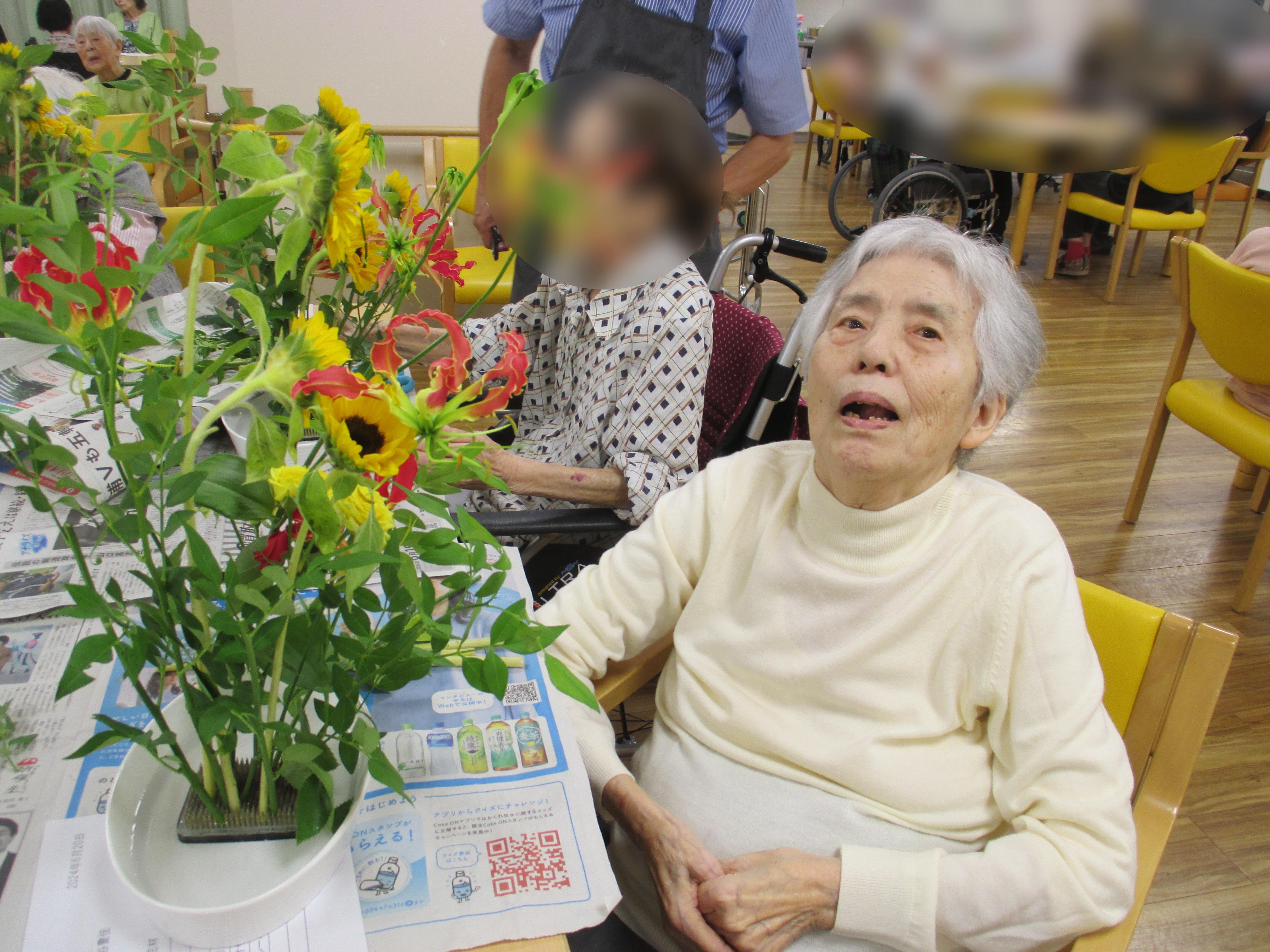 今回の生け花は座っているご入所者よりも大きなひまわりが目立ちますねー!