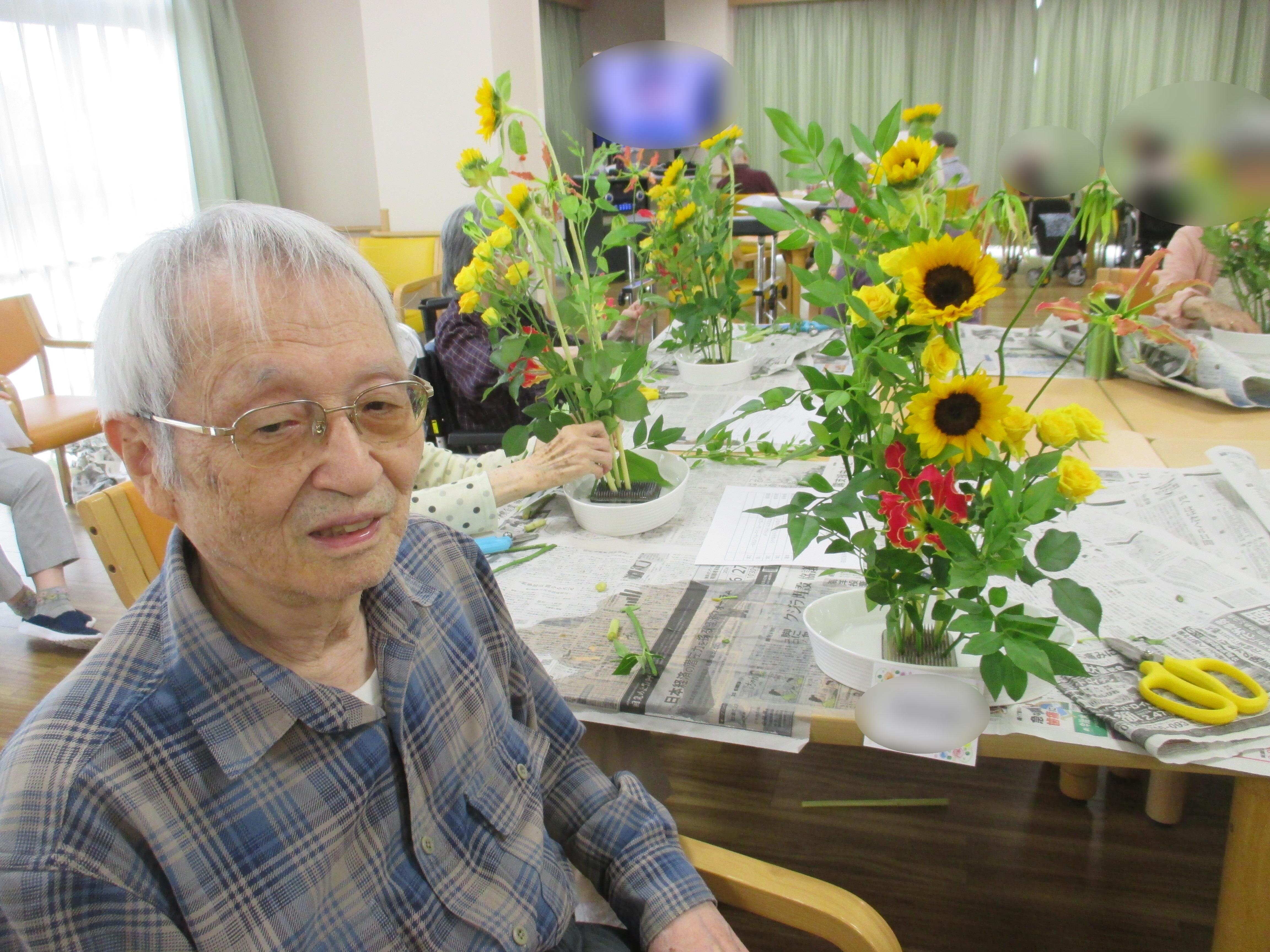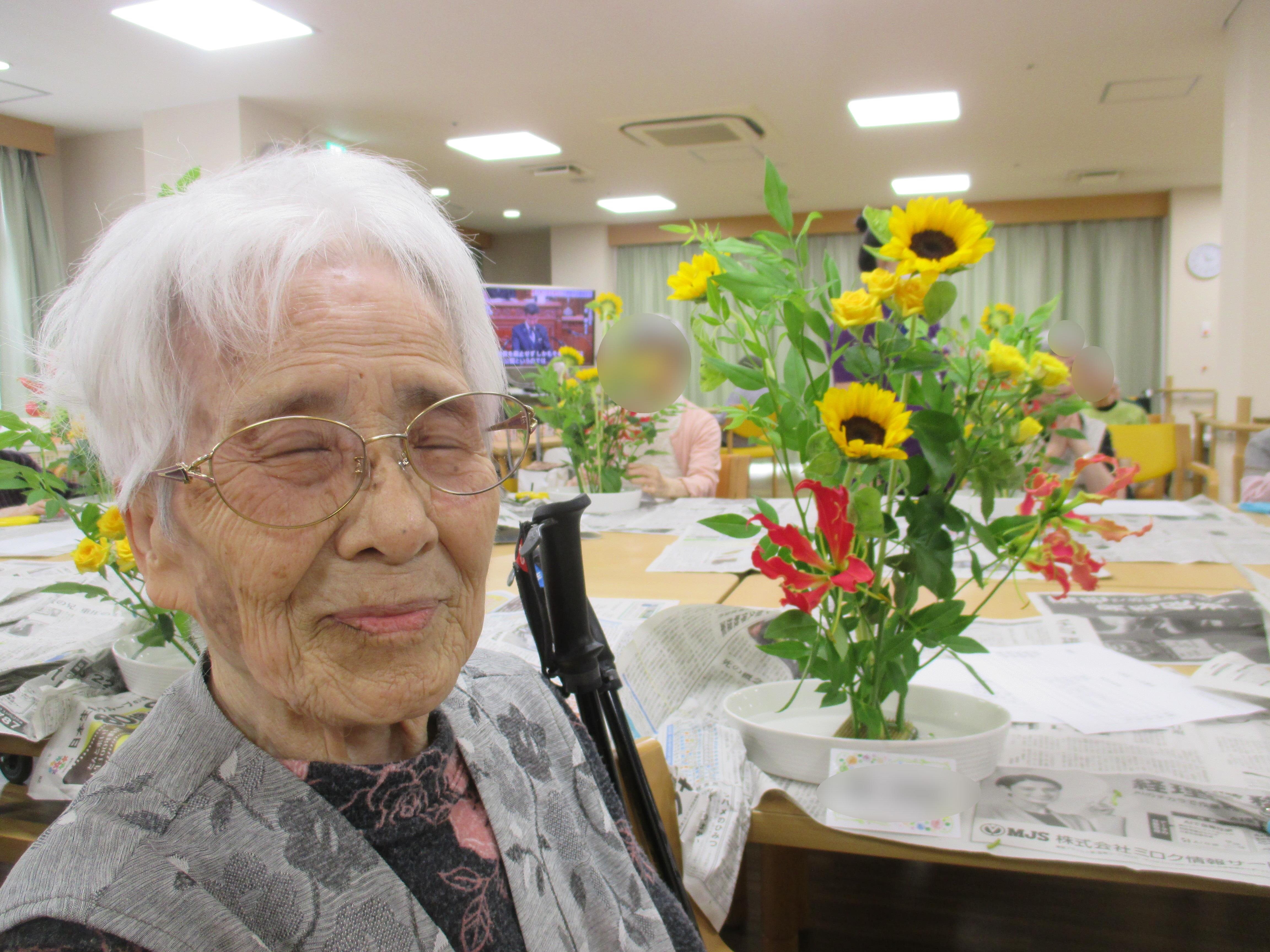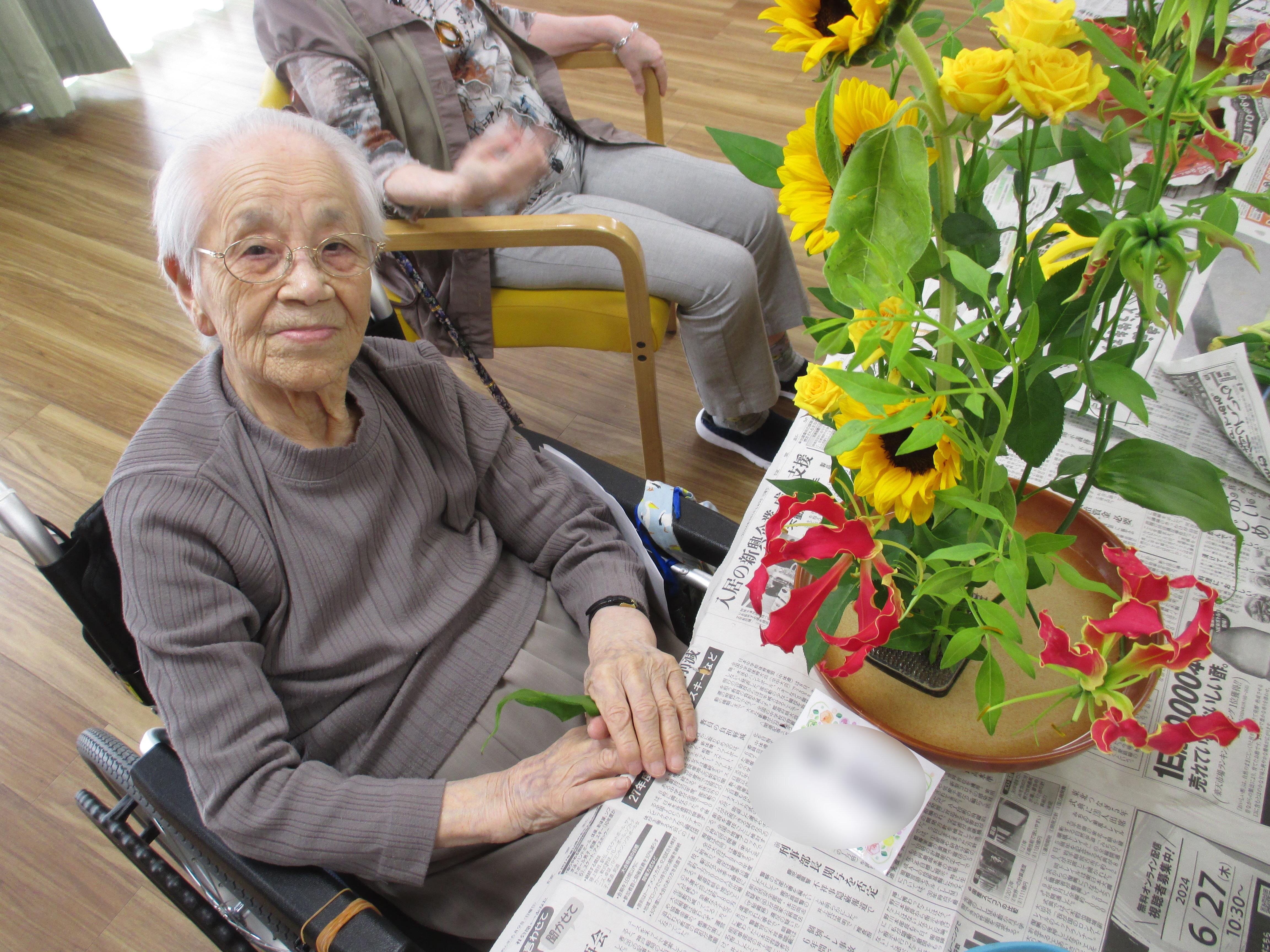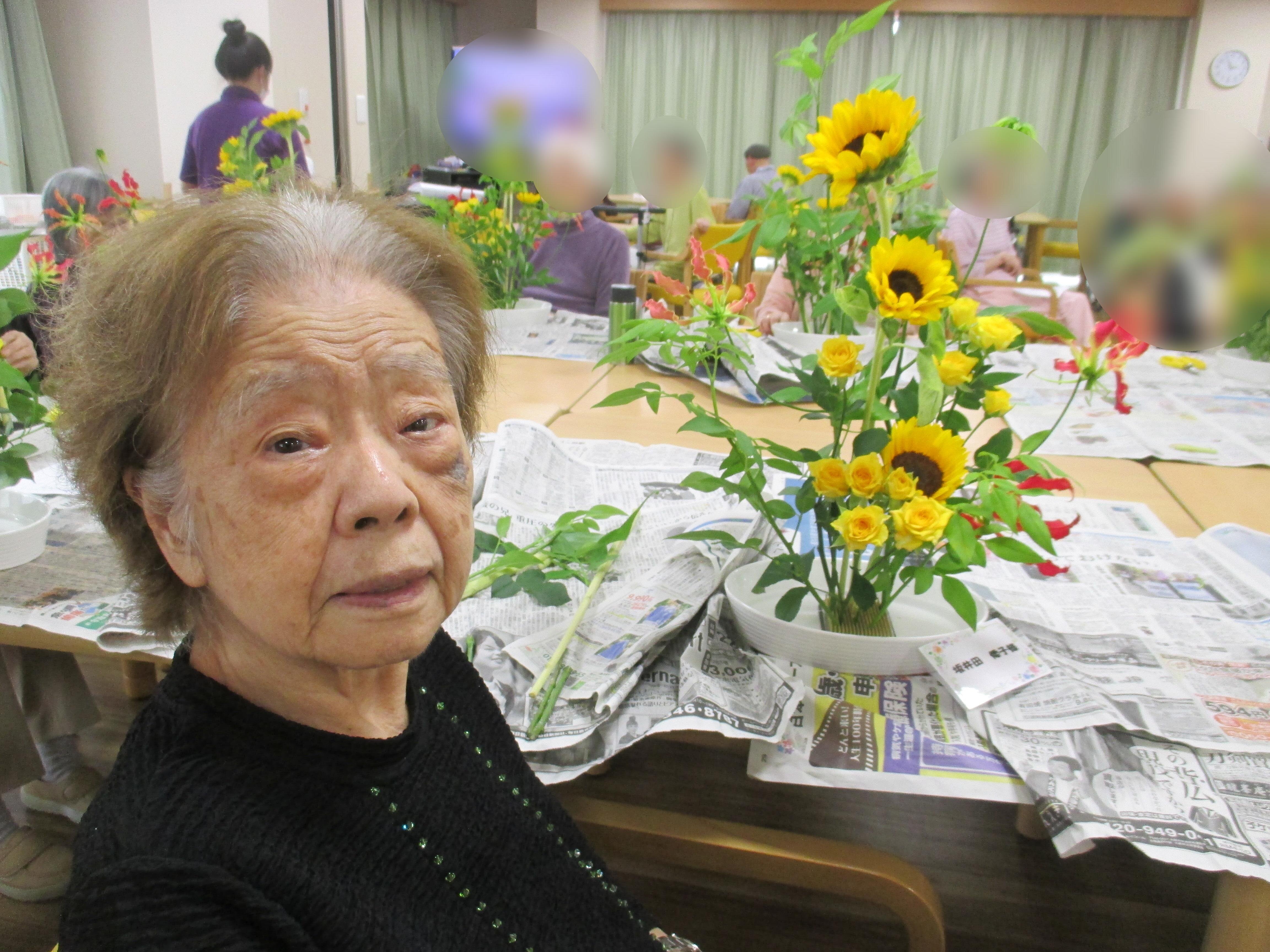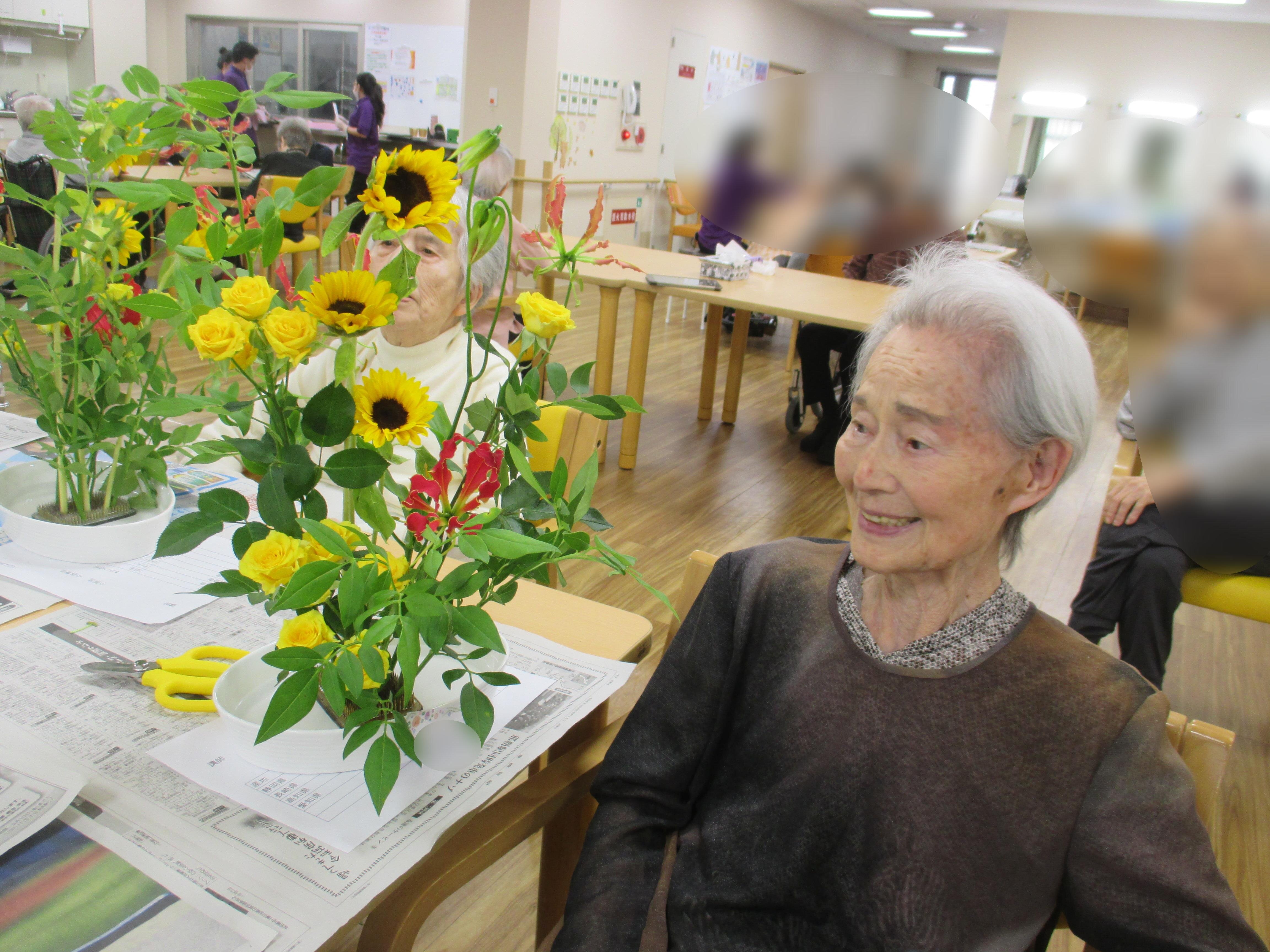 今回の生け花は座っているご入所者よりも大きなひまわりが目立ちますねー!