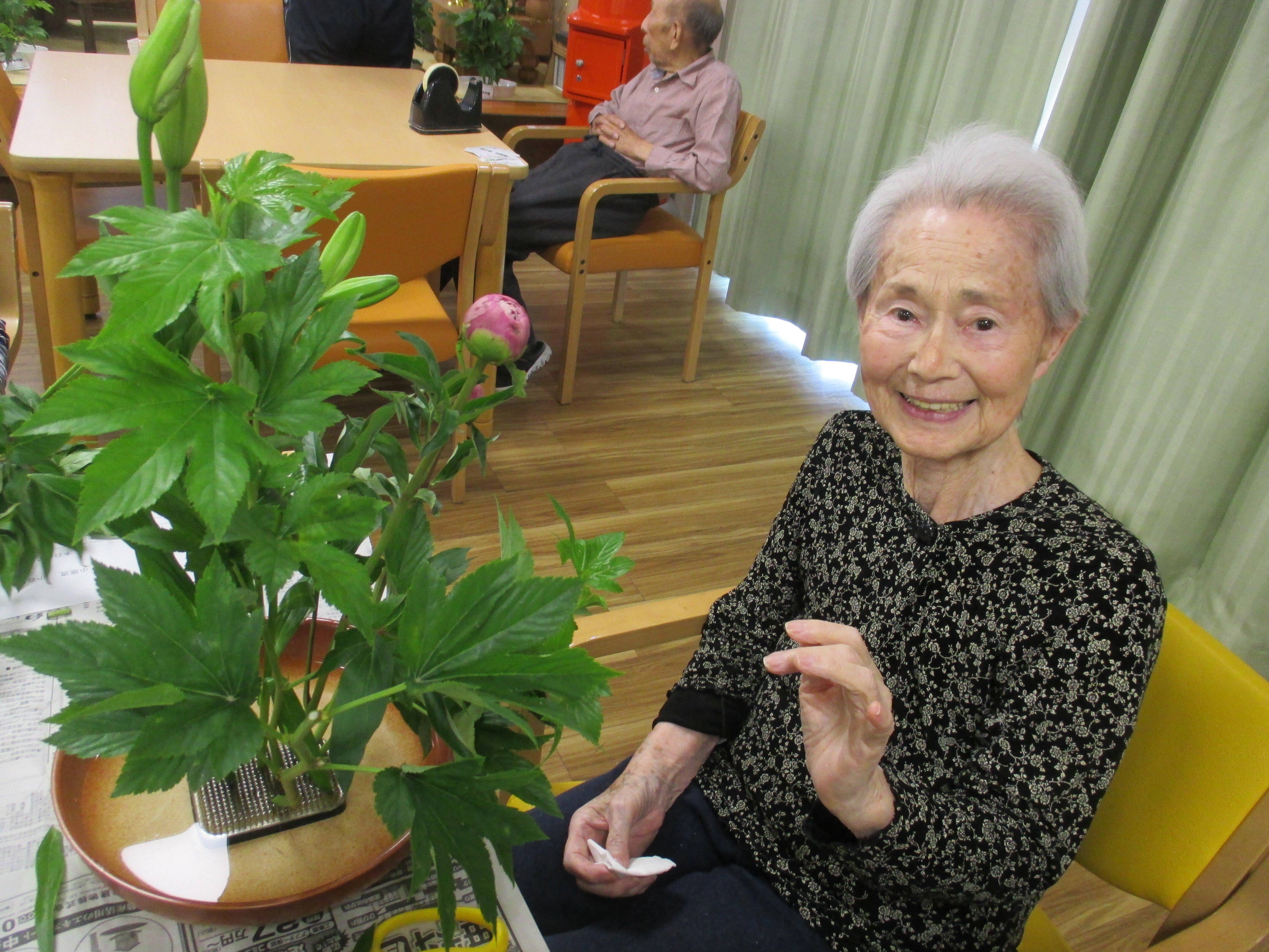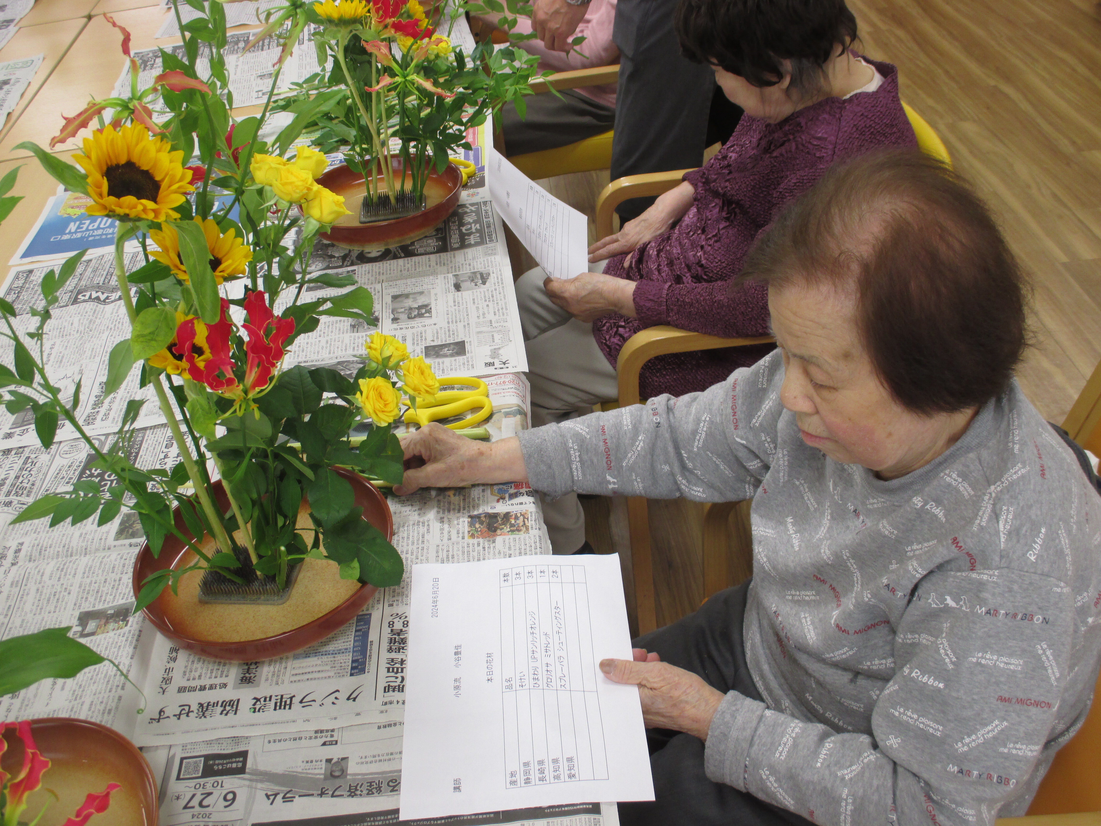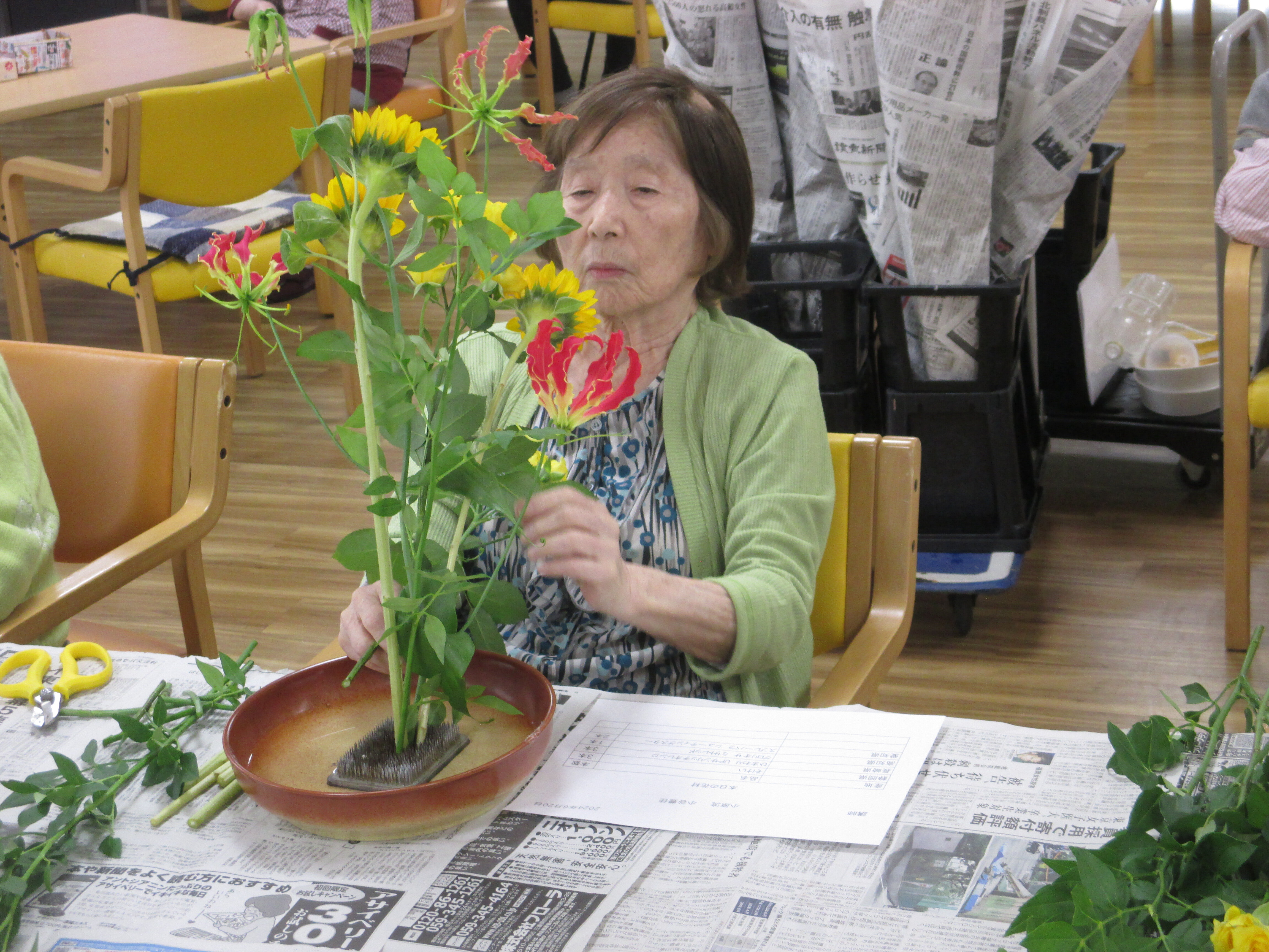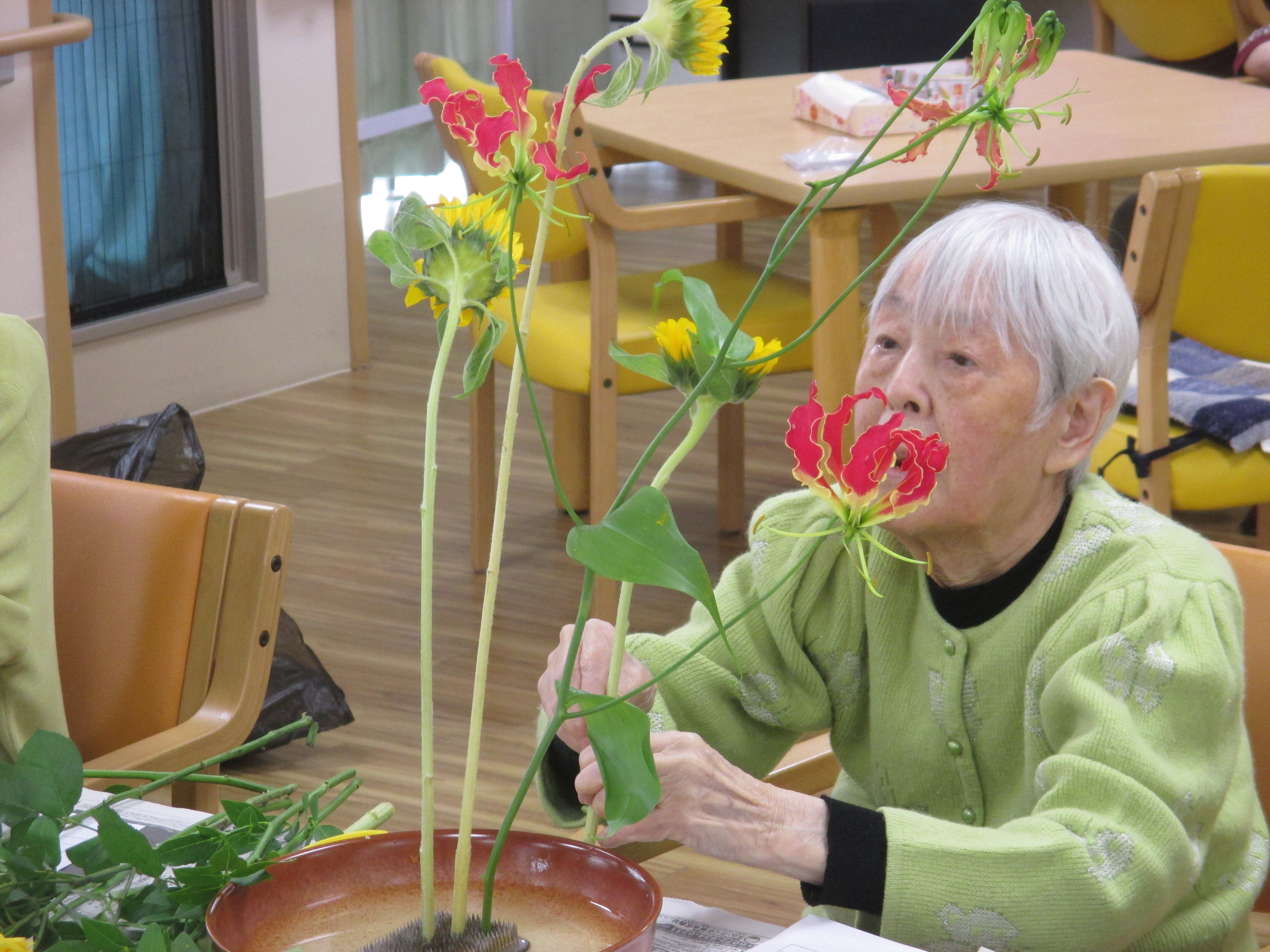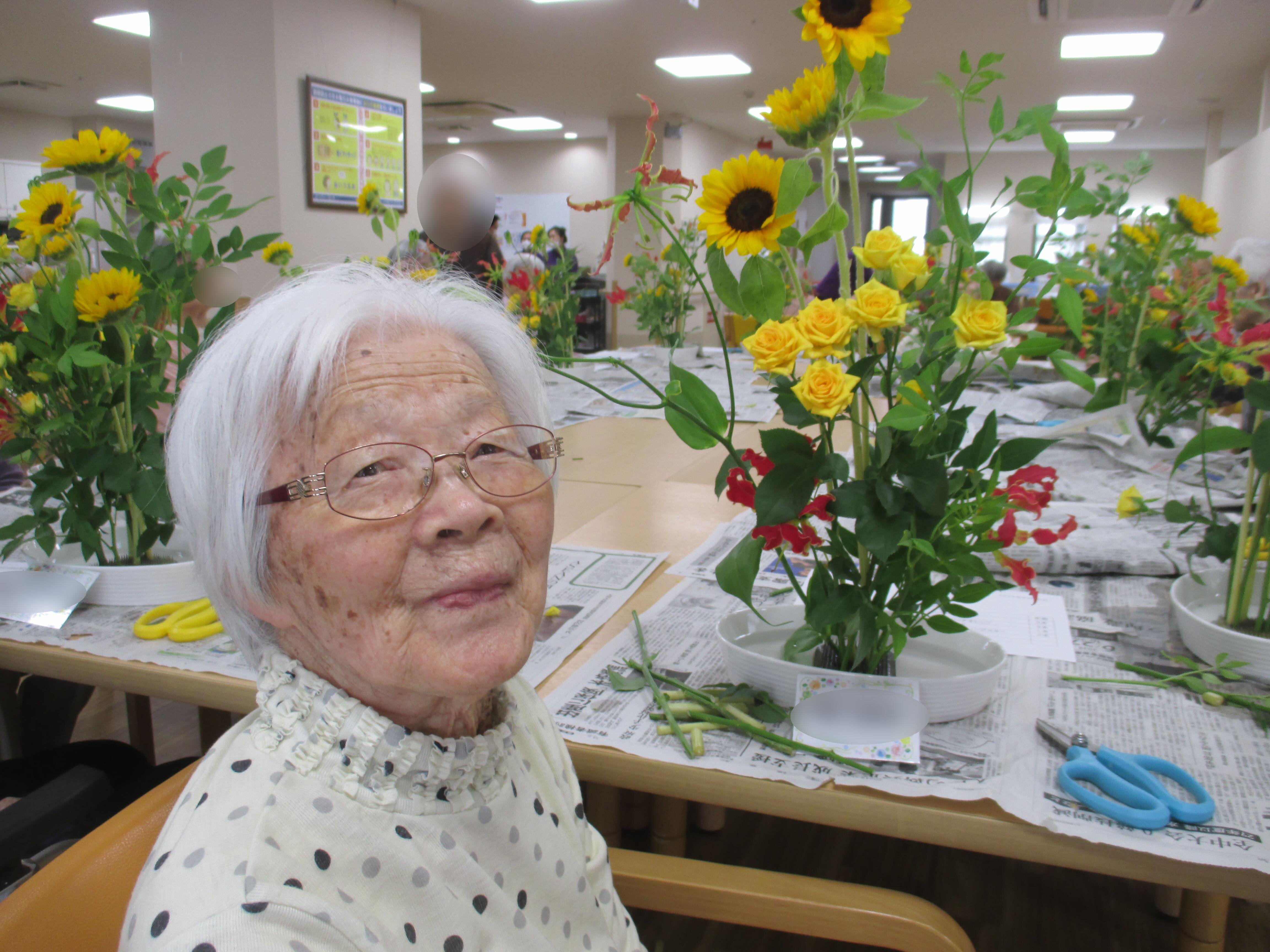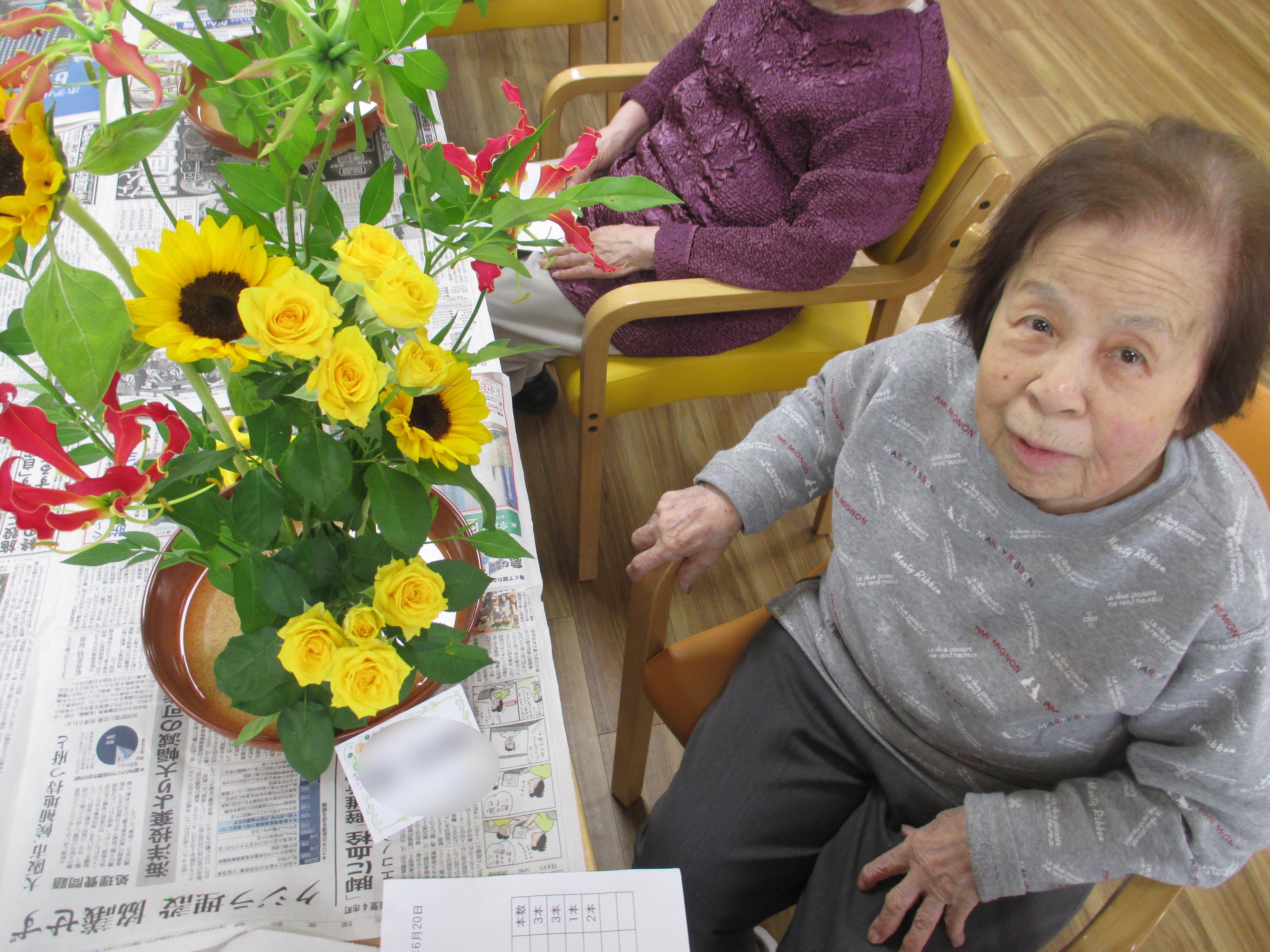 今回の生け花は座っているご入所者よりも大きなひまわりが目立ちますねー!