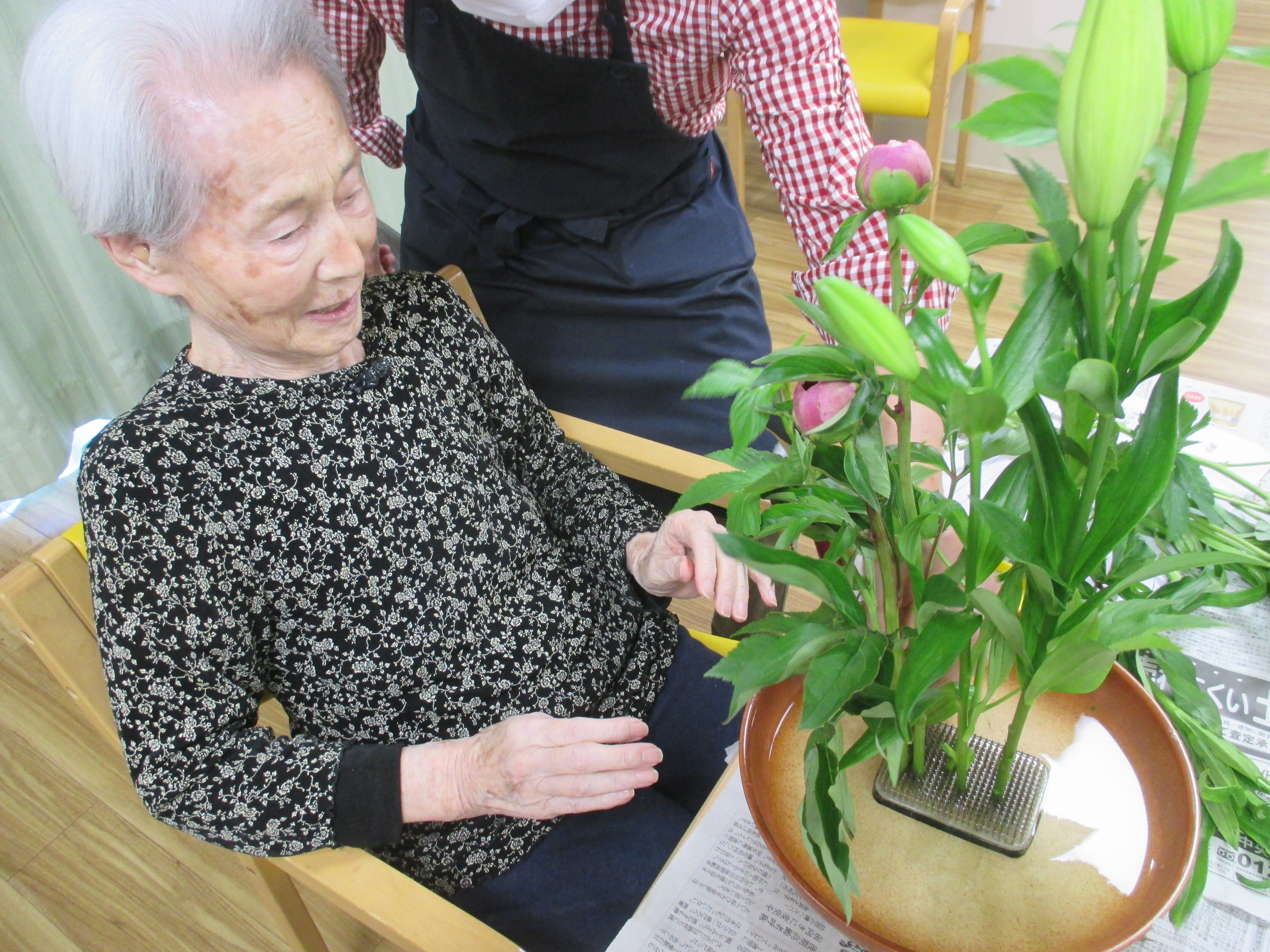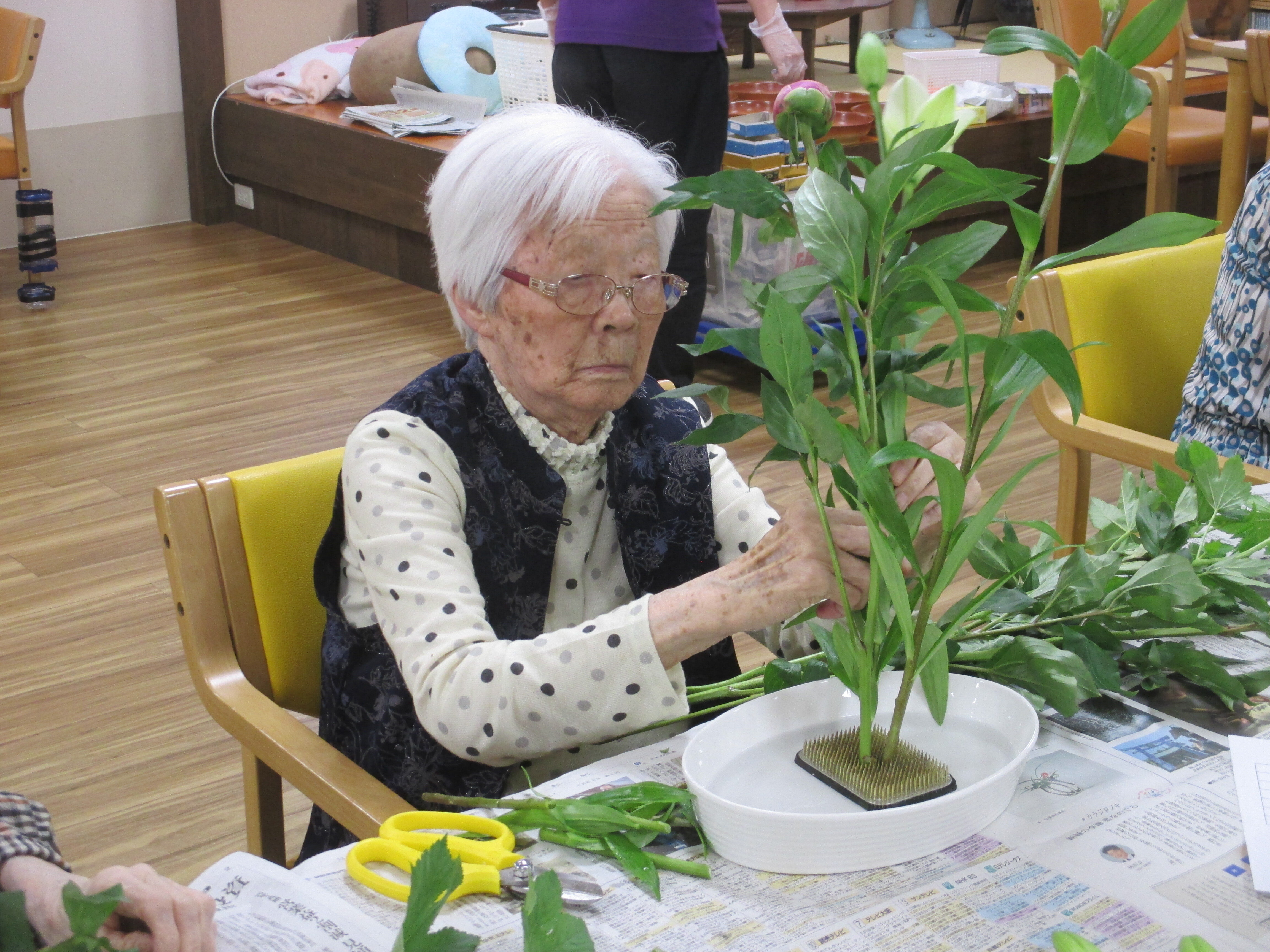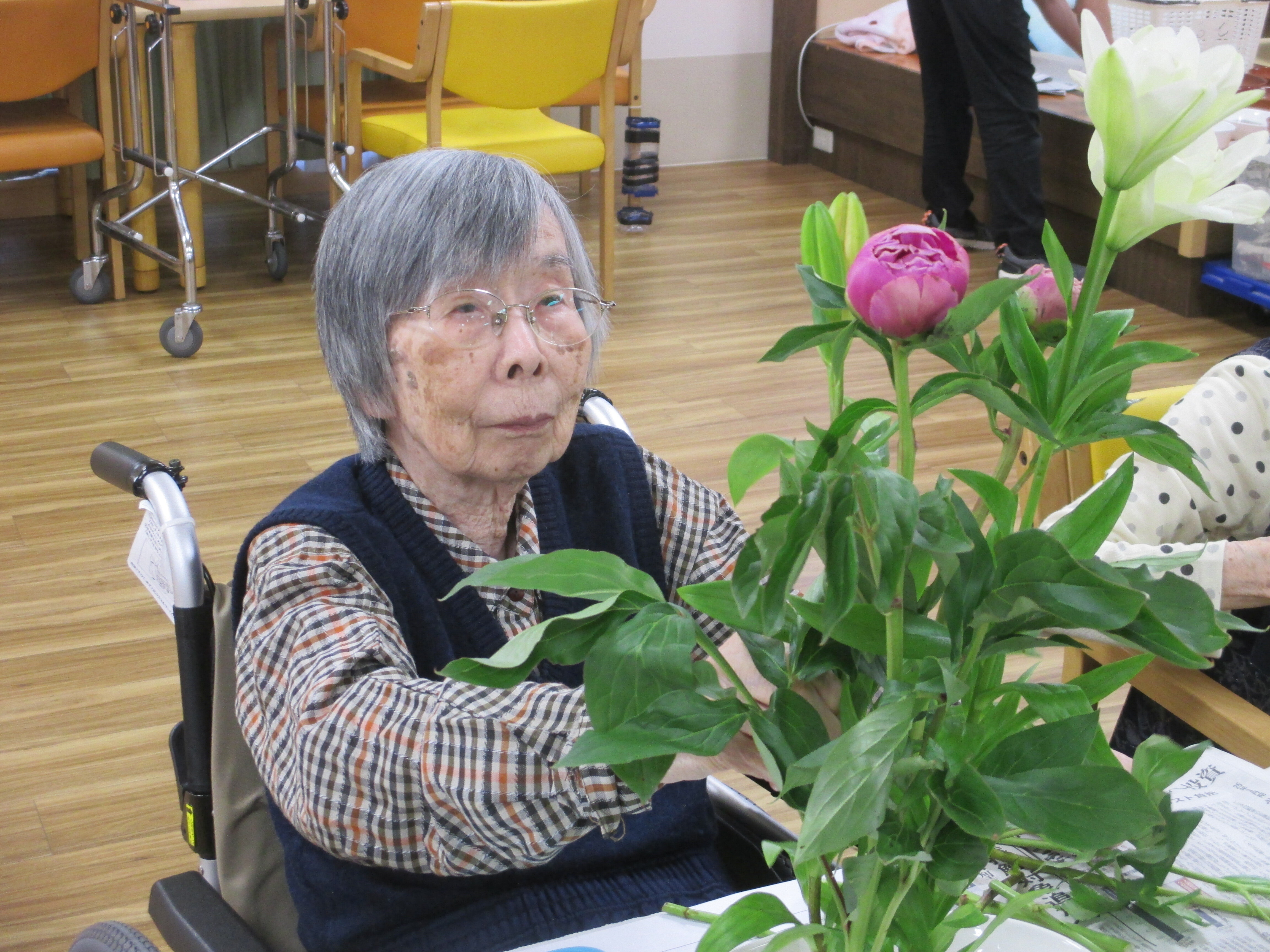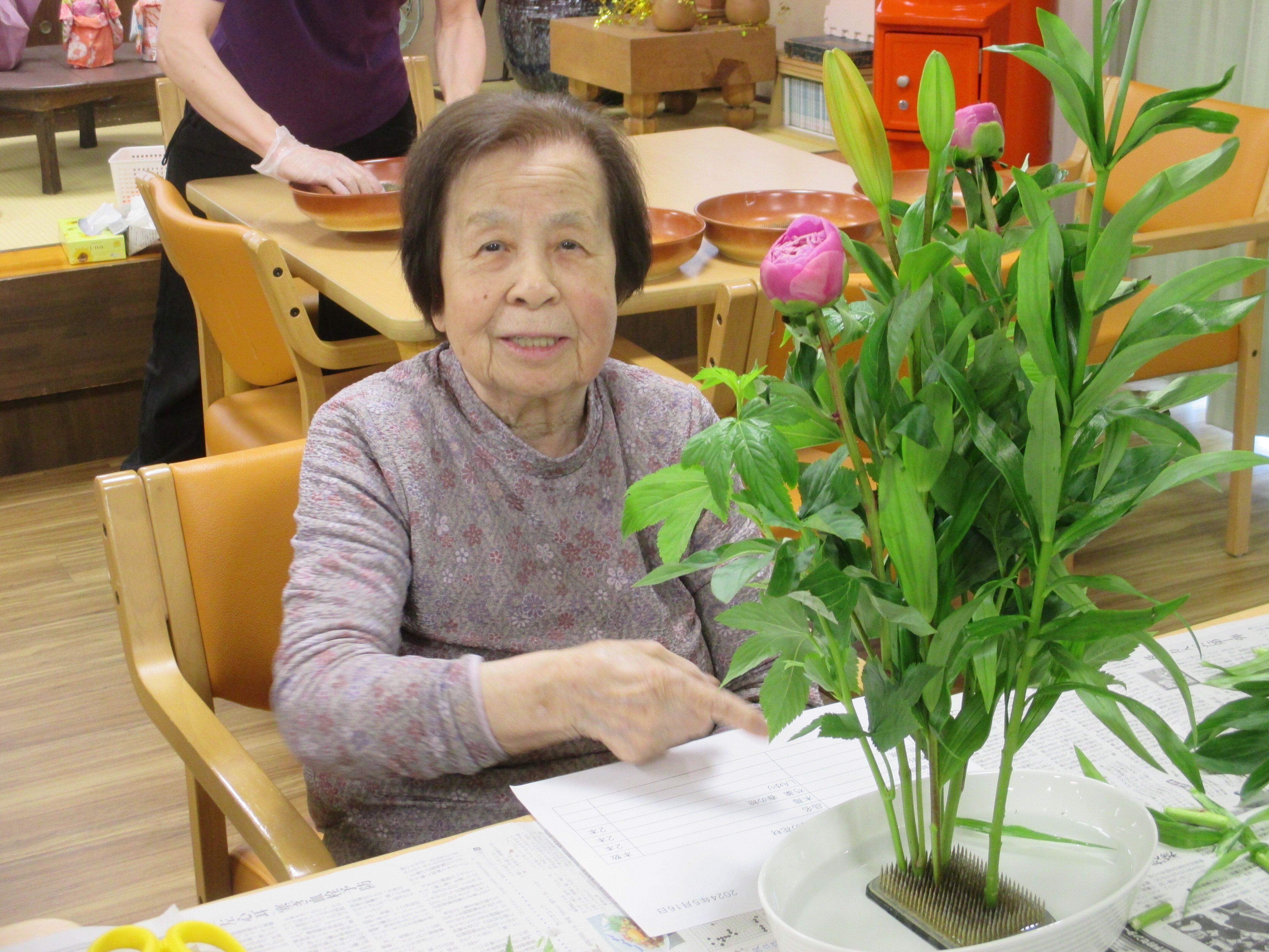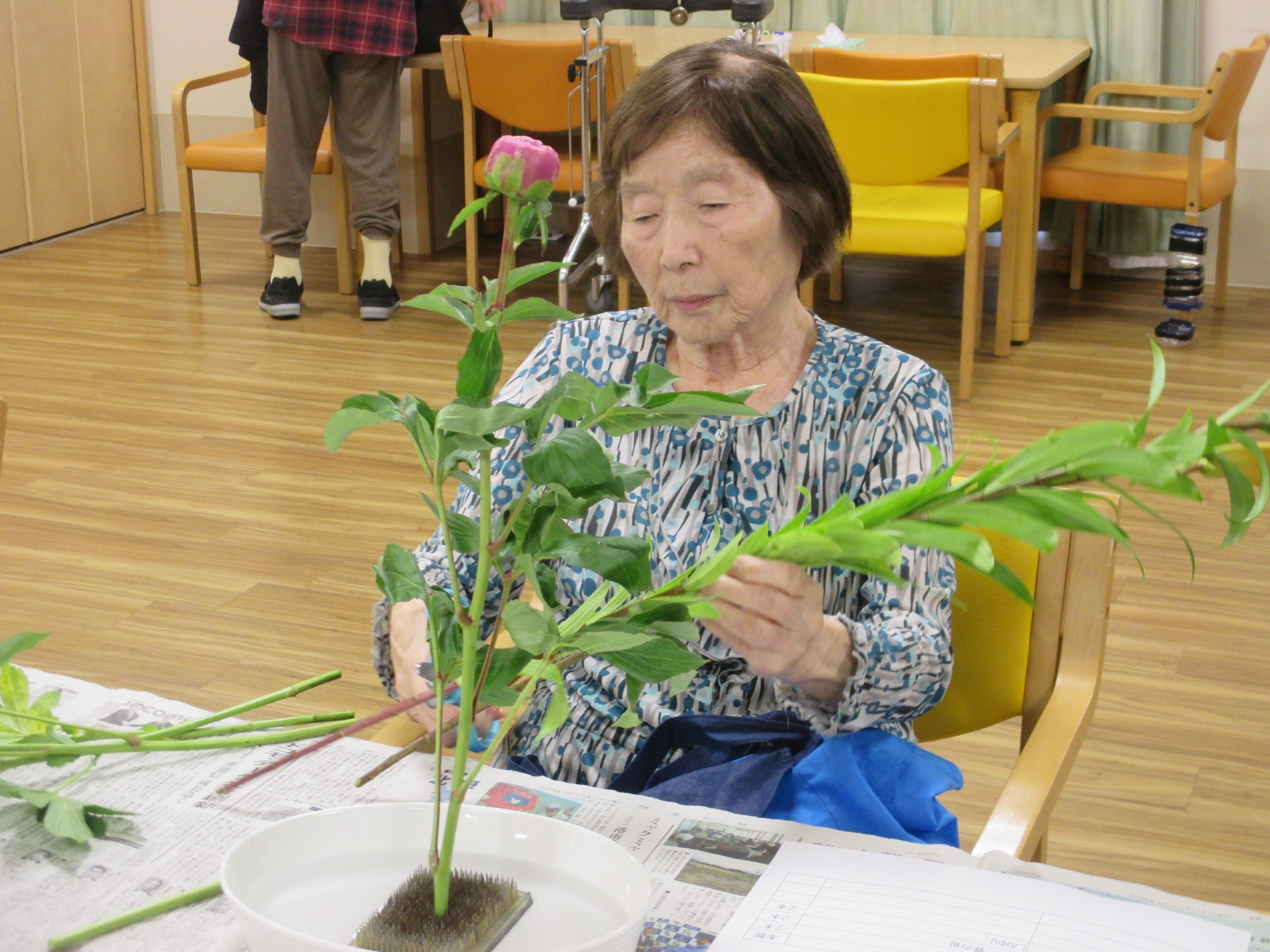 今回の生け花は座っているご入所者よりも大きなひまわりが目立ちますねー!