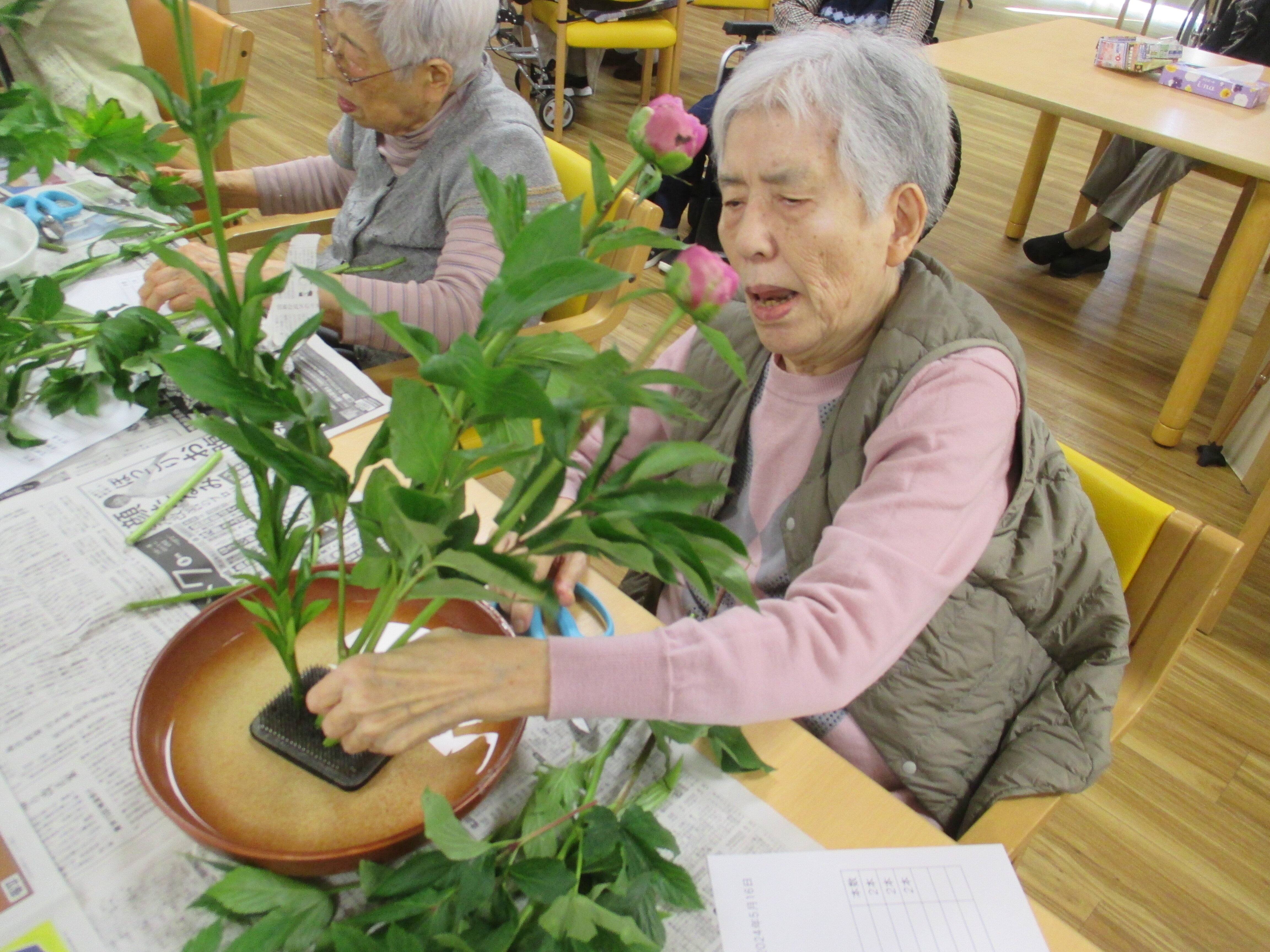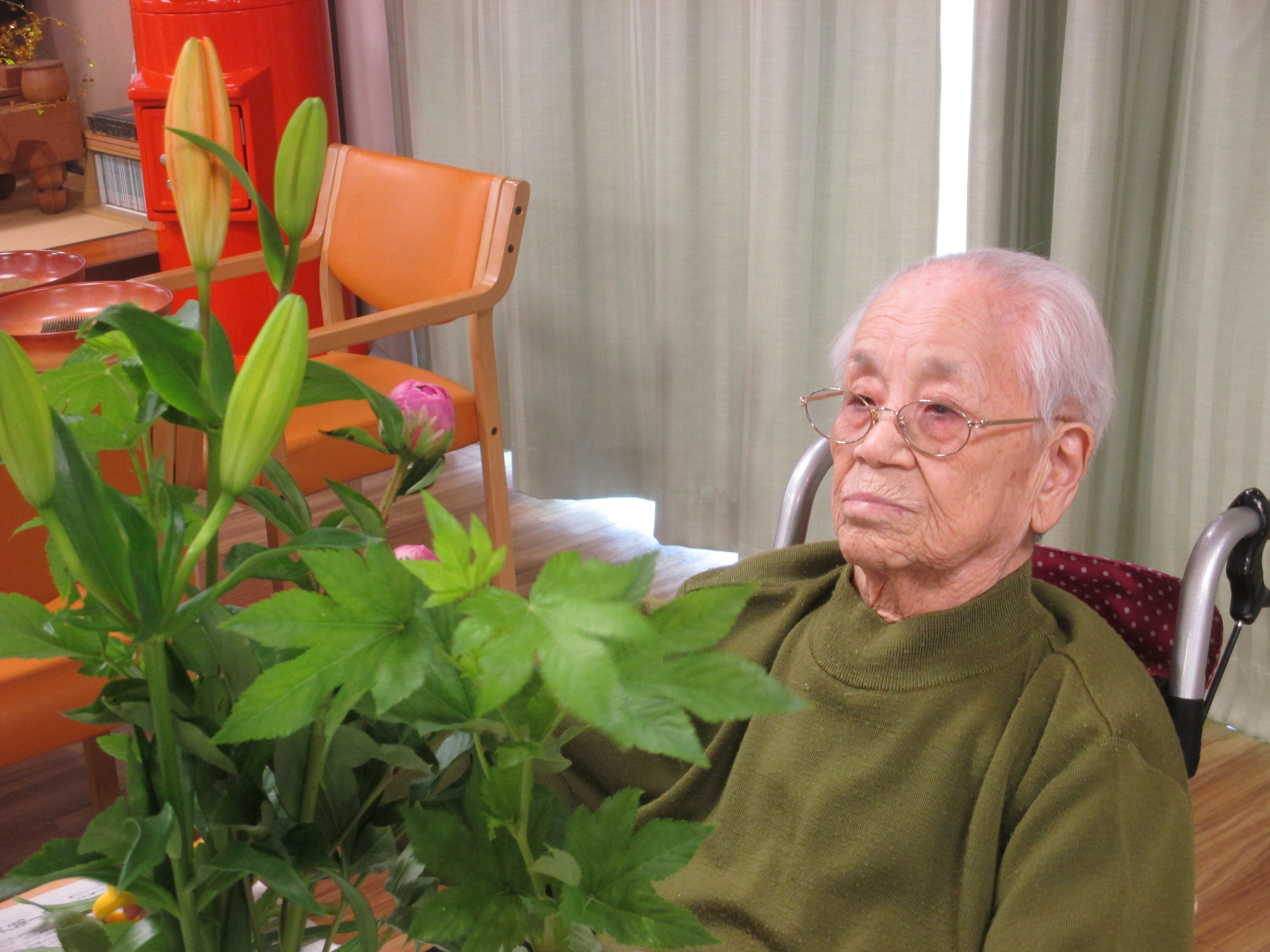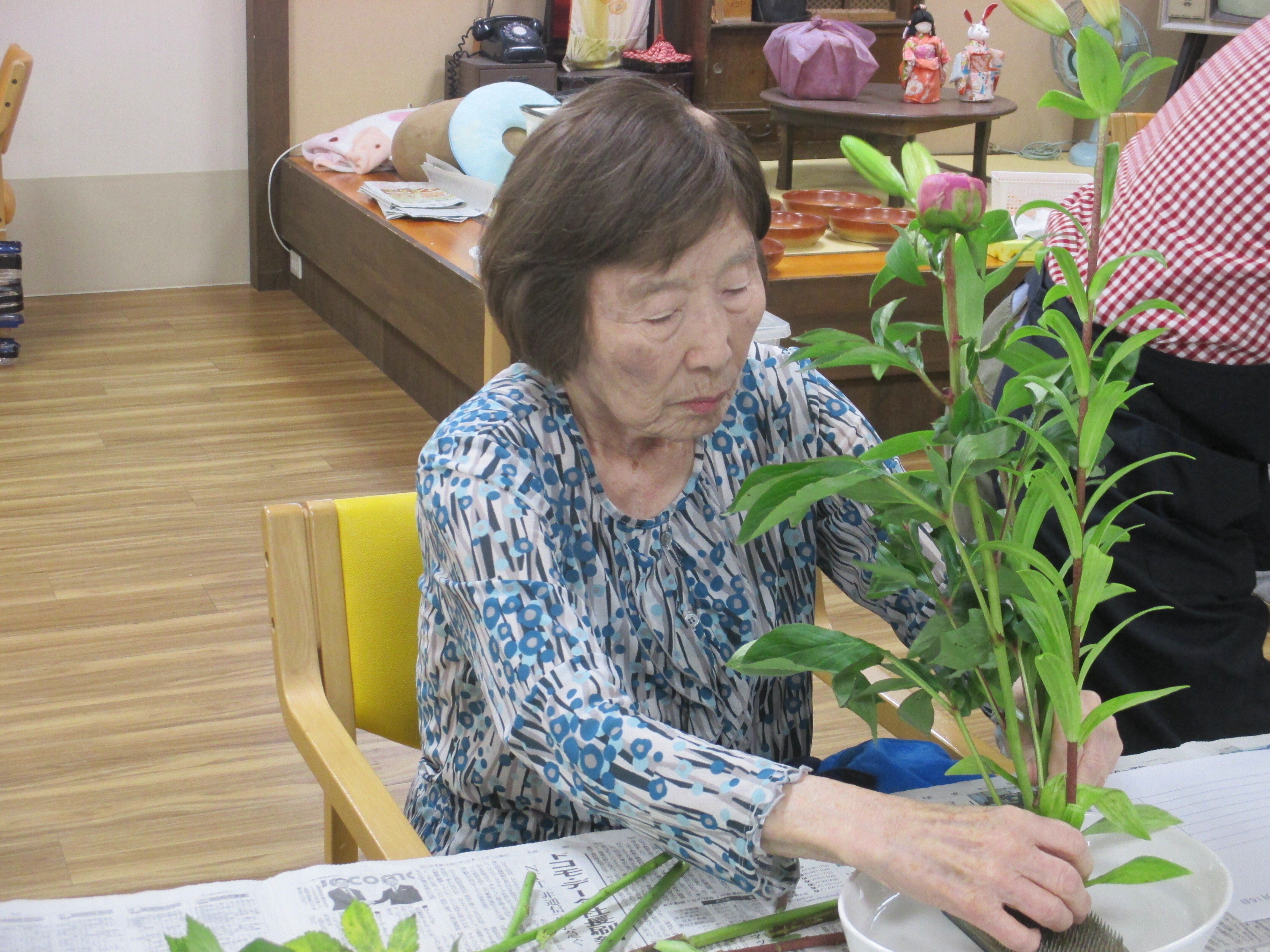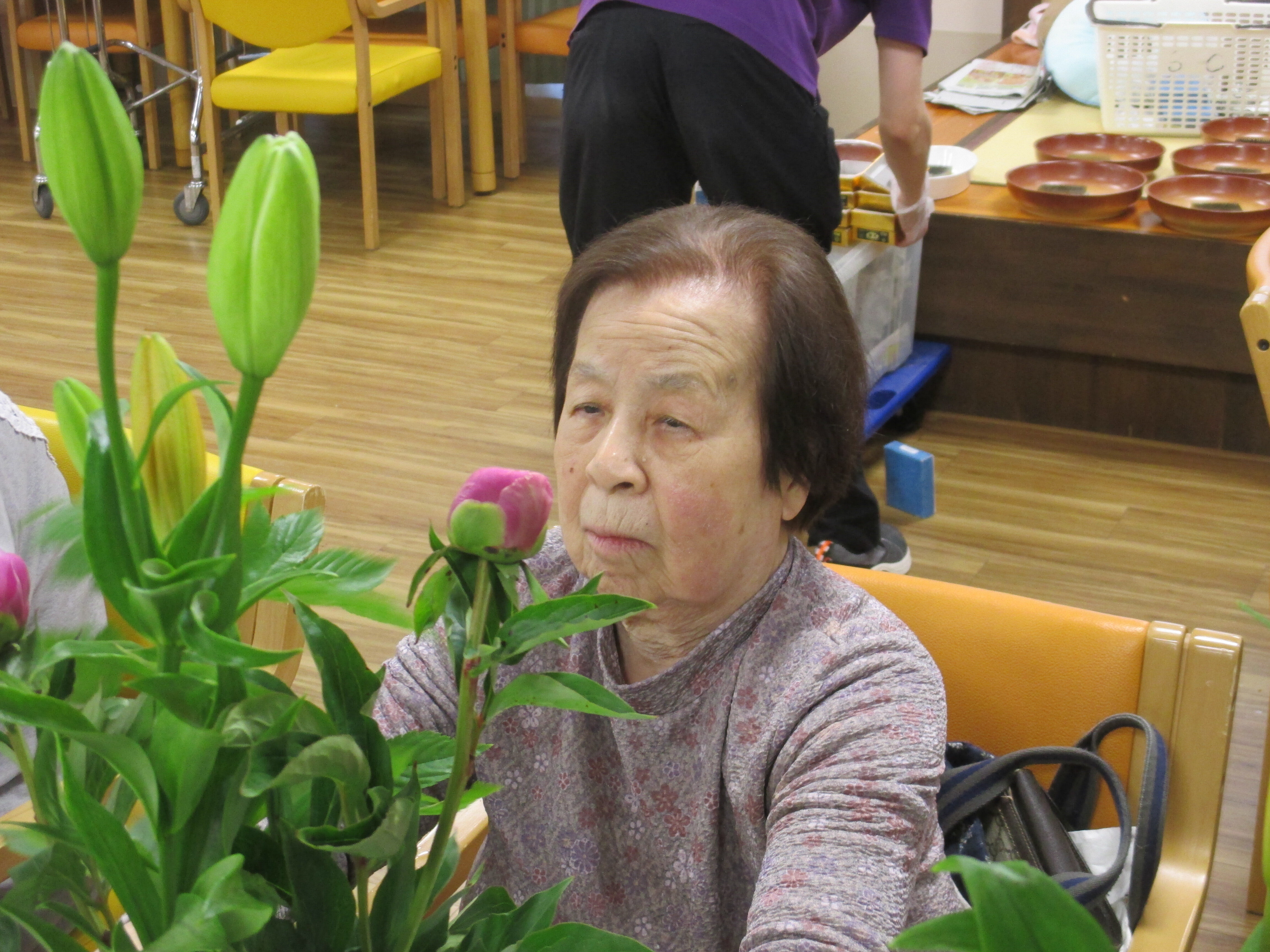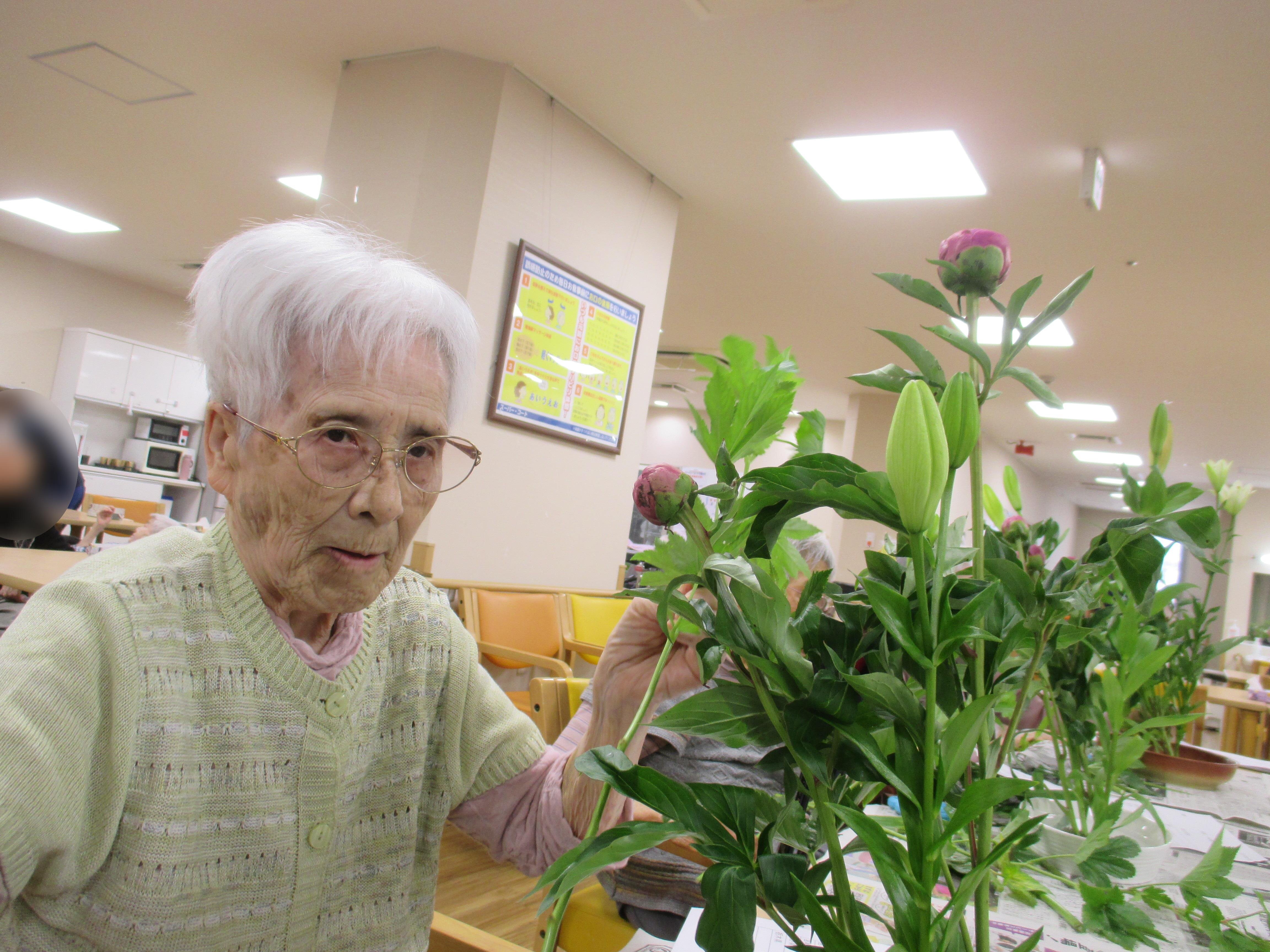 今回の生け花は座っているご入所者よりも大きなひまわりが目立ちますねー!