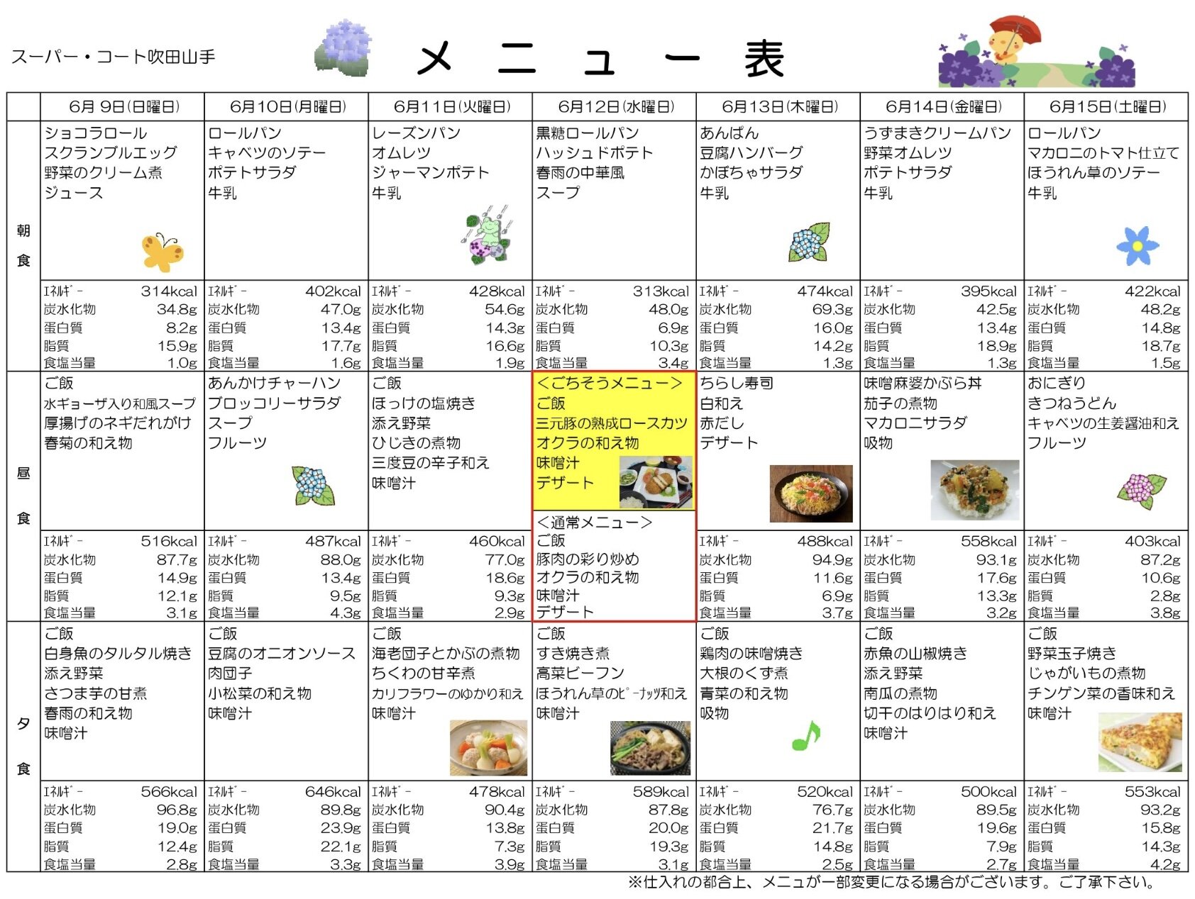 遅くなりましたが、6月9日からのお食事メニューを紹介します♪
