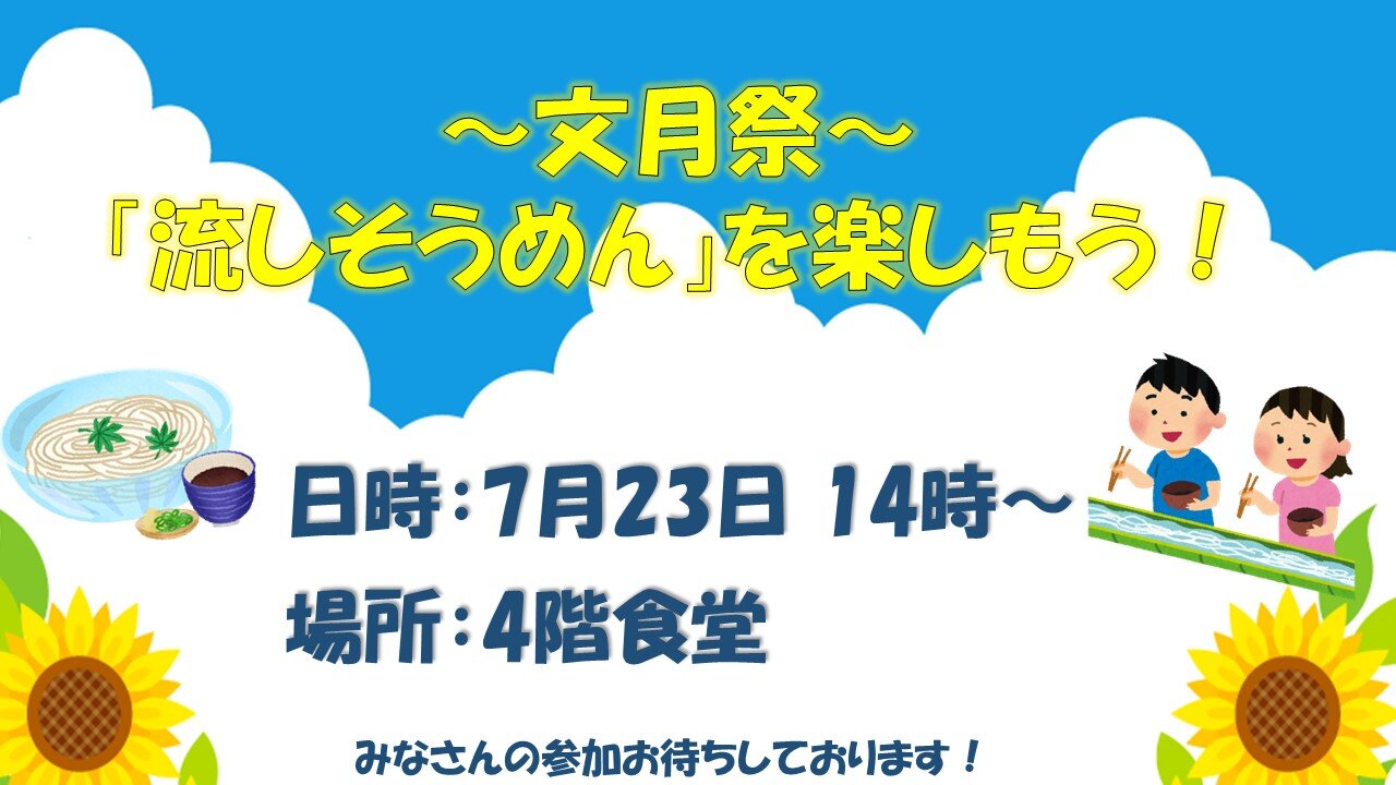 夏らしく、「流しそうめん」を提供させていただく予定です♪