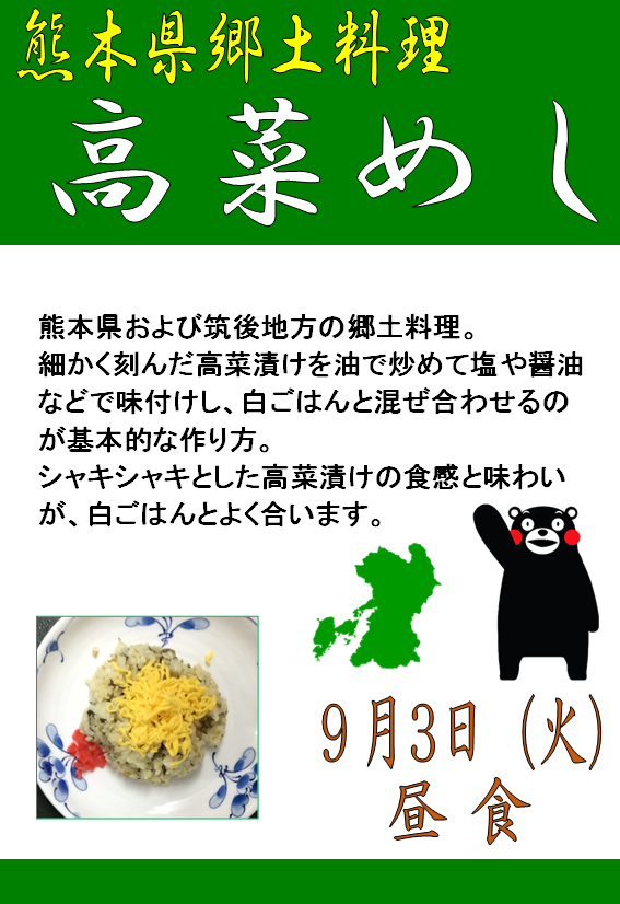 3日(火)には熊本県郷土料理「高菜めし」を提供させていただきます♪