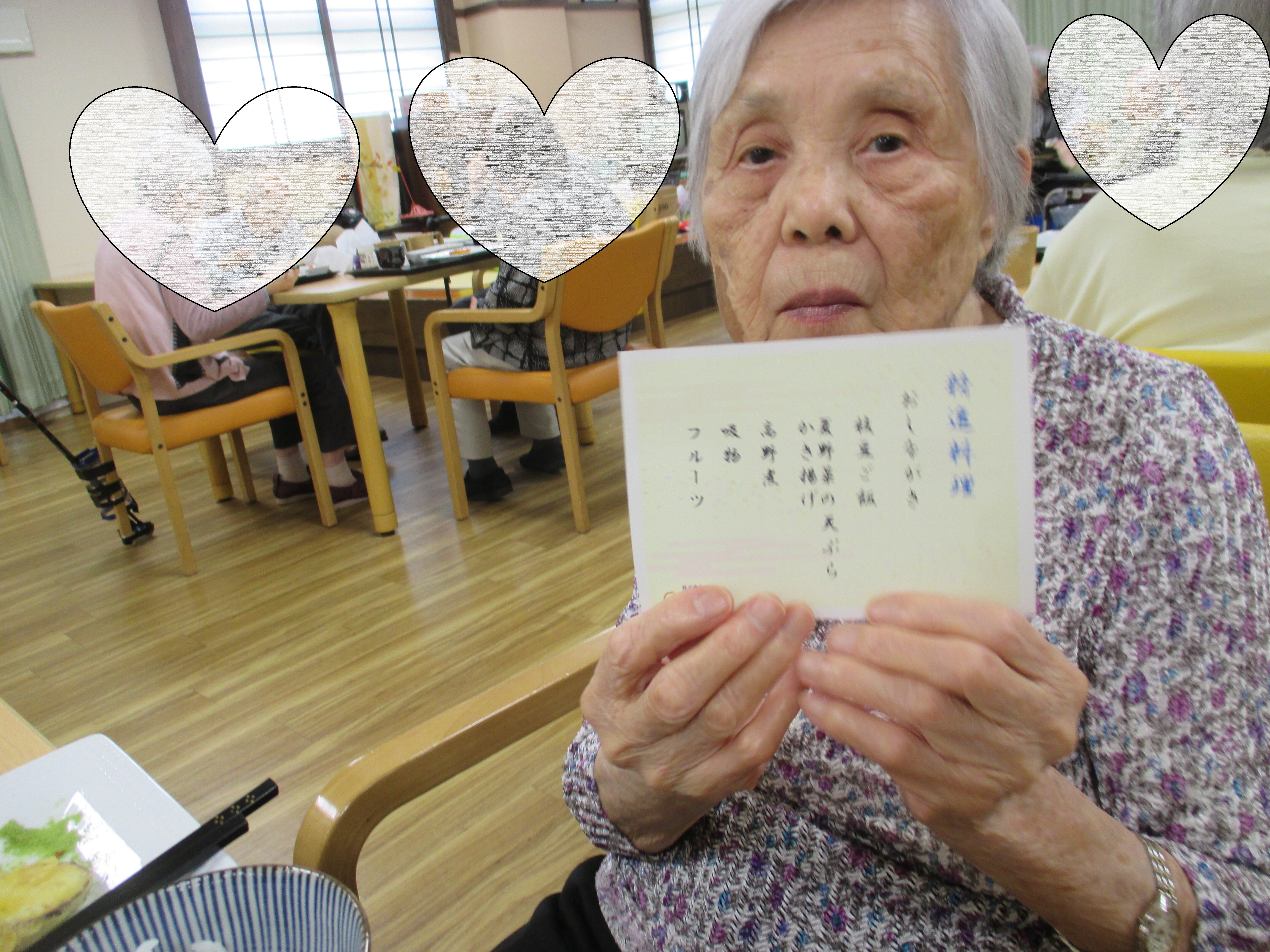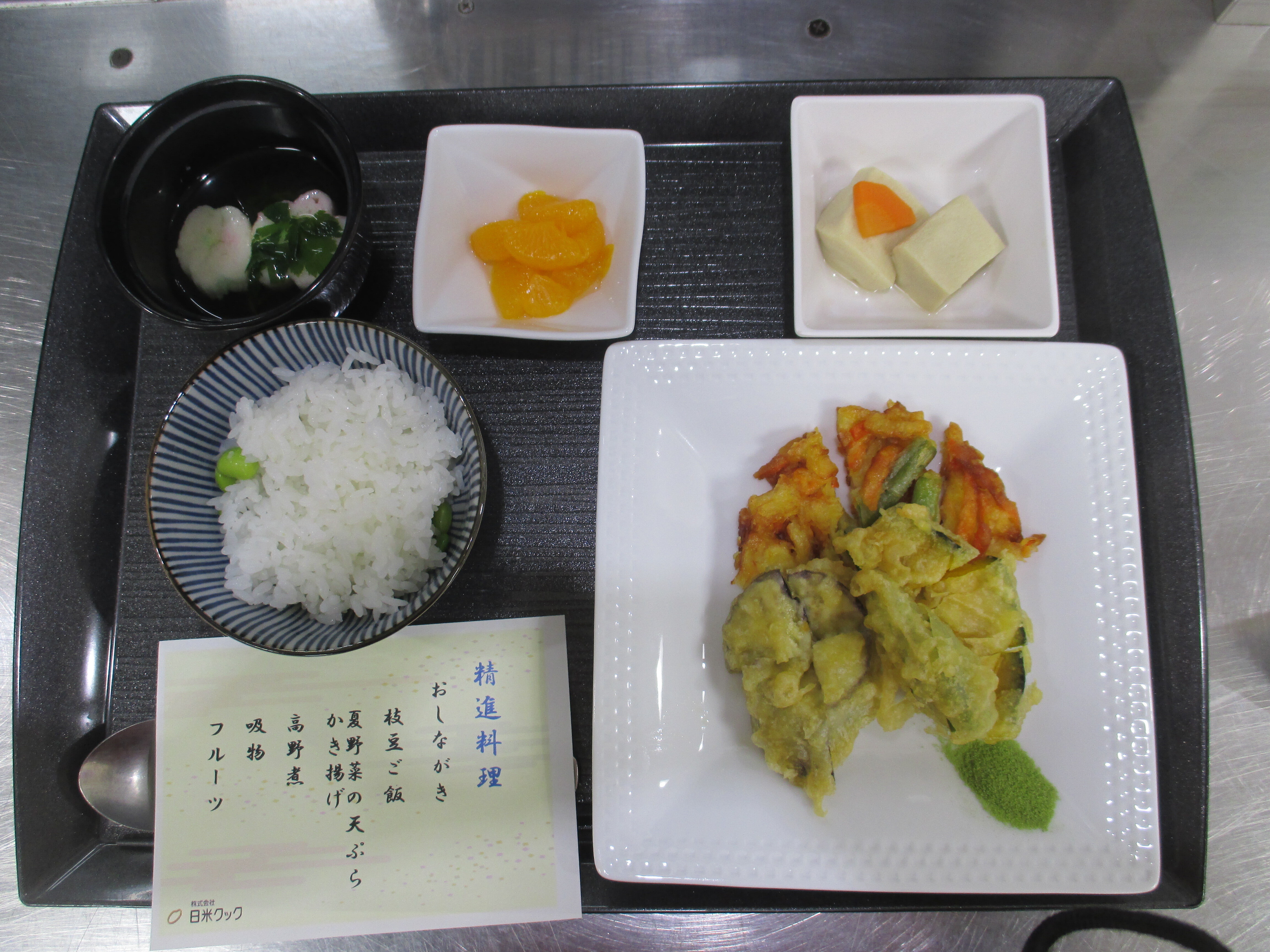 ♪♪♪今回のメニューは枝豆ご飯、夏野菜の天ぷら/かき揚げの抹茶塩添え、高野煮、吸い物、フルーツです。♪♪♪