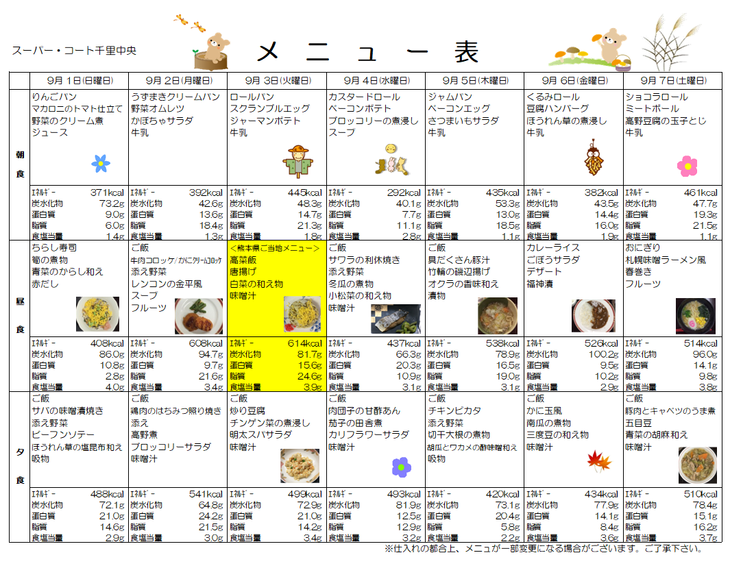 9月1日(日)~7日(土)までのお食事メニューをご紹介します!
