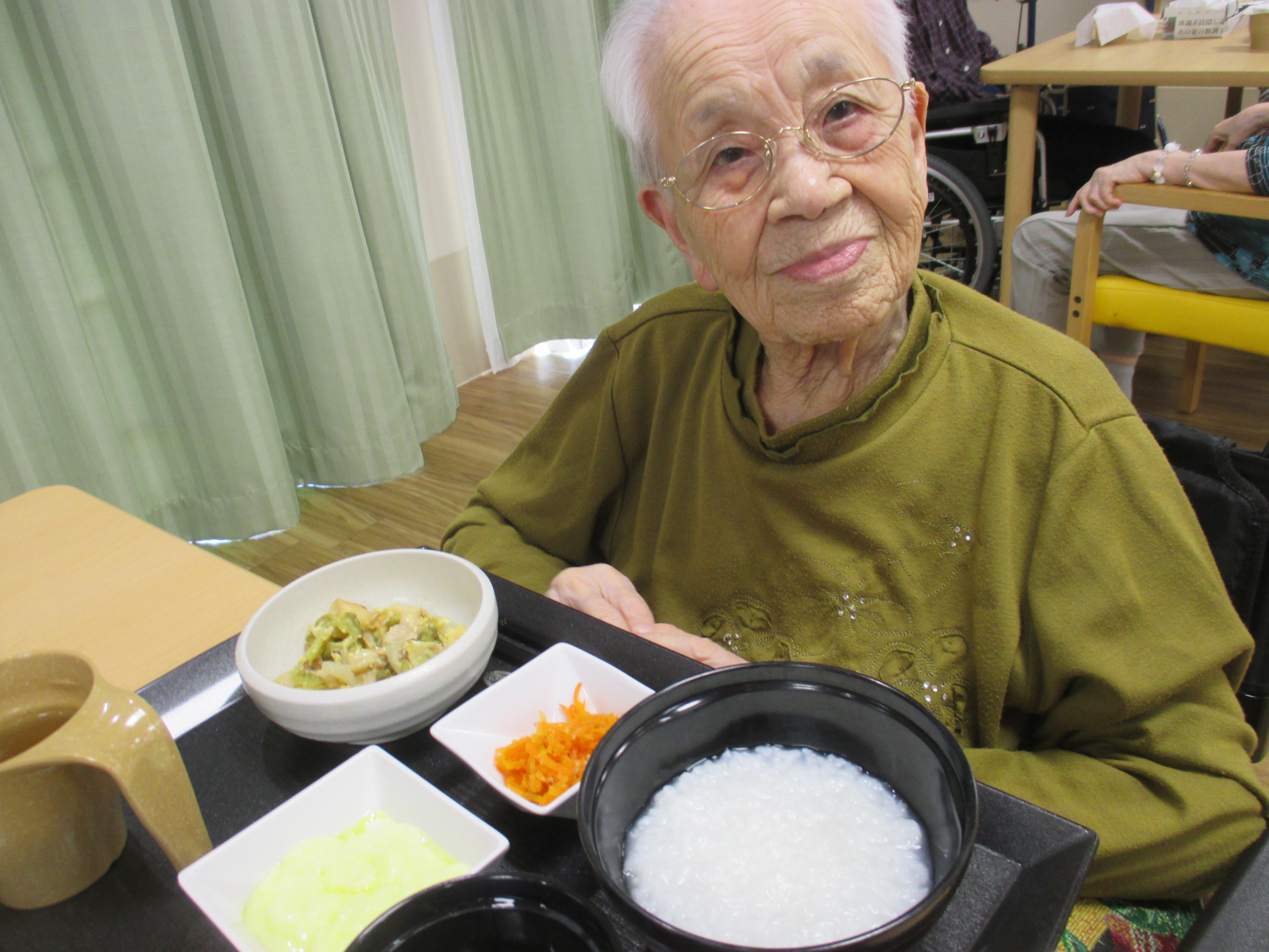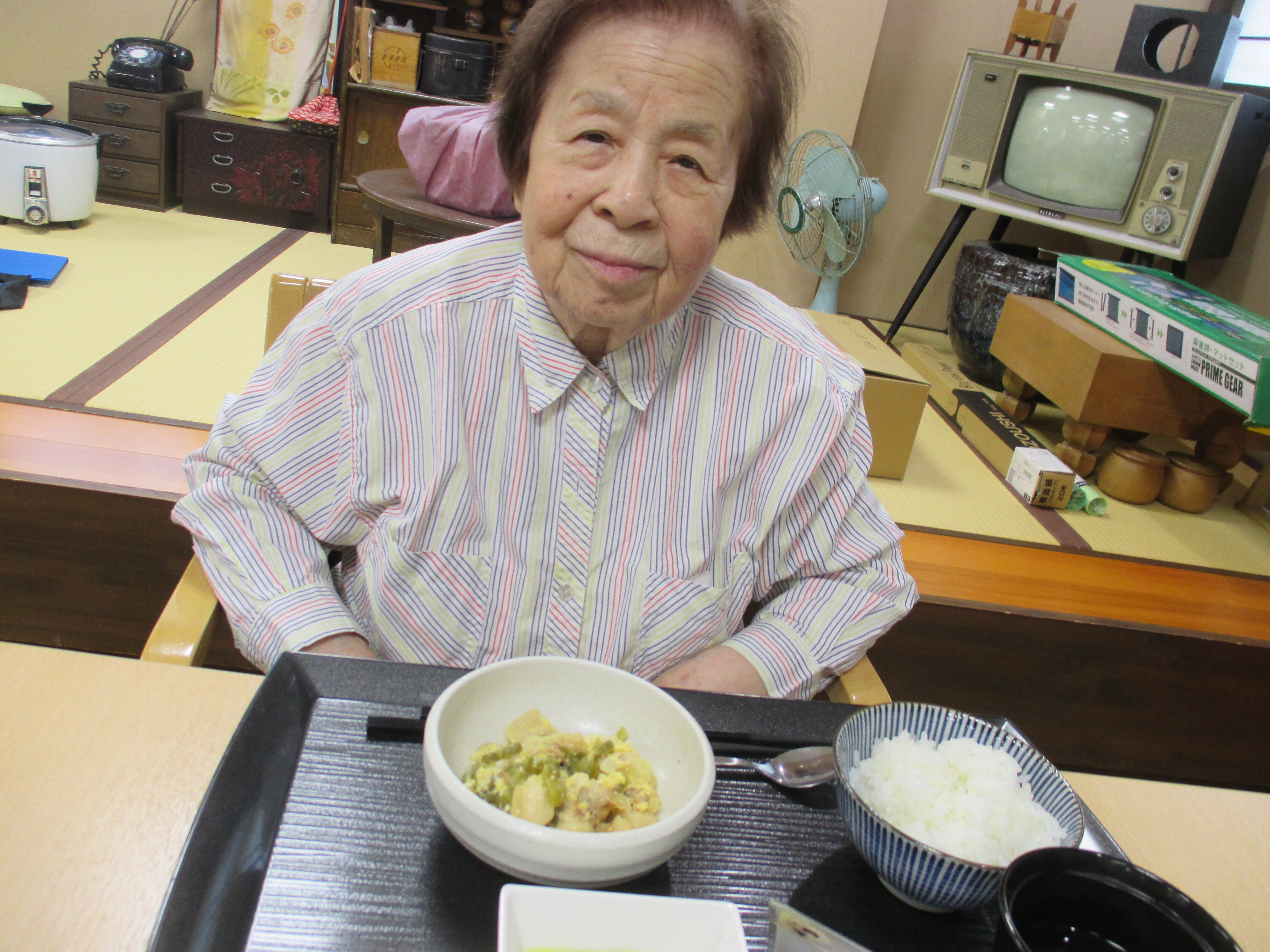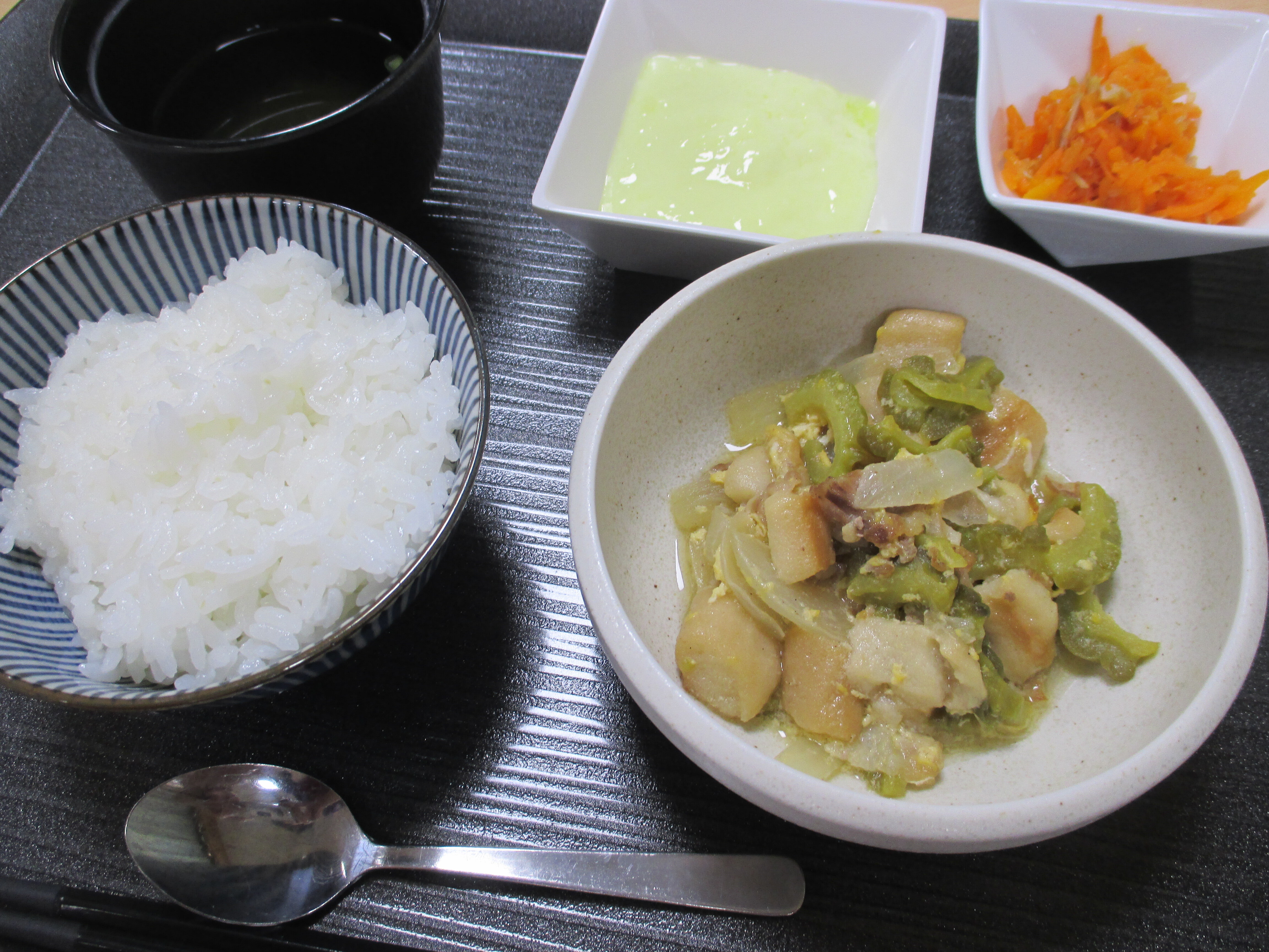 本日は8日に提供させていただいた沖縄県の郷土料理「ゴーヤチャンプルー」の昼食時ご様子をお見せいたします。