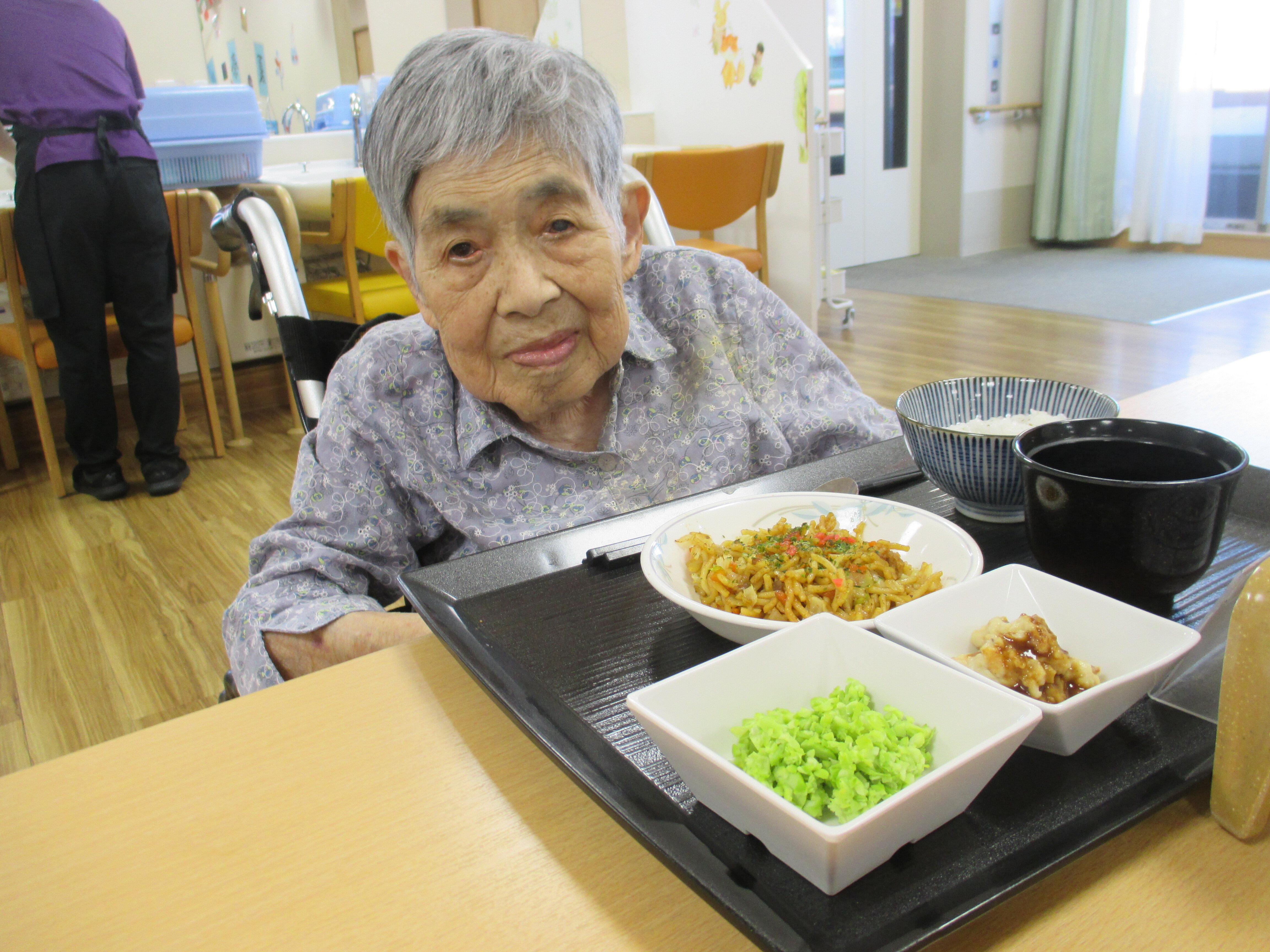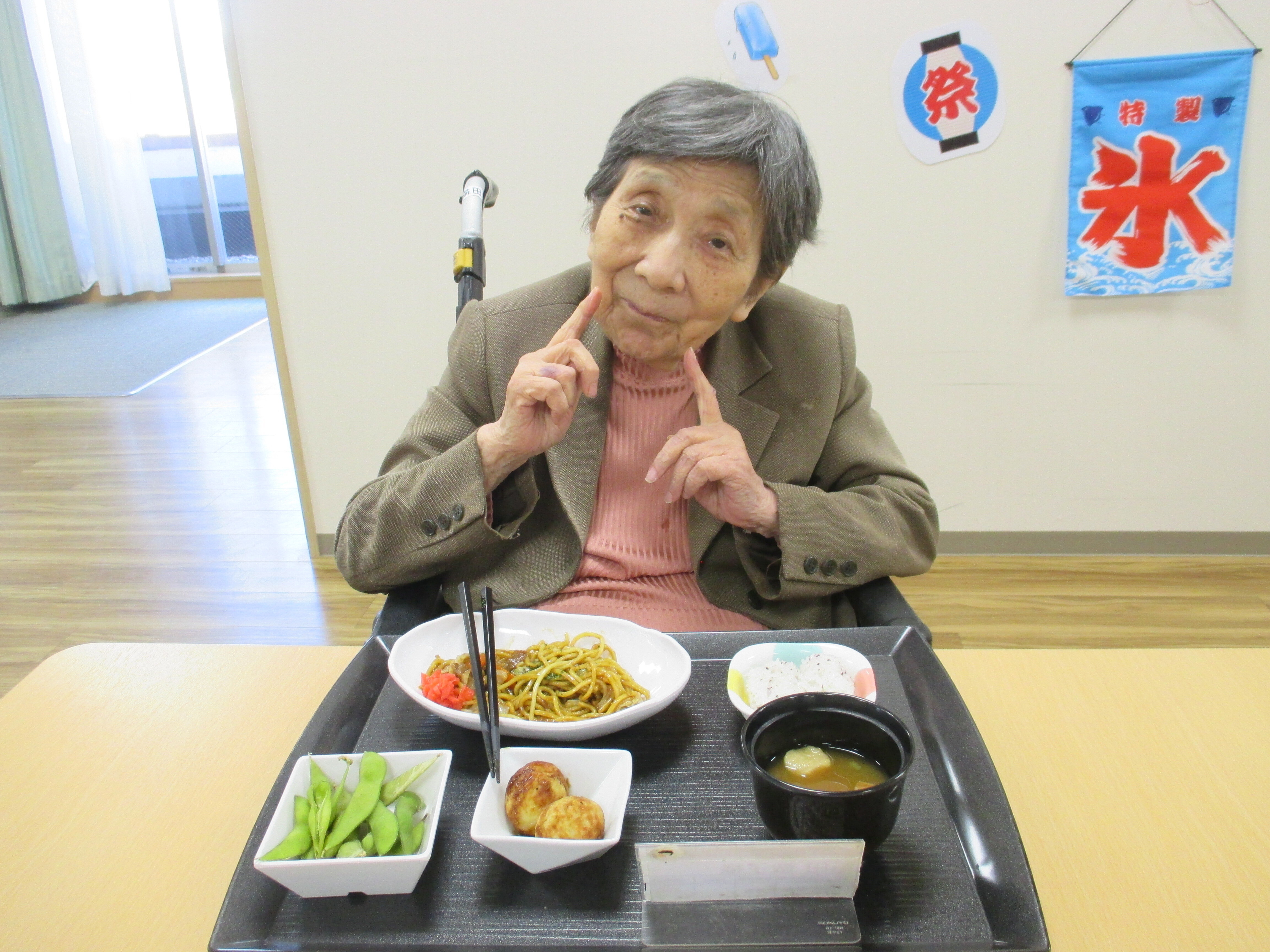 「焼きそば、たこ焼き、枝豆、おにぎり、味噌汁」と夏祭りを意識したメニューとなっております!