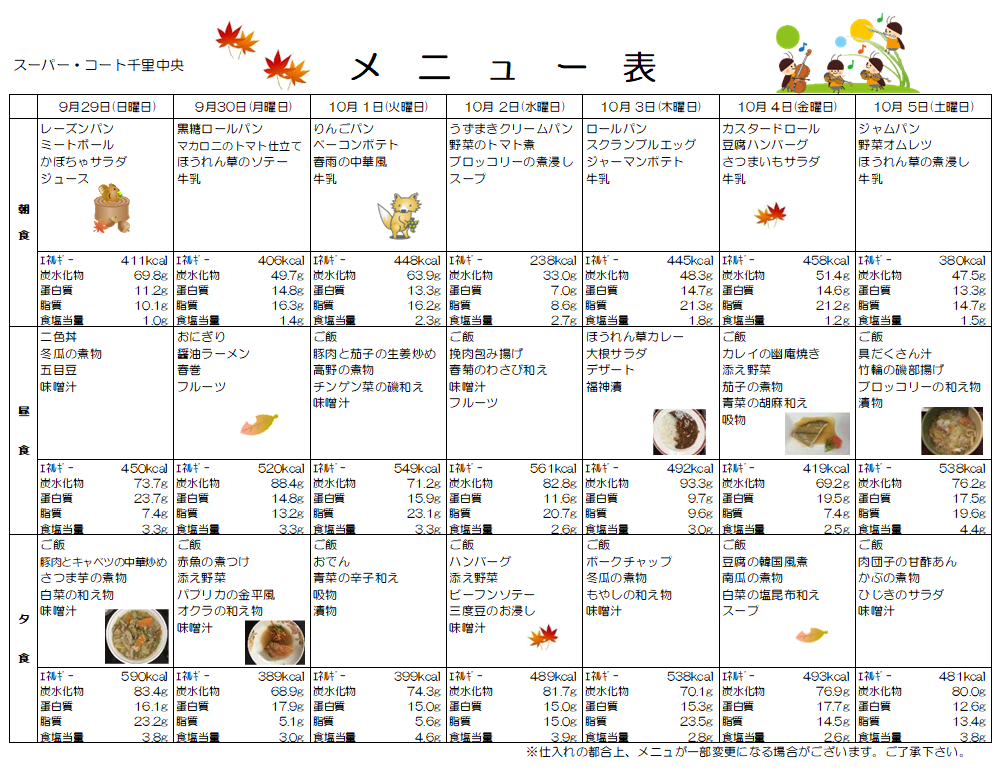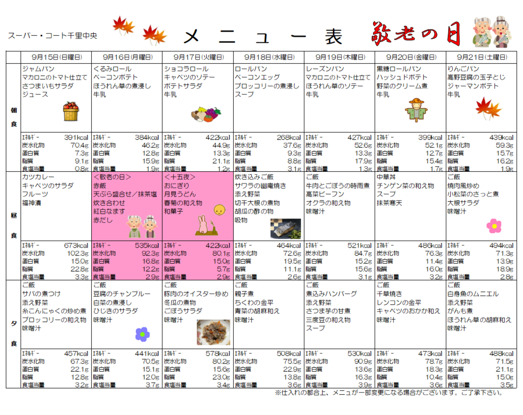 9月15日(日)~21日(土)までのお食事メニューをご紹介します!