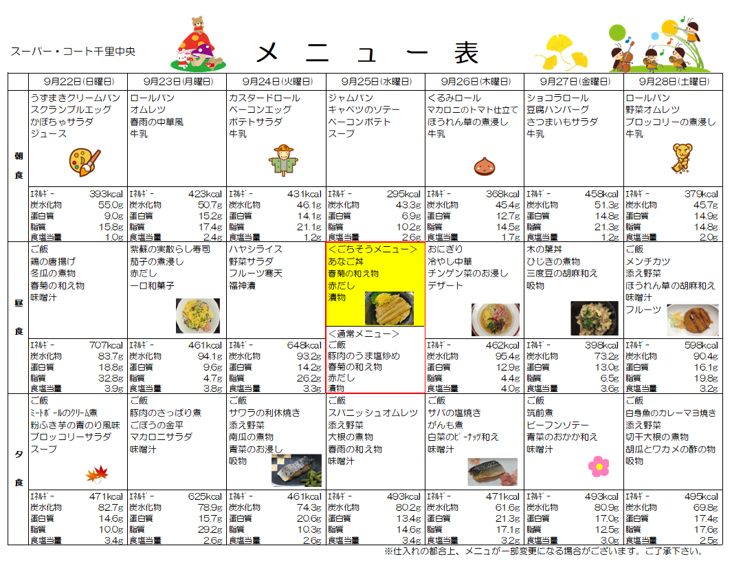 9月22日(日)~28日(土)までのお食事メニューをご紹介します!