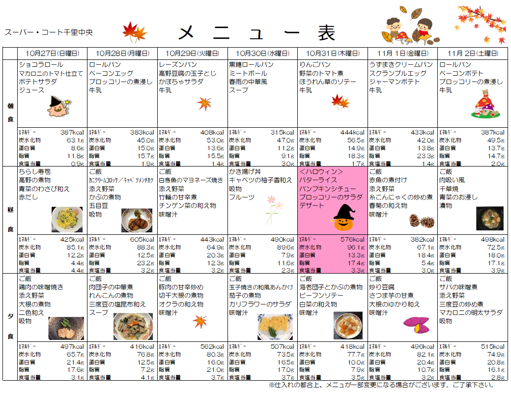 10月27日(日)~11月2日(土)までのお食事メニューをご紹介します!