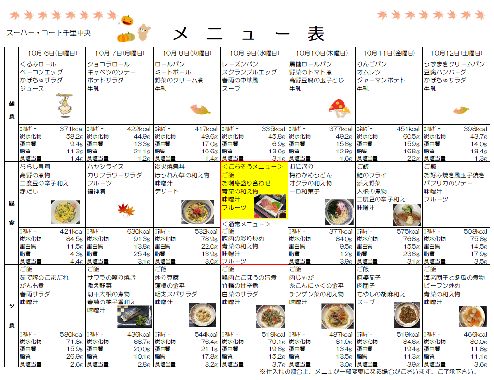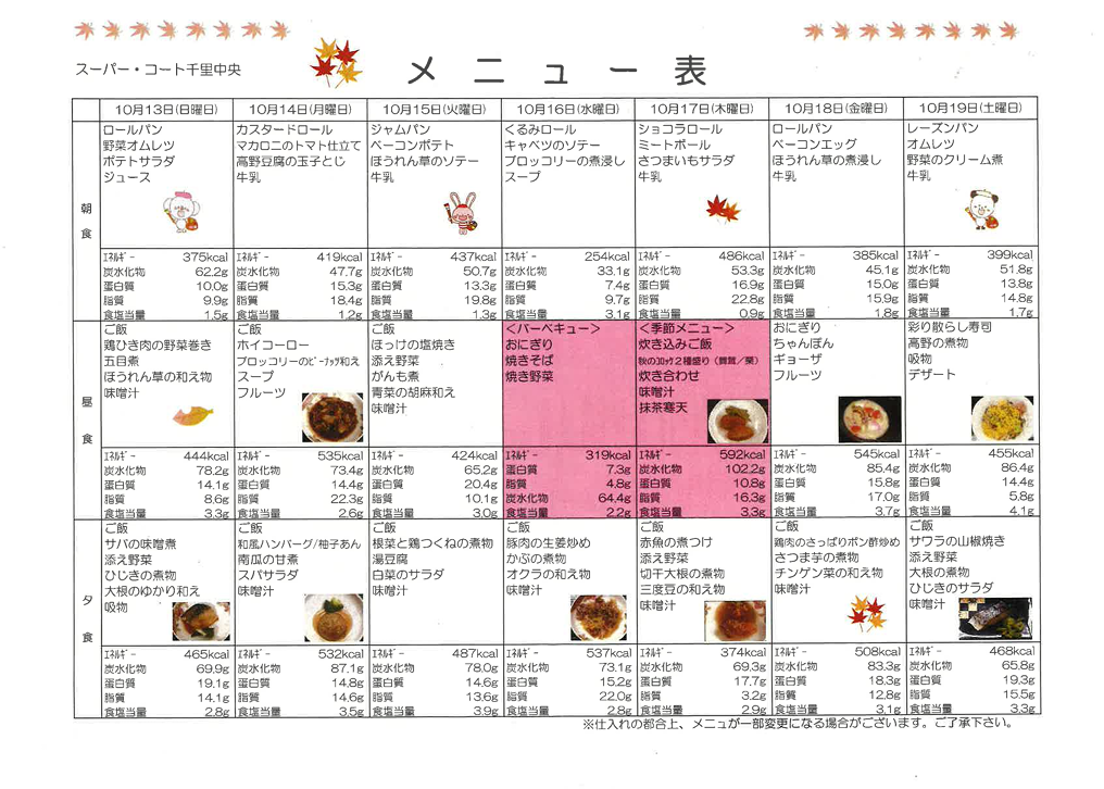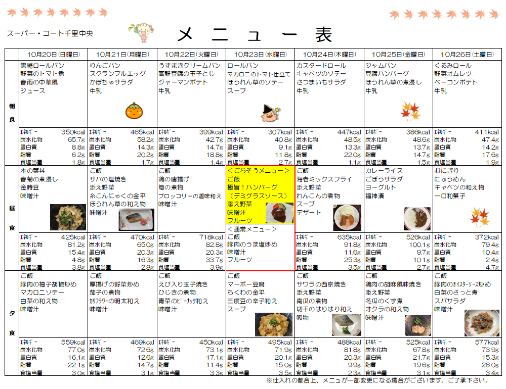 10/13(日)~10/19(土)のお食事メニューをご紹介します!