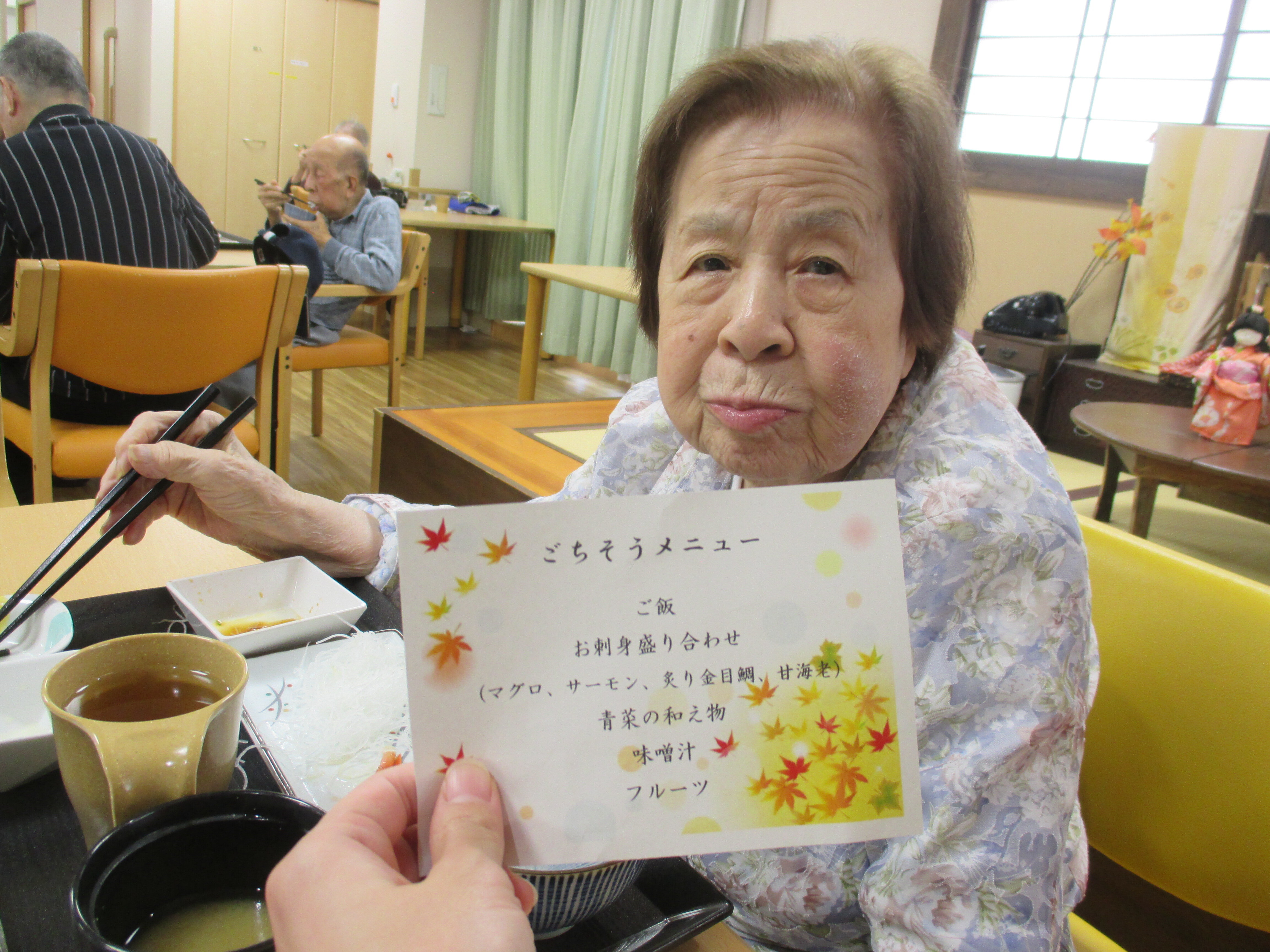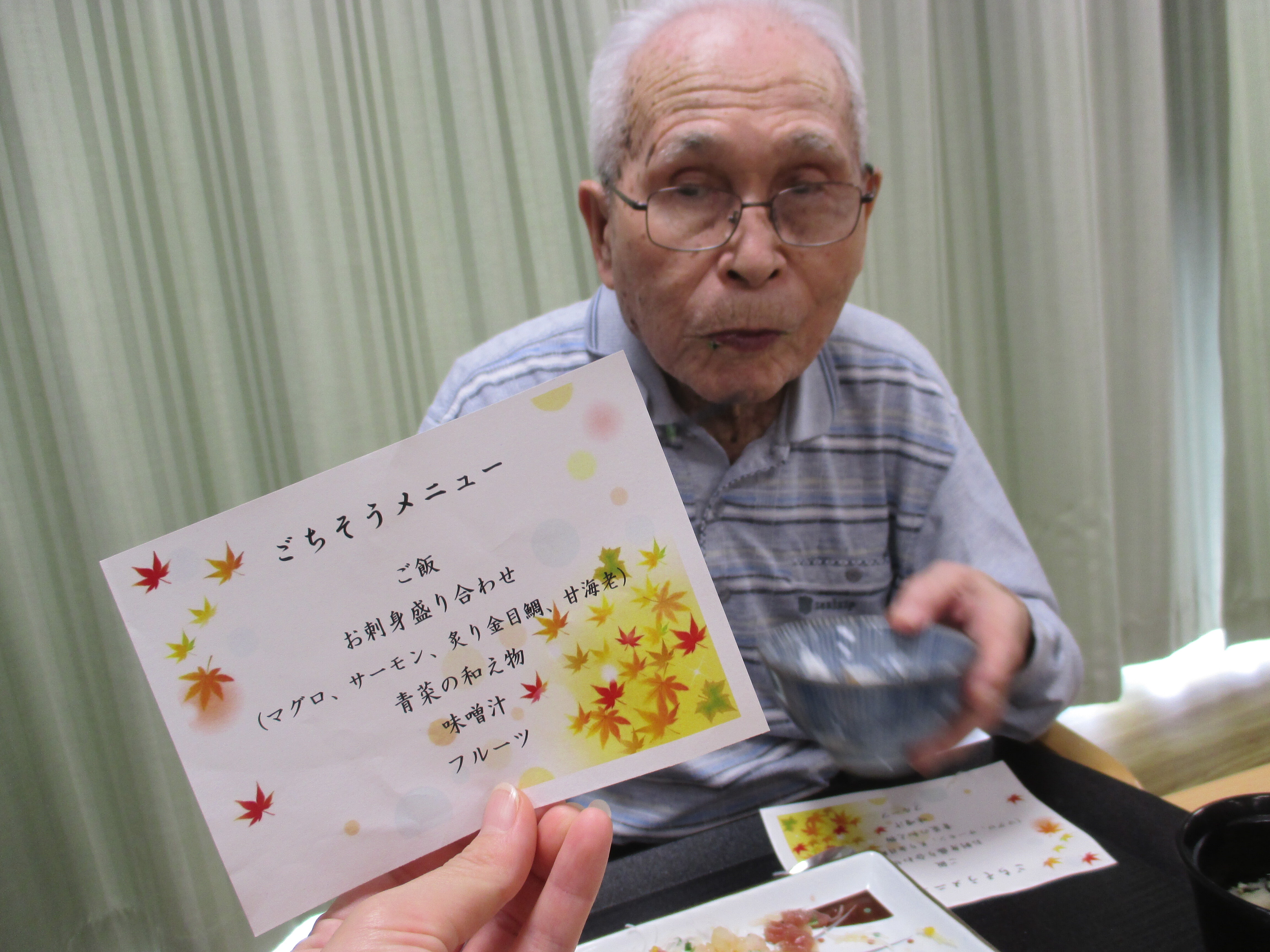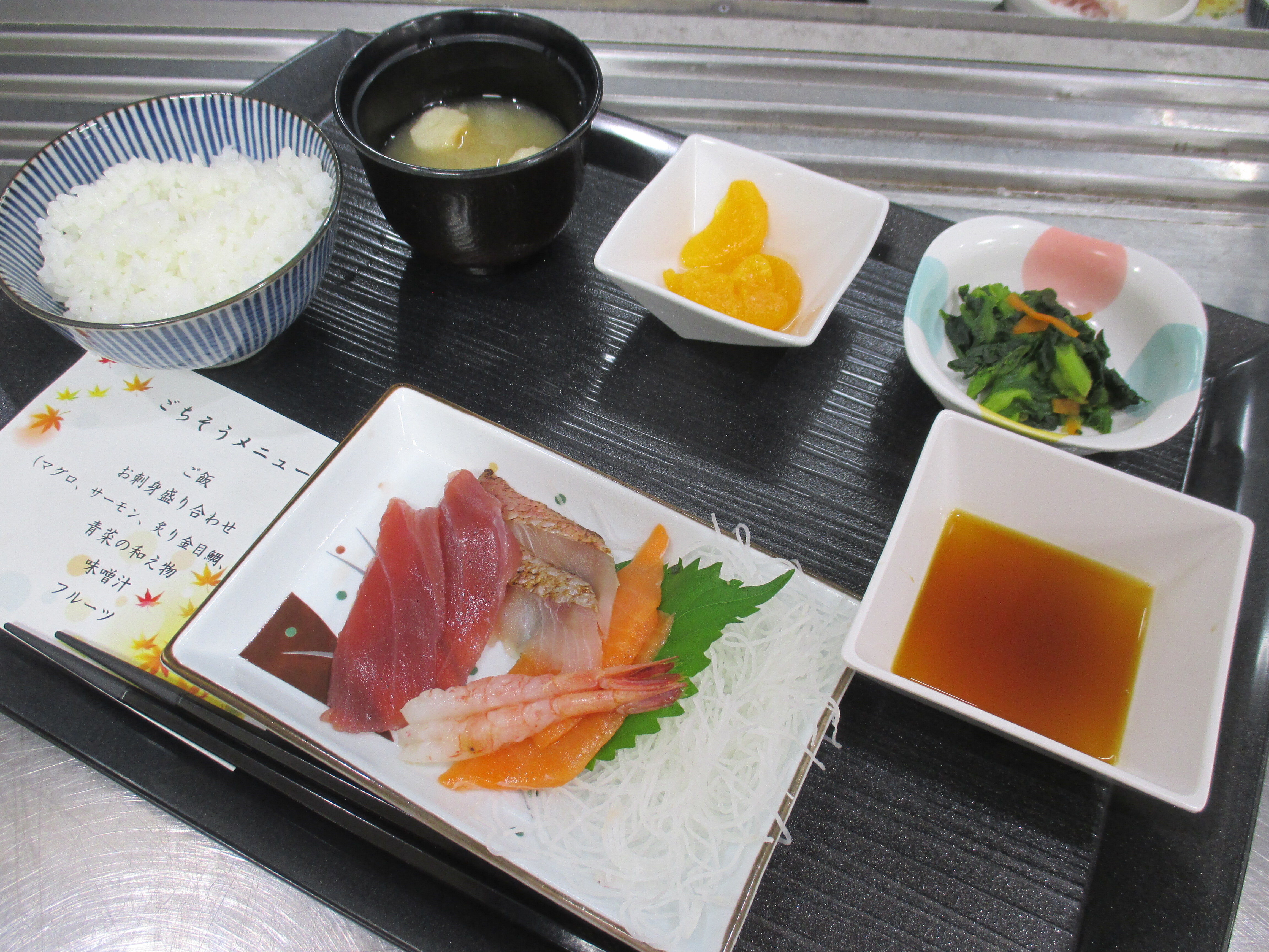 今回は10月9日(水)にご提供したごちそうメニュー「お刺身盛り合わせ」のご様子をお伝え(^O^)/