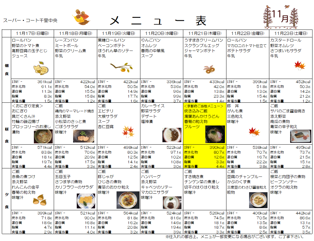11月17日(日)~23日(土)までのお食事メニューをご紹介します!
