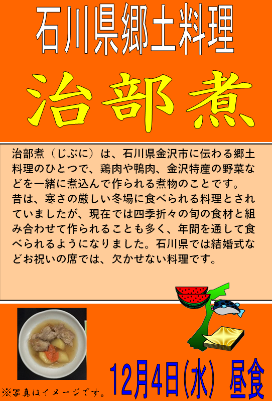 4日(水)には石川県の郷土料理「治部煮」をご提供します♪