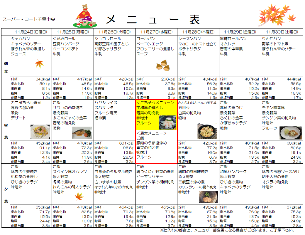 11月24日(日)~30日(土)までのお食事メニューをご紹介します。