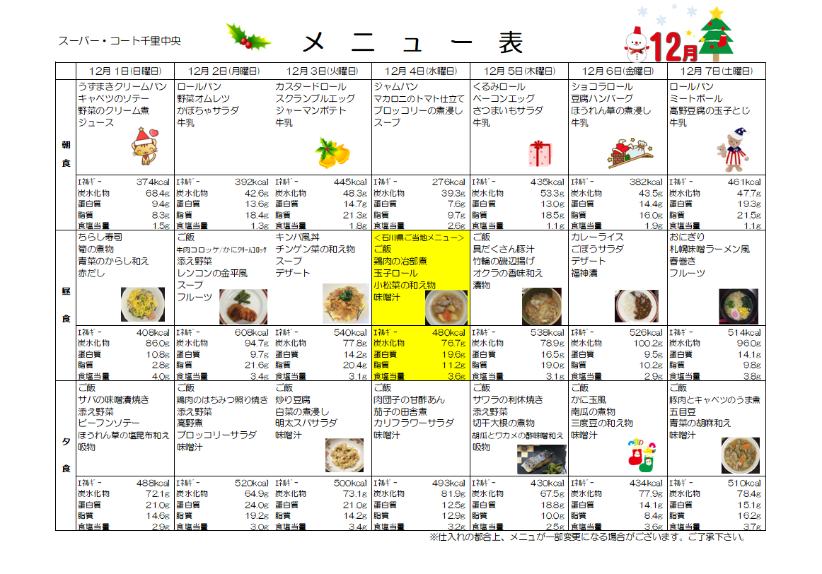 12月1日(日)~7日(土)までのお食事メニューのご紹介します。