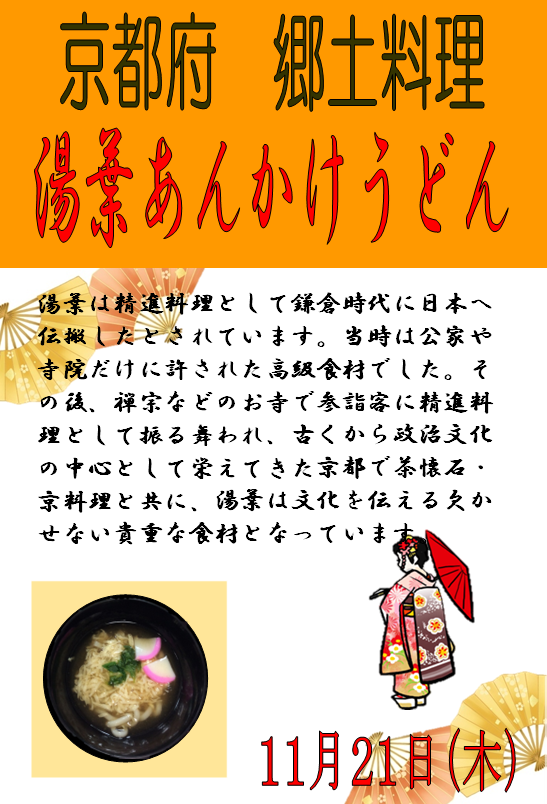 21日(木)には京都府の郷土料理「湯葉あんかけうどん」をご提供します♪
