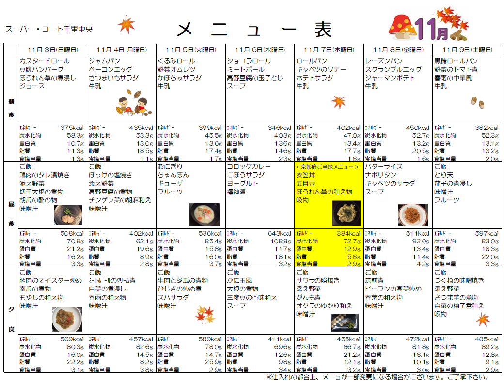 11月3日(日)~9日(土)までのお食事メニューをご紹介します!