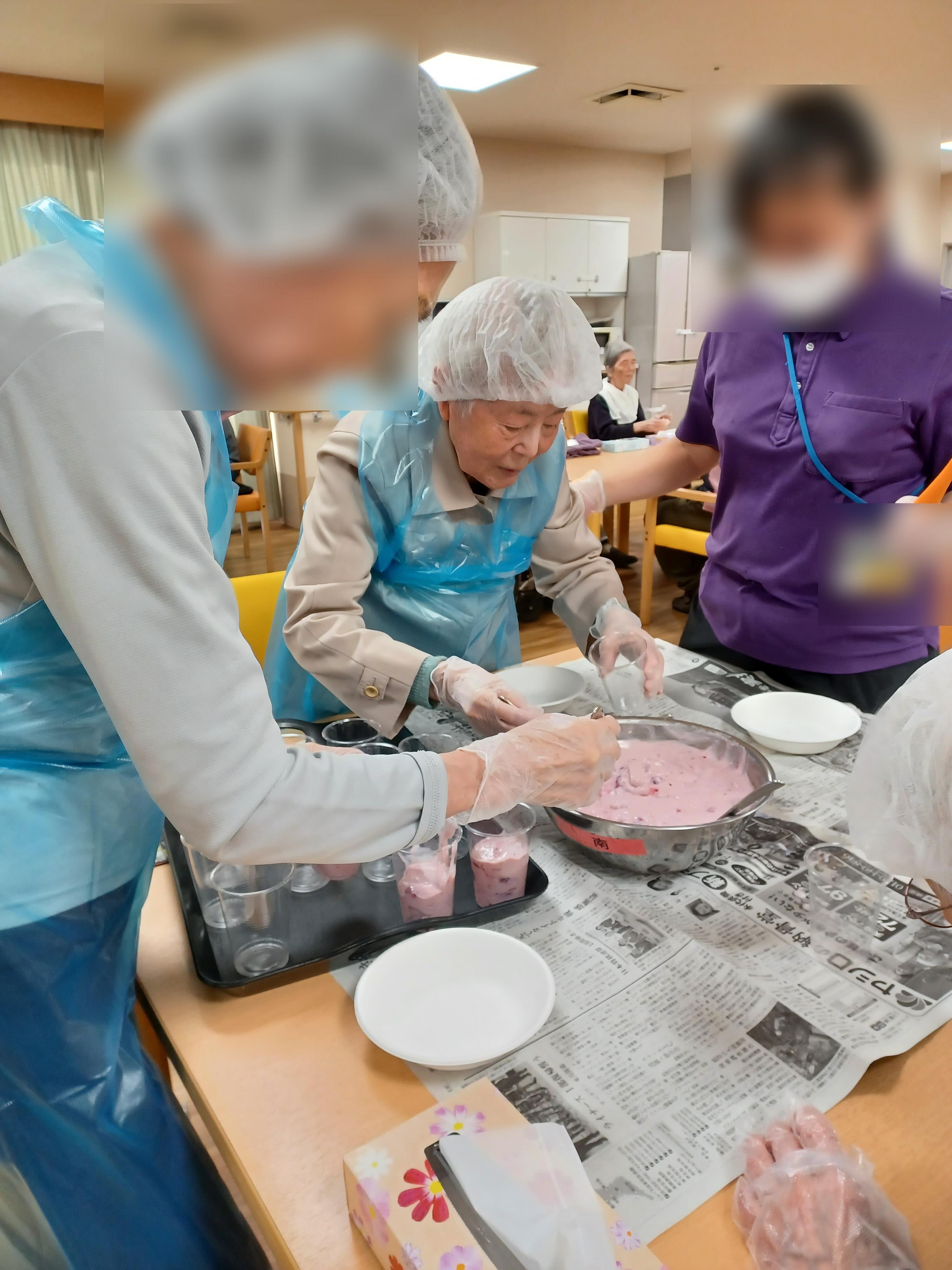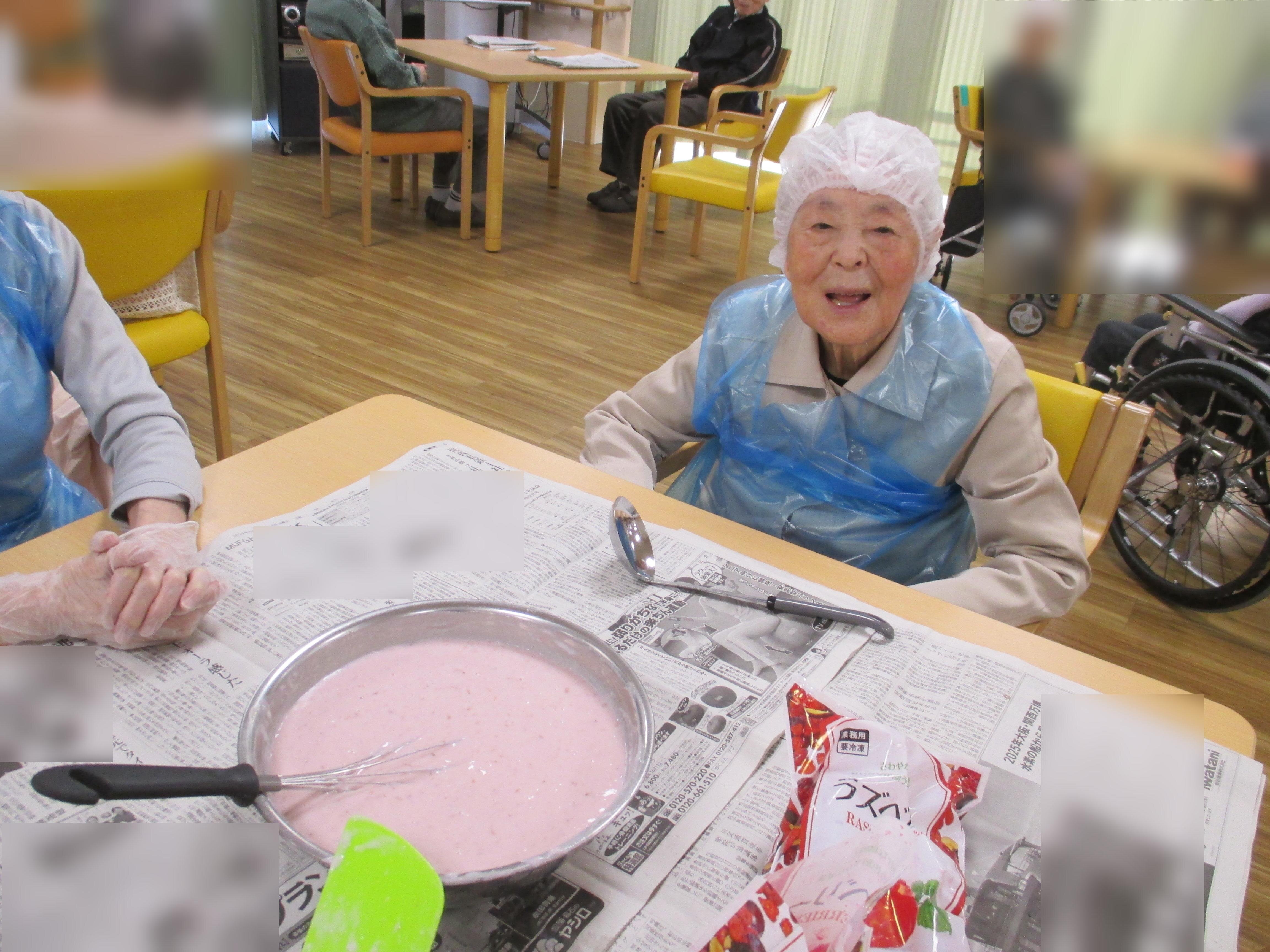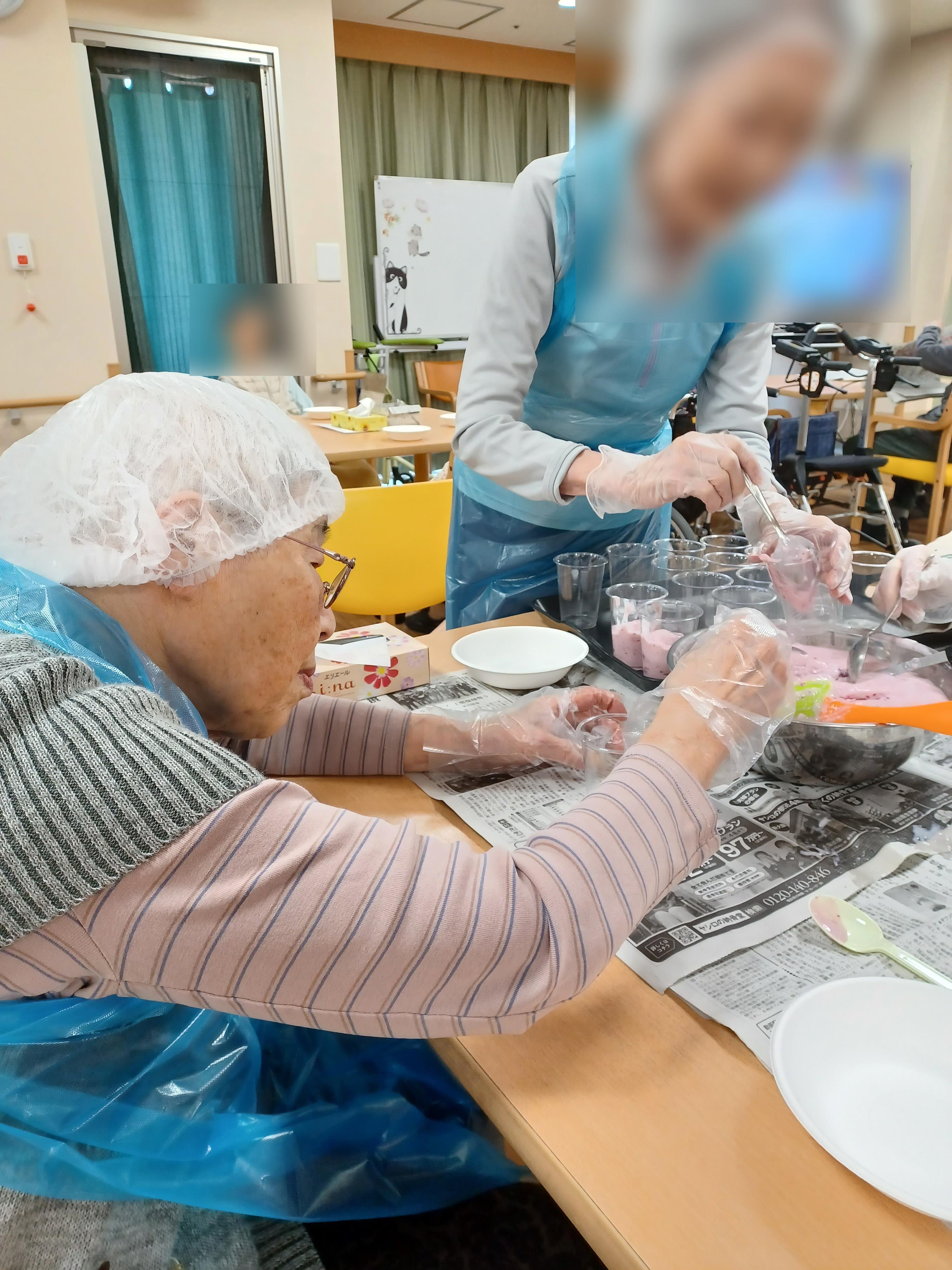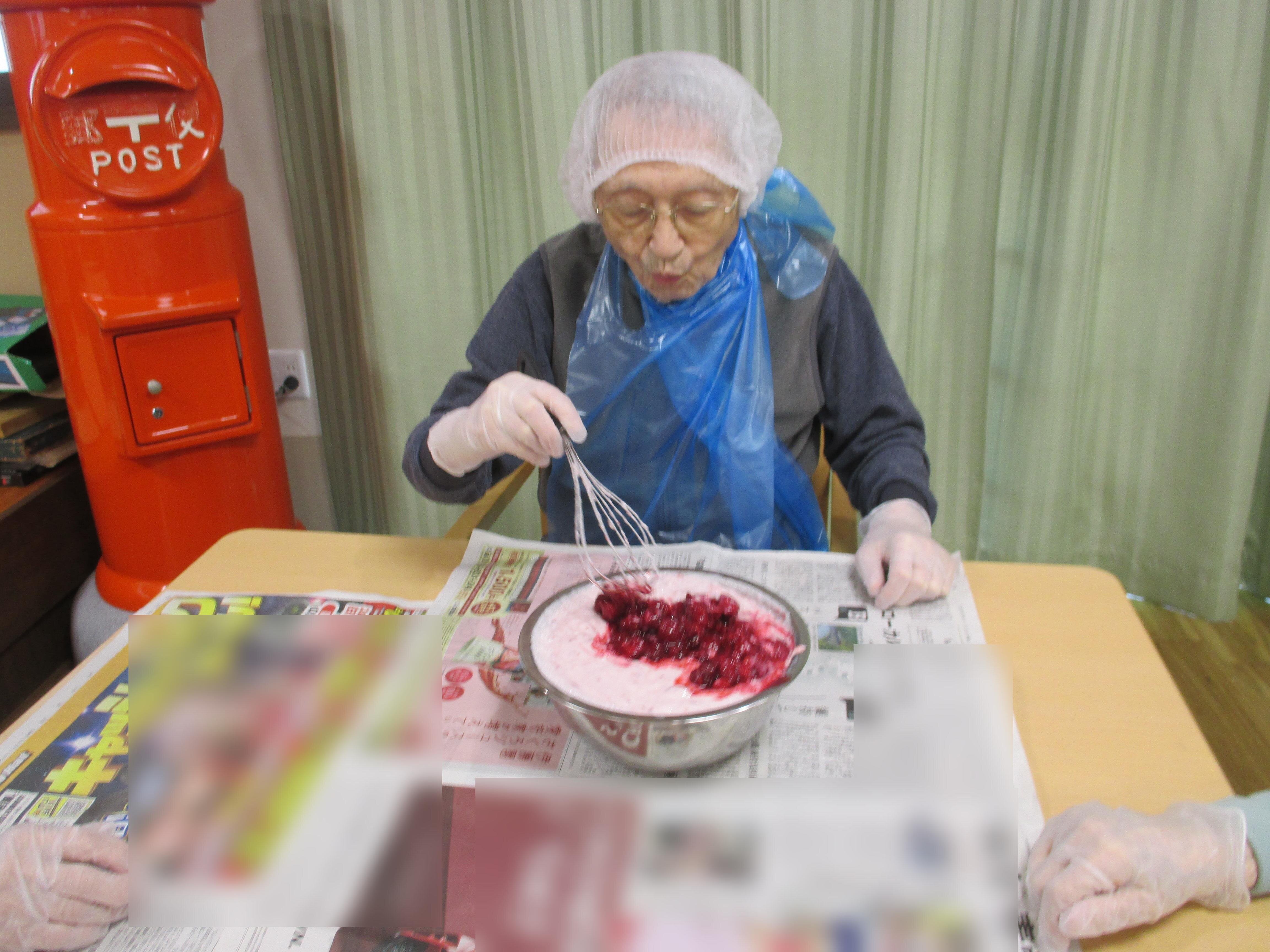 ご入居者のみなさまには、「フルーチェ作り」に参加して頂きました!