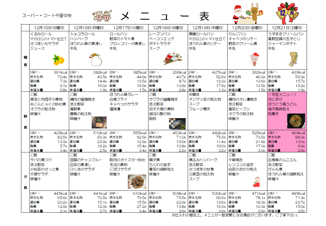12月15日(日)~21日(土)までのお食事メニューをご紹介します!