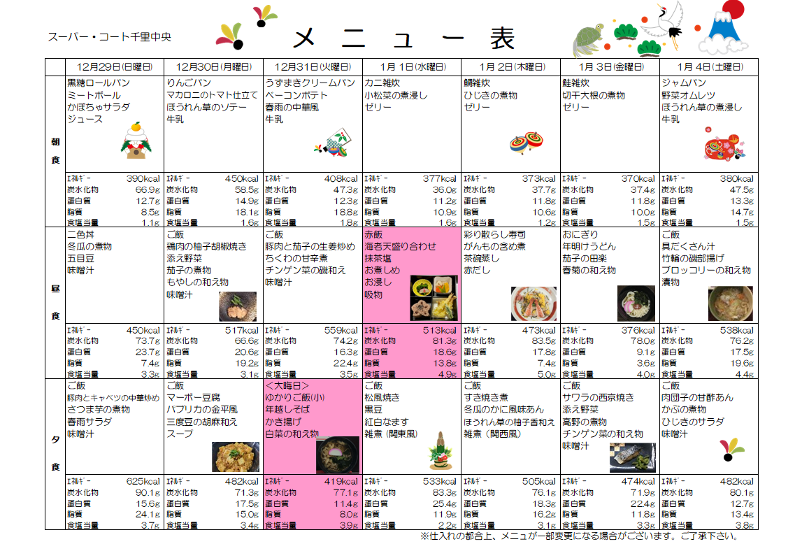 12月29日(日)~31日(火)、1月1日(水)~1月4日(土)のお食事メニューをご紹介します。